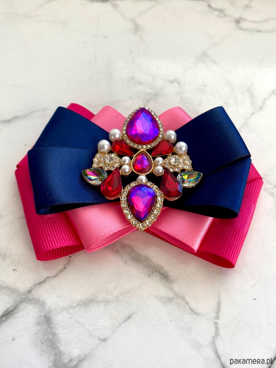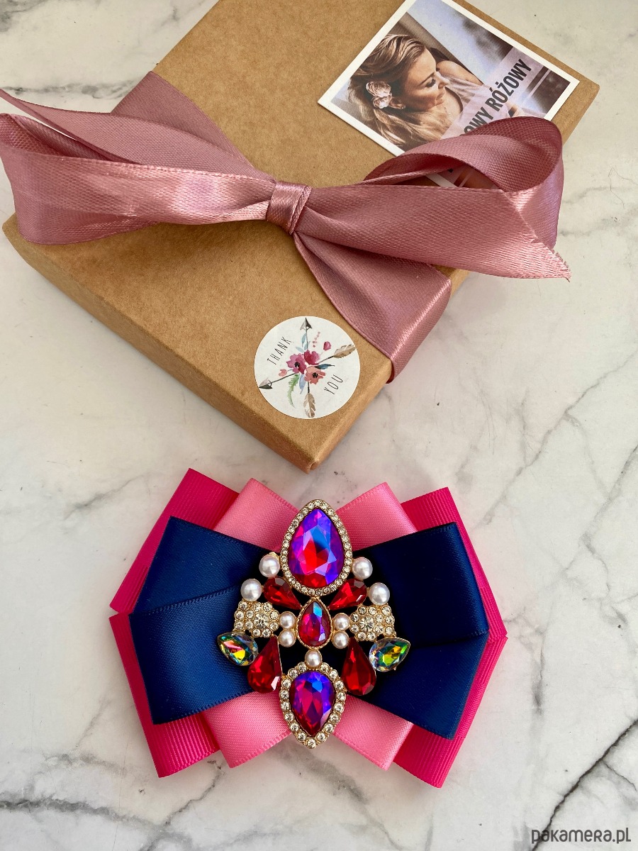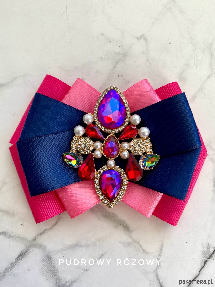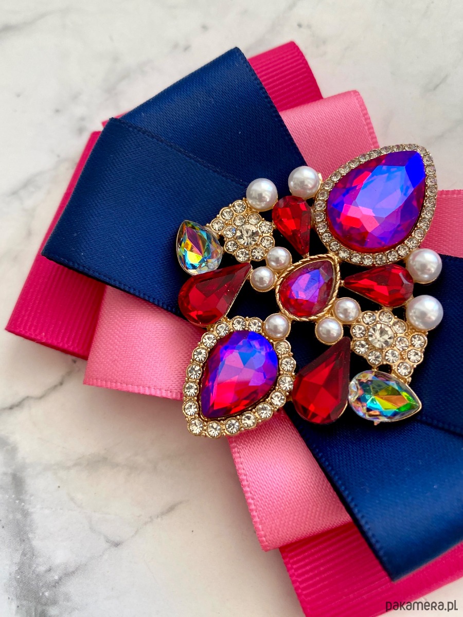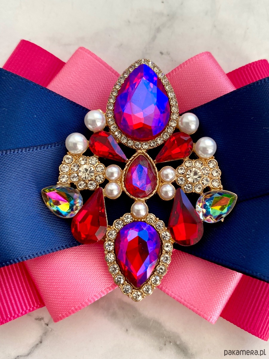 Na środku naszyta cudowna ozdoba biżuteryjna z kryształków w kolorze różowym kameleon który zmienia się w zależności od padania światła. Dodatkowo małe perełki, które nadają lekkości i kobiecości.