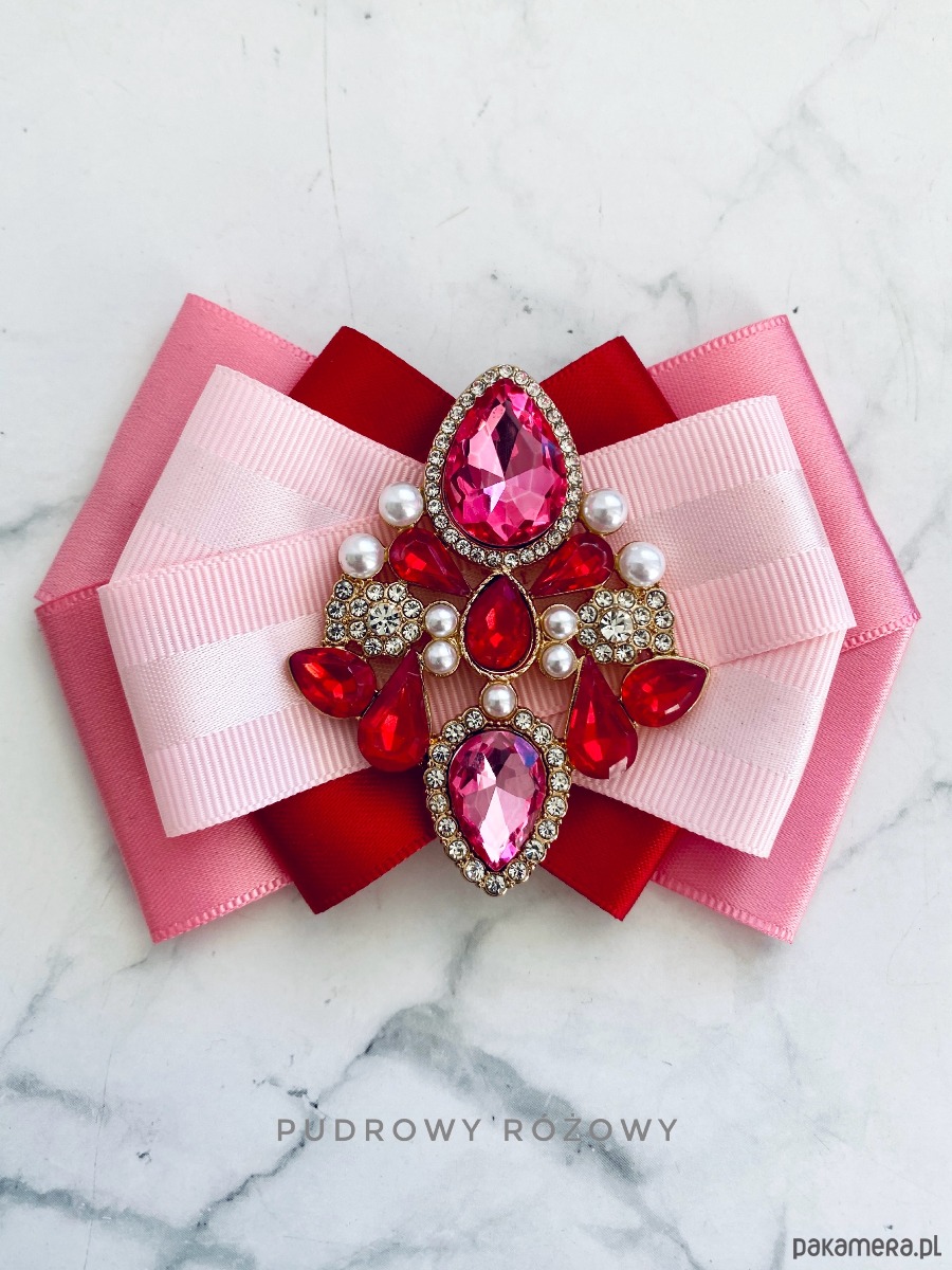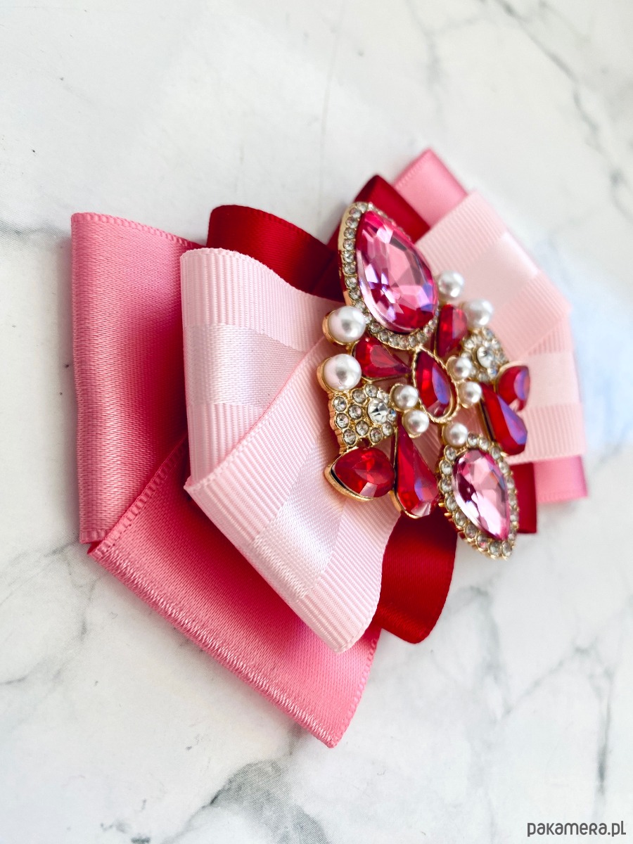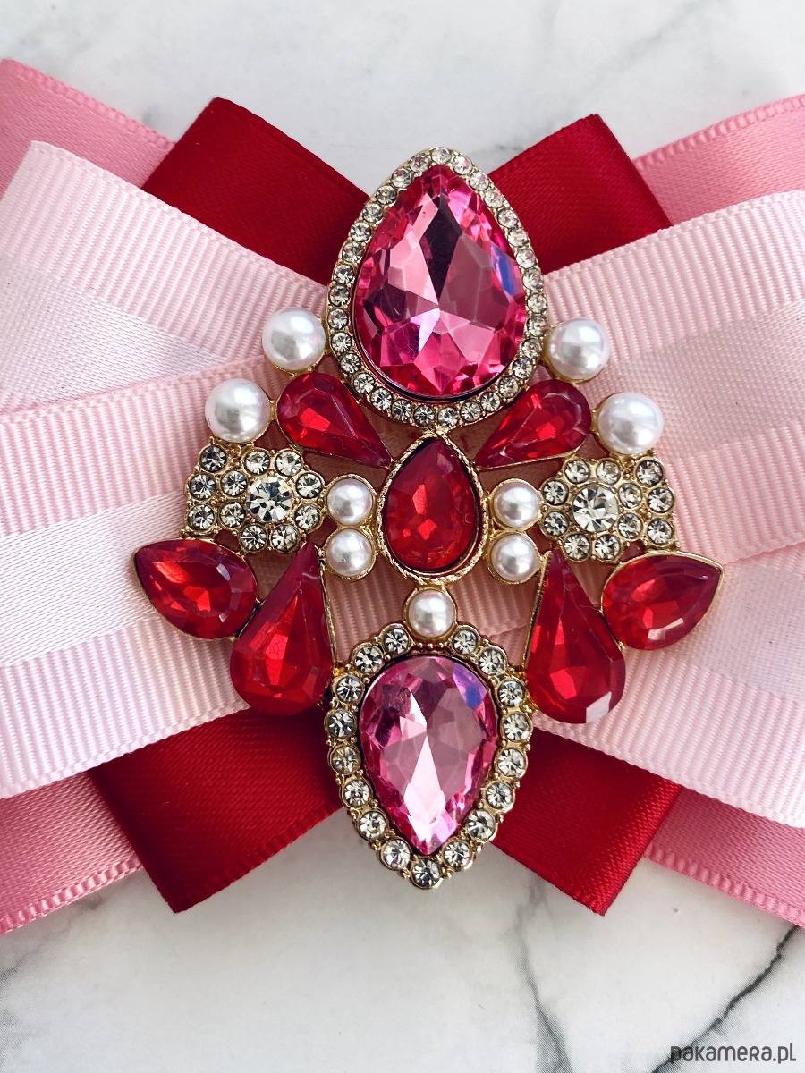 Na środku naszyta cudowna ozdoba biżuteryjna z kryształków w kolorze różowym. Dodatkowo małe perełki, które nadają lekkości i kobiecości.