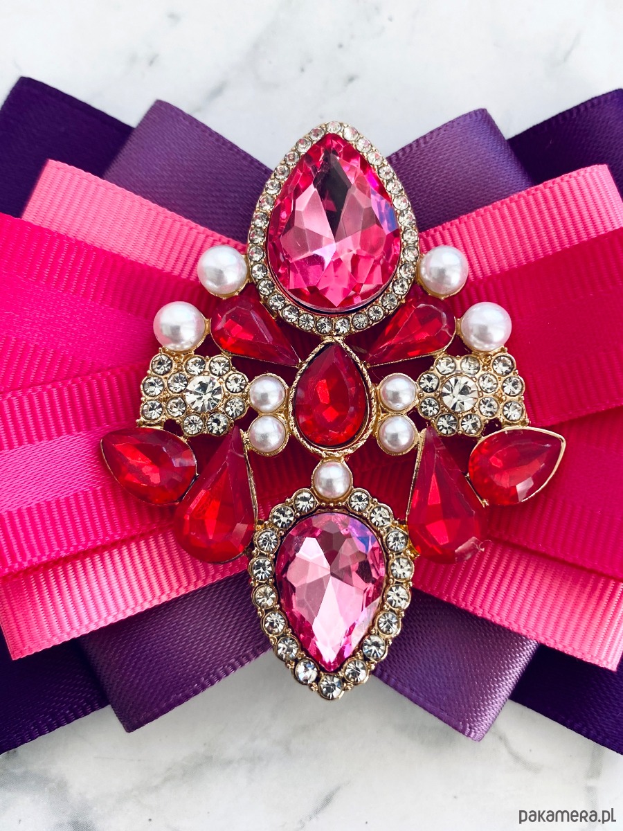 Na środku naszyta cudowna ozdoba biżuteryjna z kryształków w kolorze różowym. Dodatkowo małe perełki, które nadają lekkości i kobiecości.