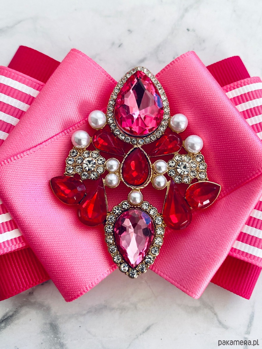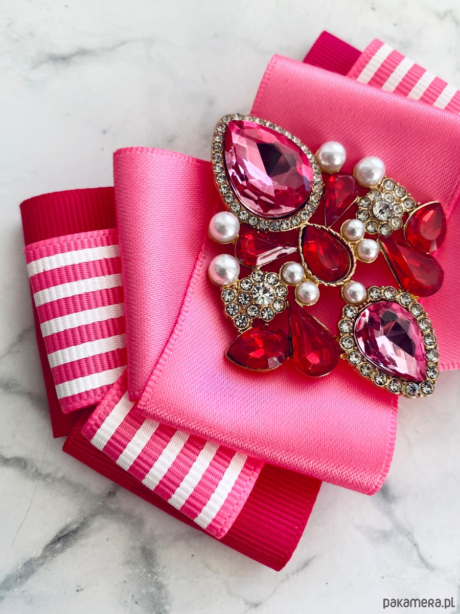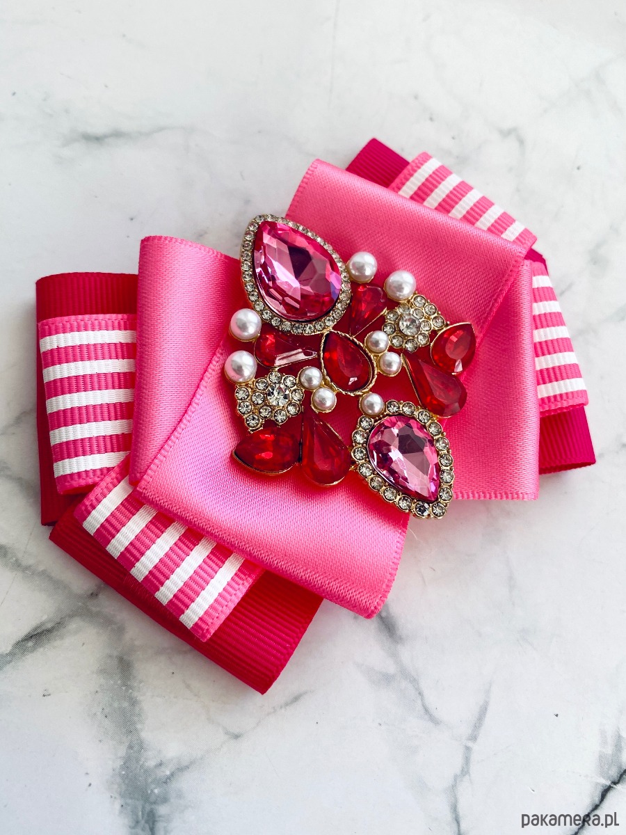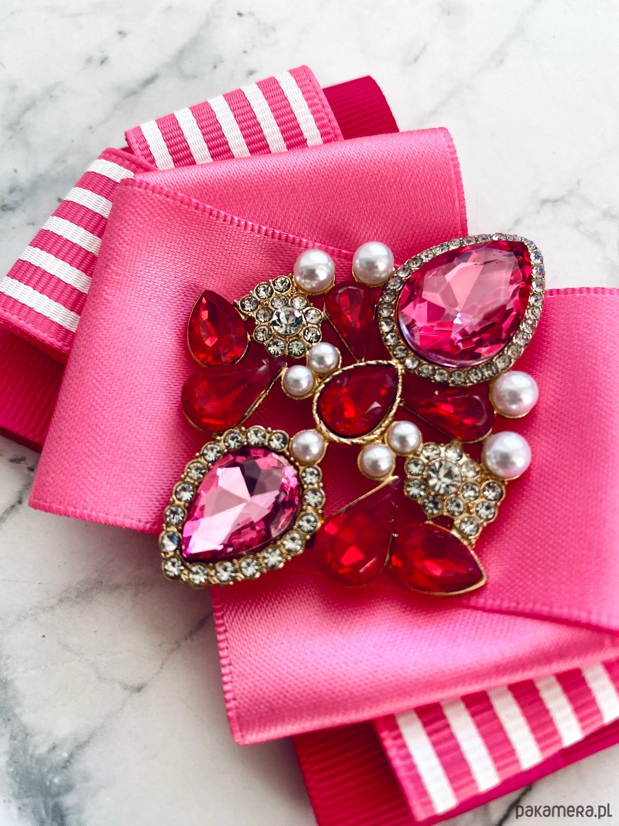 Na środku naszyta cudowna ozdoba biżuteryjna z kryształków w kolorze różowym. Dodatkowo małe perełki, które nadają lekkości i kobiecości.