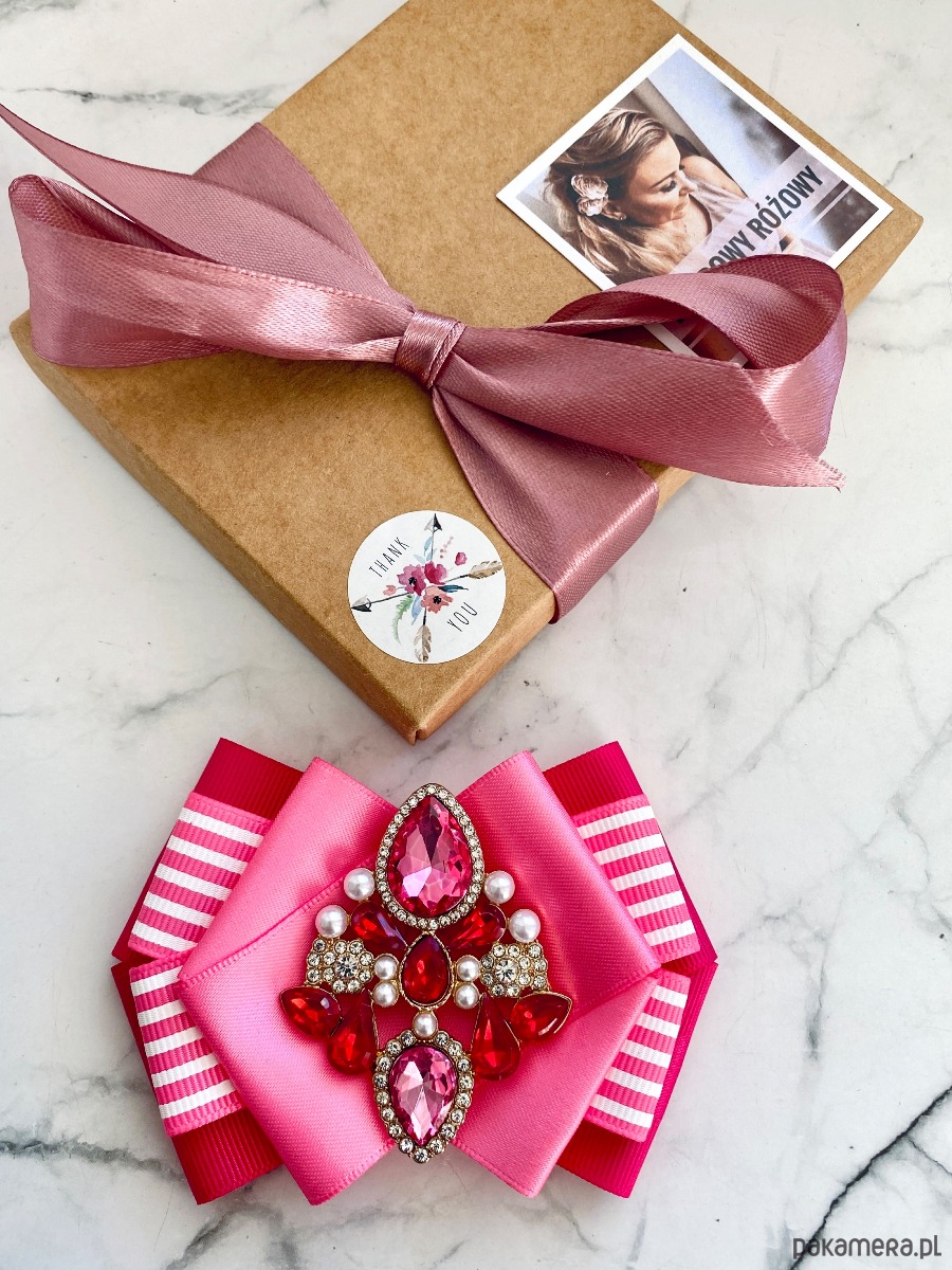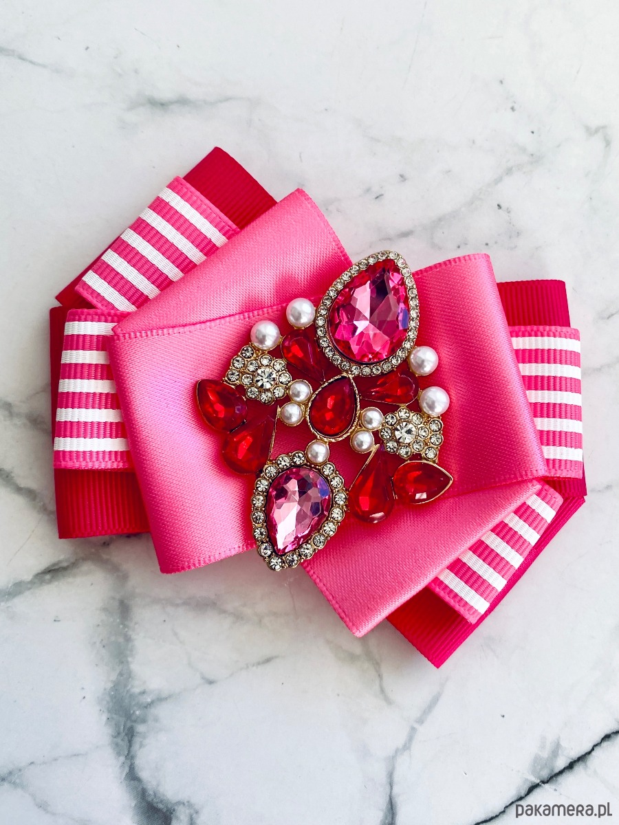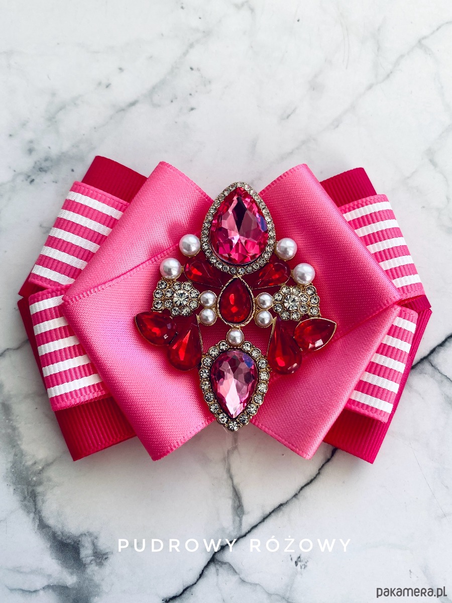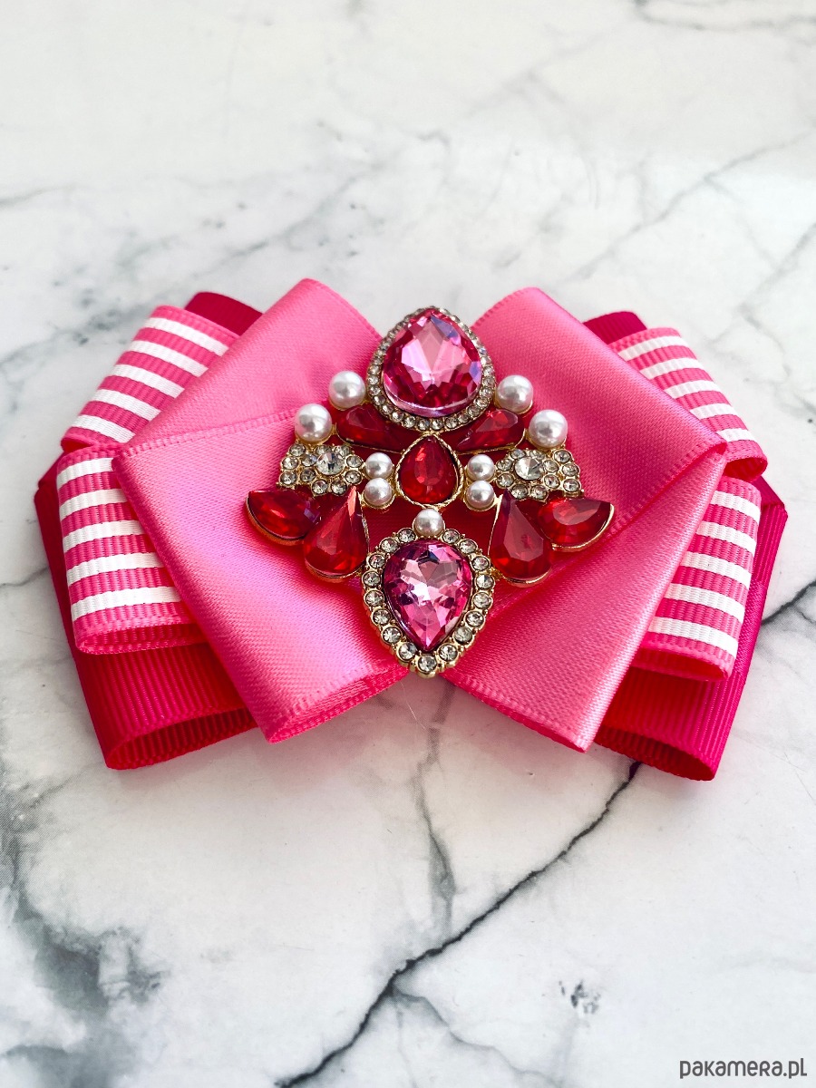 Na środku naszyta cudowna ozdoba biżuteryjna z kryształków w kolorze różowym. Dodatkowo małe perełki, które nadają lekkości i kobiecości.