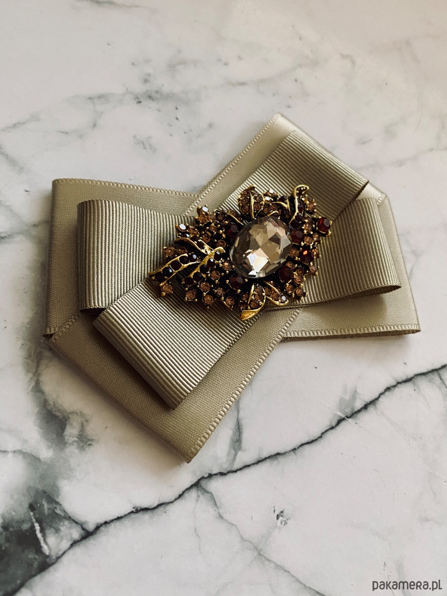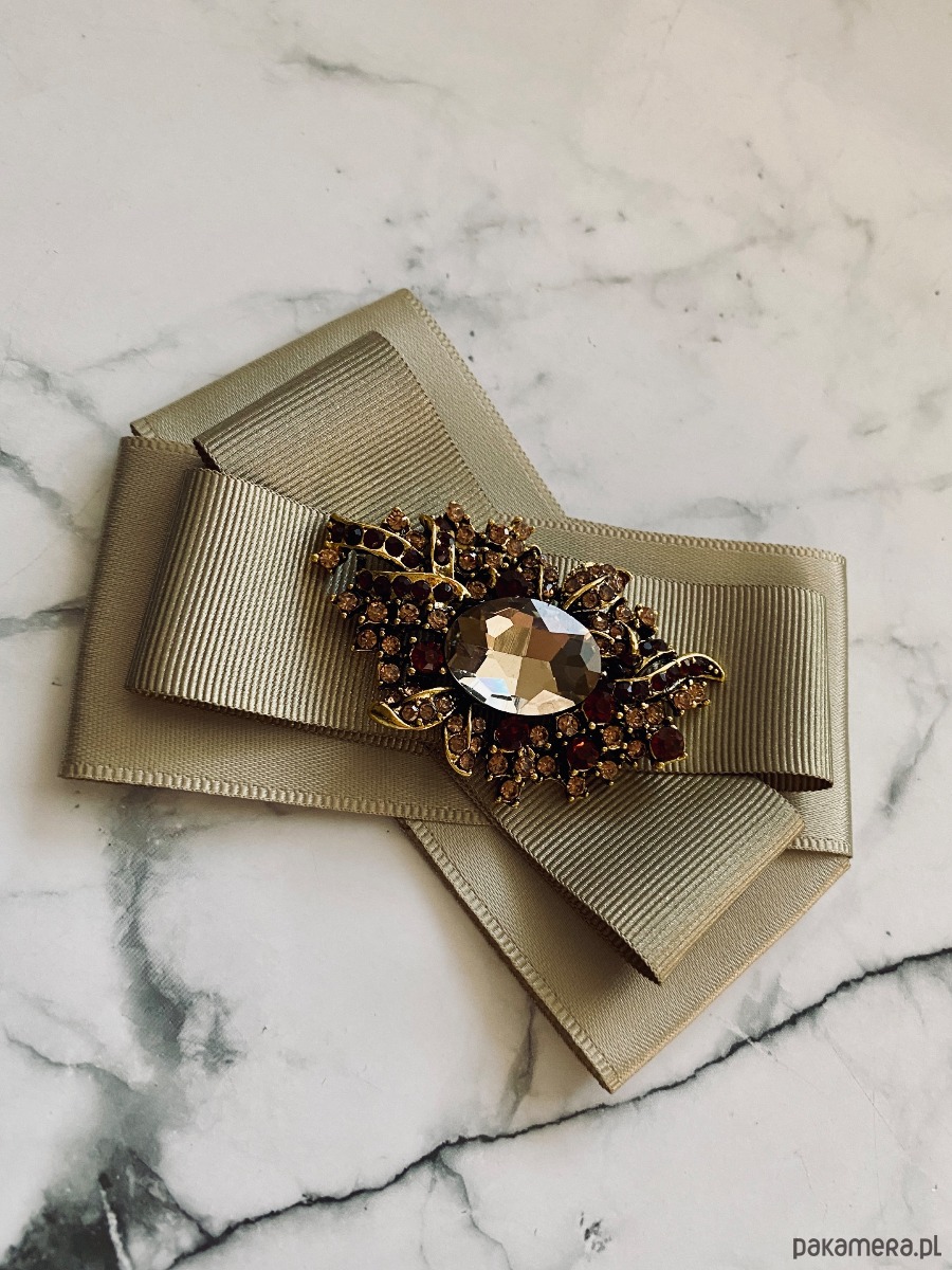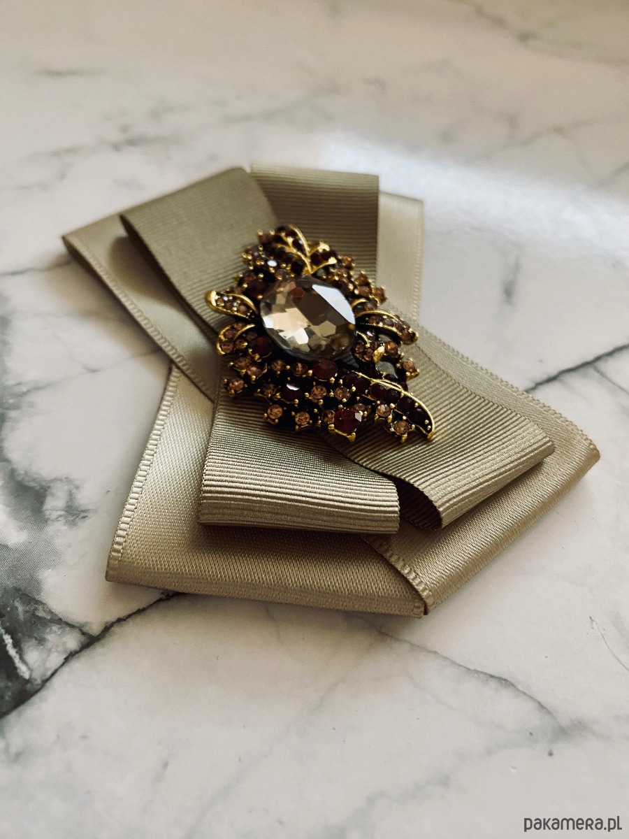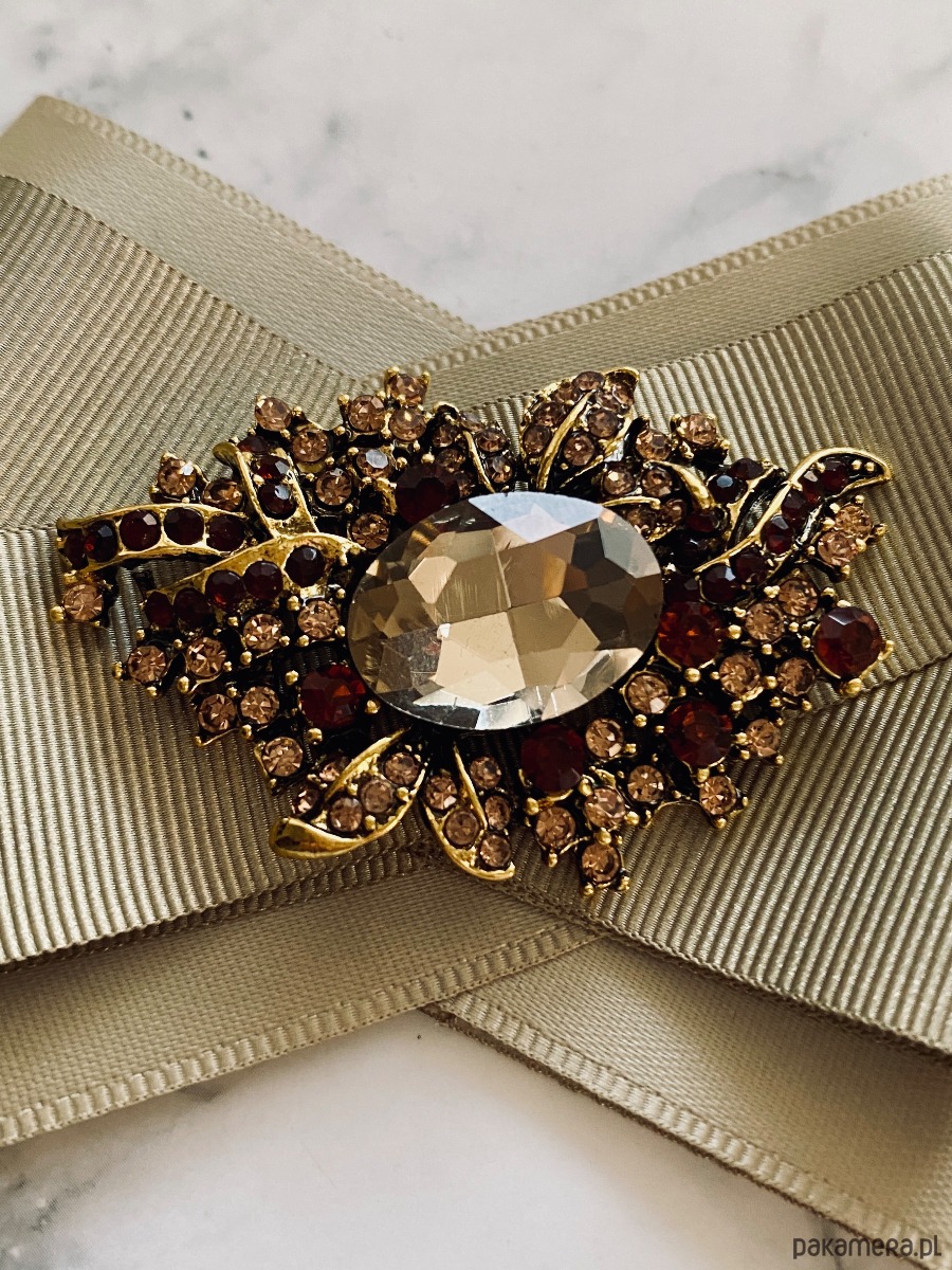 Broszka wykonana z wysokiej jakości taśm i dodatków. Brosza w kolorze khaki. Na środku sliczna ozdoba biżuteryjna w niespotykanym szampańskim kolorze, oprawa z ażurowym motywem w kolorze złota z dodatkiem drobnych kryształków. Będzie idealnie pasować zarówno do koszul, bluzek, swetrów, sukienek, żakietów oraz do płaszczy, kurtek, szali i chust. Idealna do każdej stylizacji, zarówno do sportowej jak również do eleganckich stylizacji.