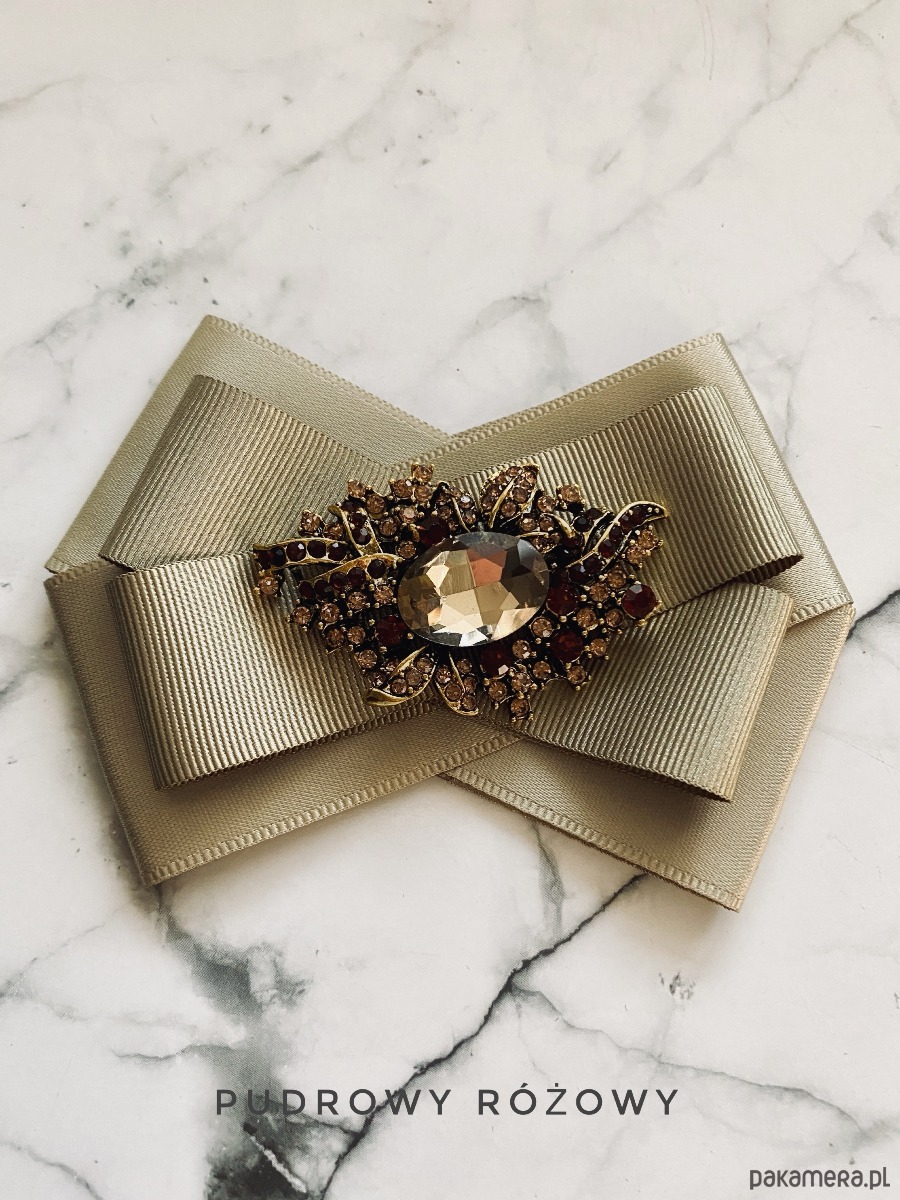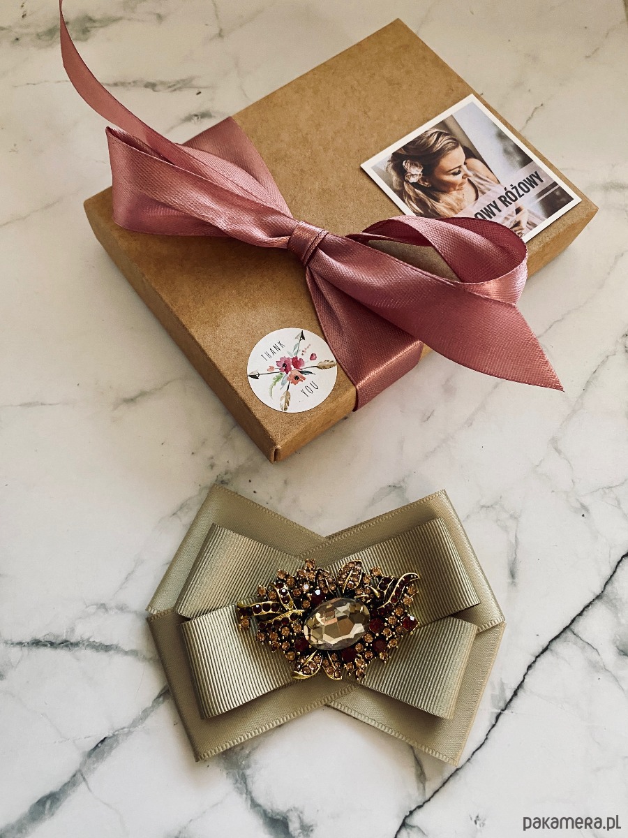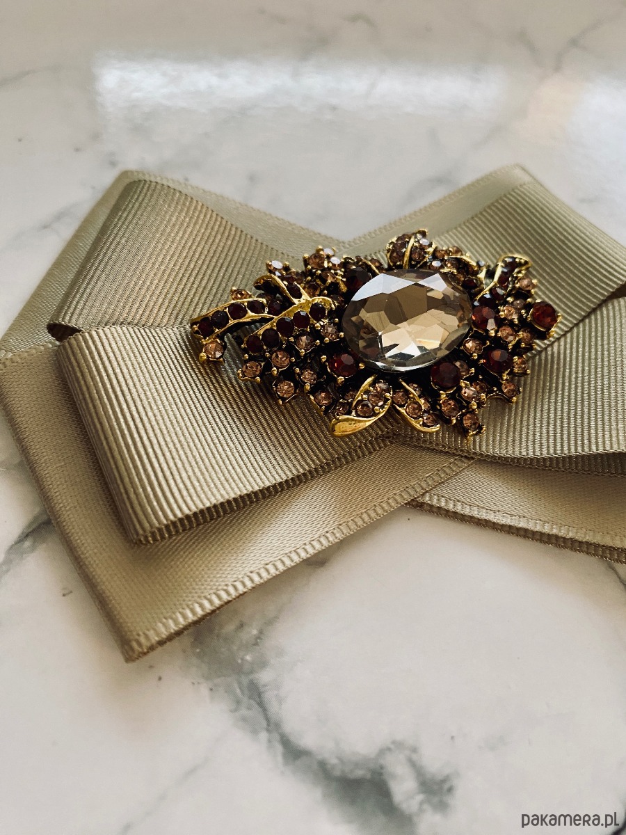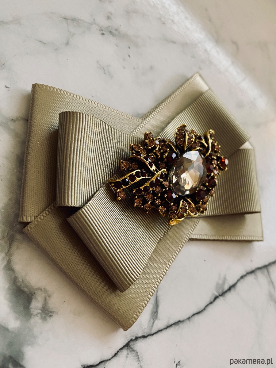 Broszka wykonana z wysokiej jakości taśm i dodatków. Brosza w kolorze khaki. Na środku sliczna ozdoba biżuteryjna w niespotykanym szampańskim kolorze, oprawa z ażurowym motywem w kolorze złota z dodatkiem drobnych kryształków. Będzie idealnie pasować zarówno do koszul, bluzek, swetrów, sukienek, żakietów oraz do płaszczy, kurtek, szali i chust. Idealna do każdej stylizacji, zarówno do sportowej jak również do eleganckich stylizacji.