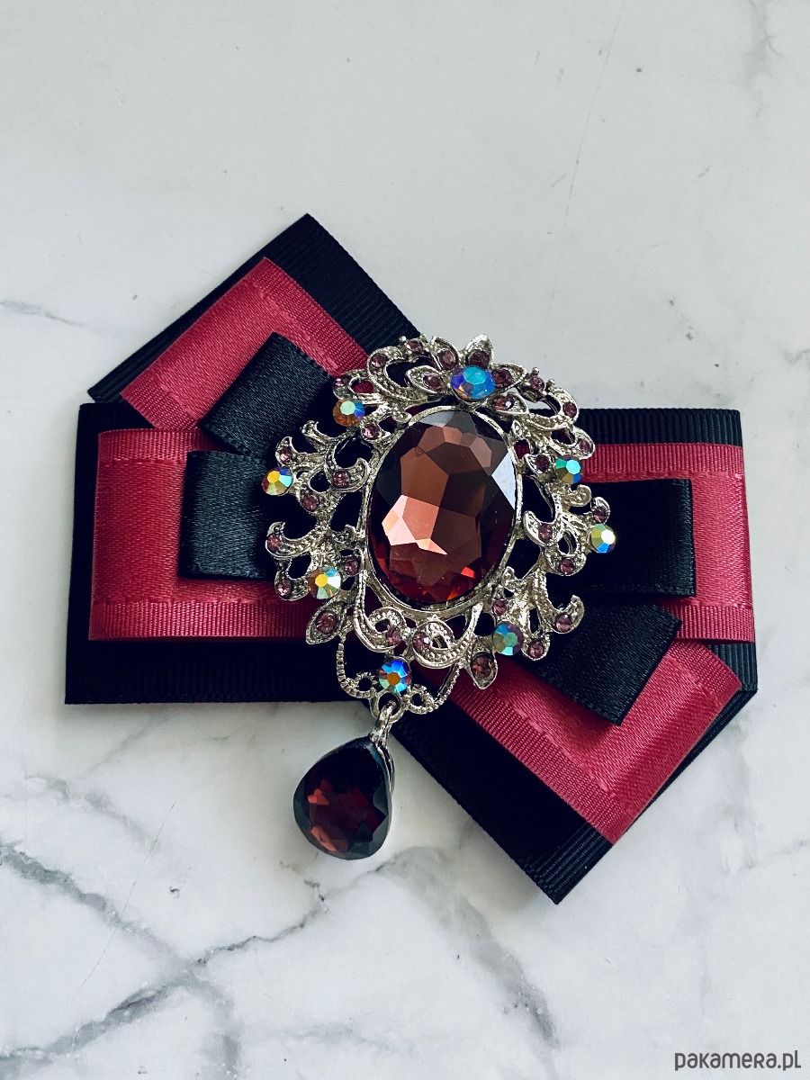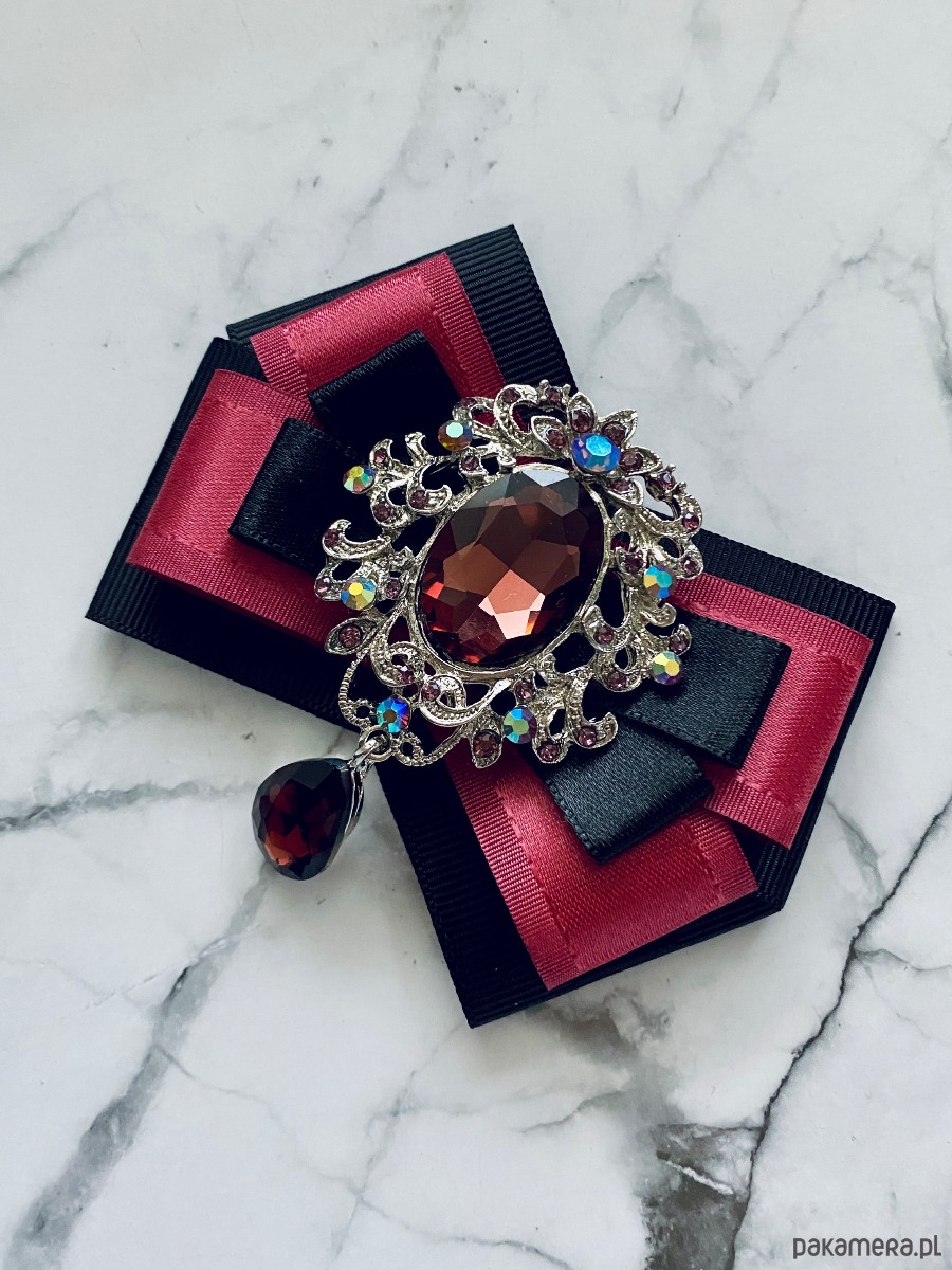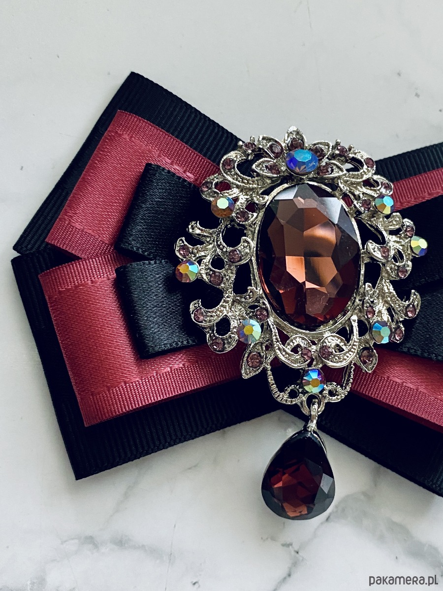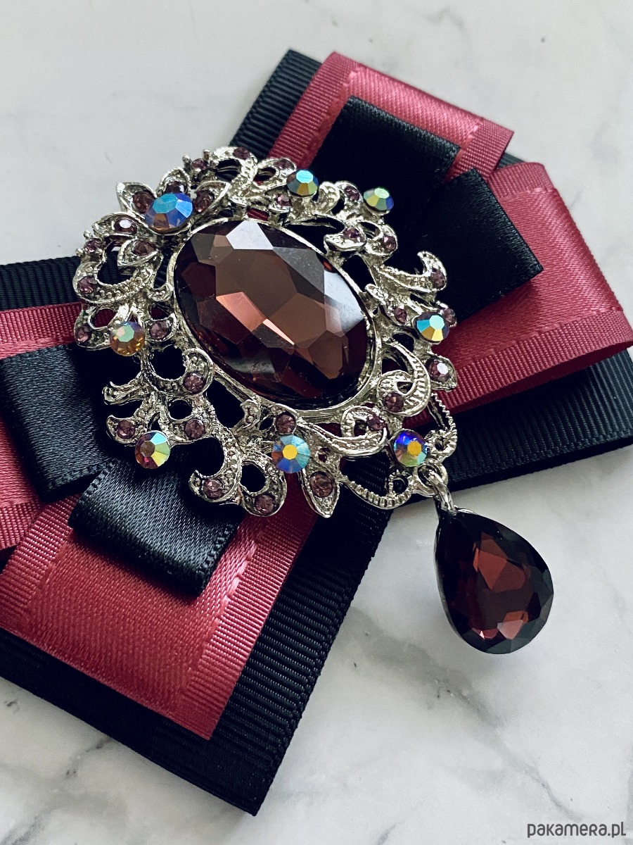 Broszka wykonana z wysokiej jakości taśm i dodatków. Brosza w kolorze brudnego herbacianego różu i czerni. Na środku imponująca ażurowa ozdoba biżuteryjna z kryształami w kolorze wina. Brosza stworzona z myślą o kobietach delikatnych o klasycznej urodzie. Będzie idealnie pasować zarówno do koszul, bluzek, swetrów, sukienek, żakietów oraz do płaszczy, kurtek, szali i chust. Idealna do każdej stylizacji, zarówno do sportowej jak również do eleganckich stylizacji.