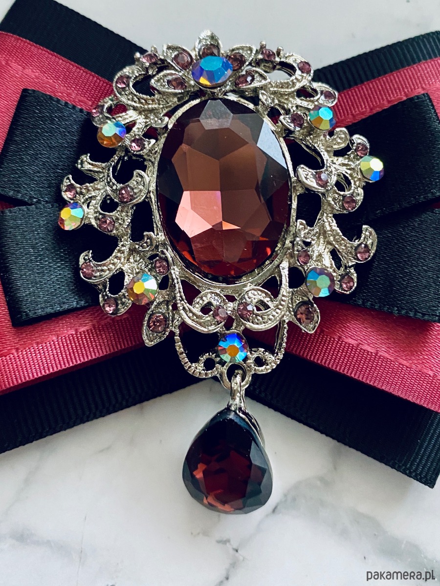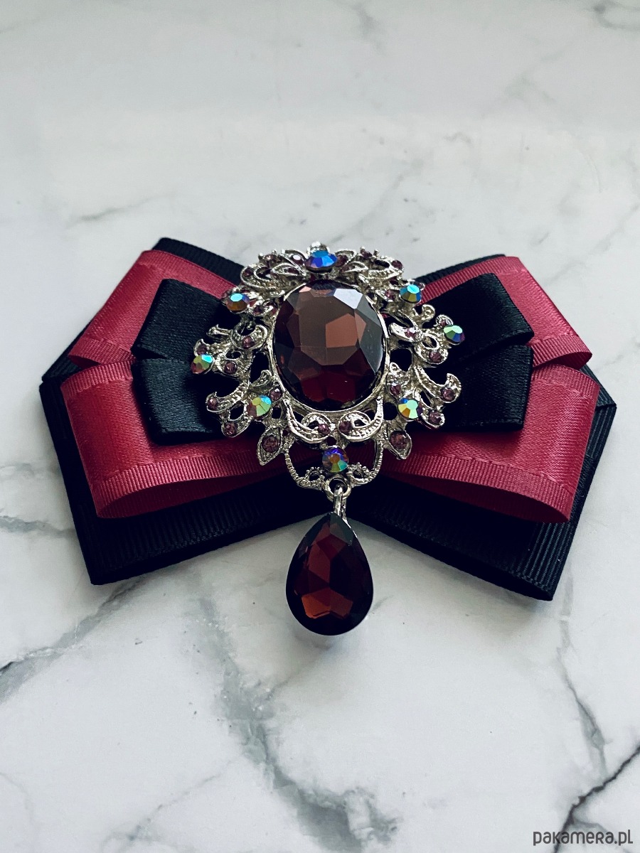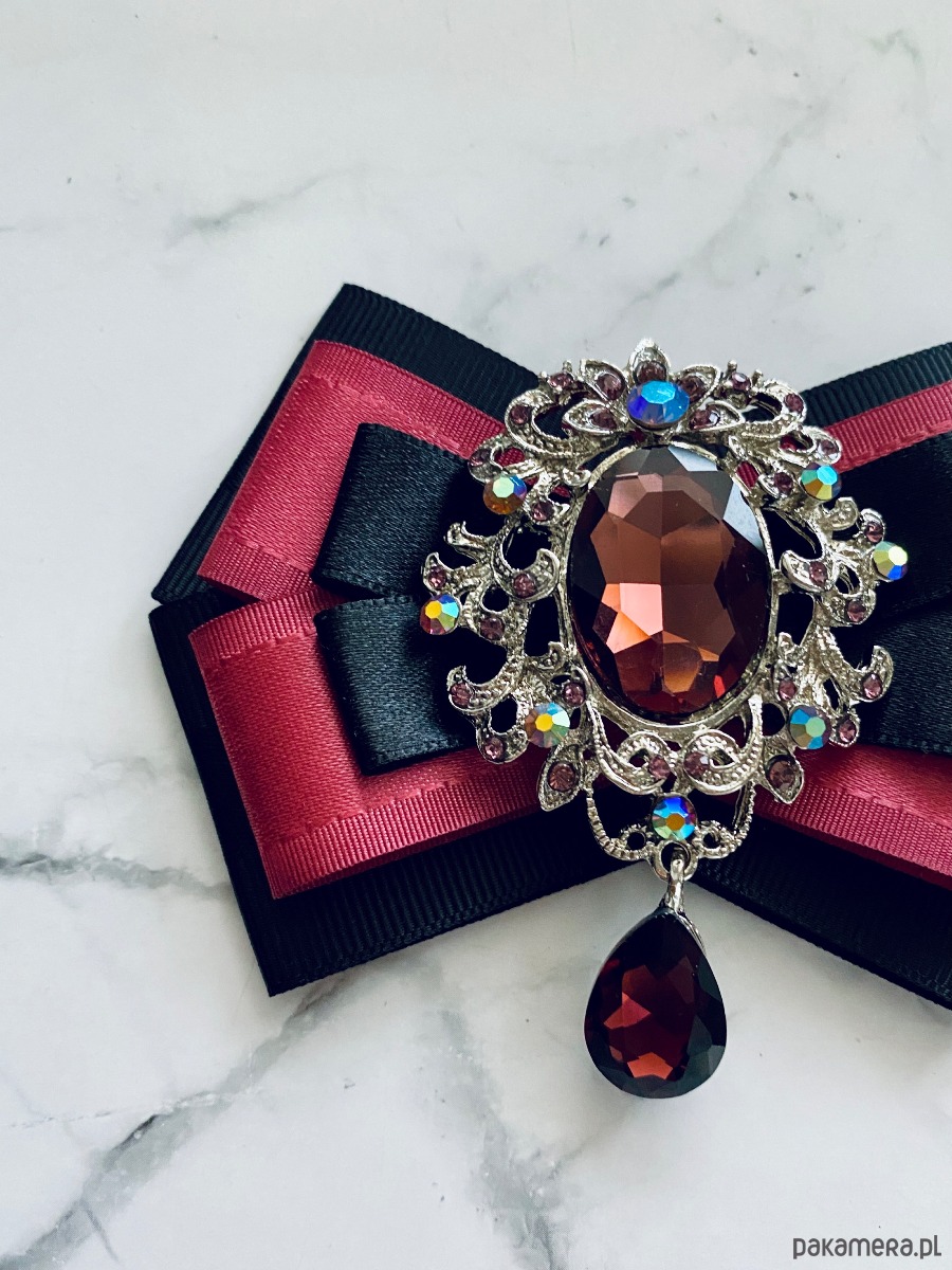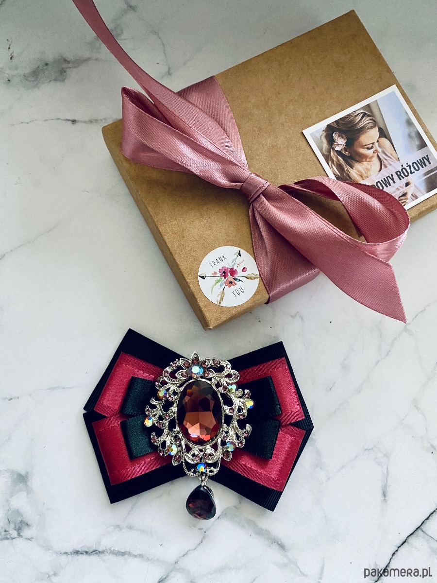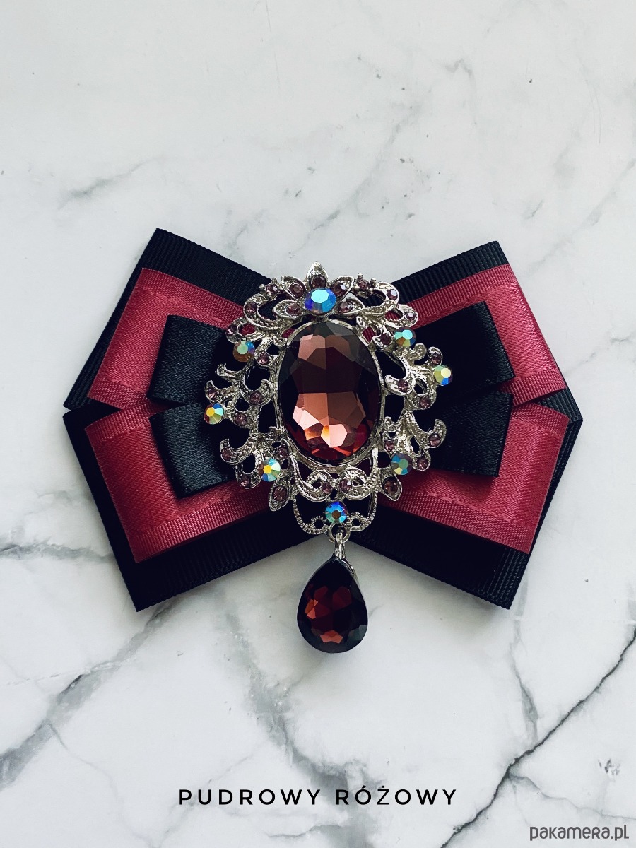 Broszka wykonana z wysokiej jakości taśm i dodatków. Brosza w kolorze brudnego herbacianego różu i czerni. Na środku imponująca ażurowa ozdoba biżuteryjna z kryształami w kolorze wina. Brosza stworzona z myślą o kobietach delikatnych o klasycznej urodzie. Będzie idealnie pasować zarówno do koszul, bluzek, swetrów, sukienek, żakietów oraz do płaszczy, kurtek, szali i chust. Idealna do każdej stylizacji, zarówno do sportowej jak również do eleganckich stylizacji.