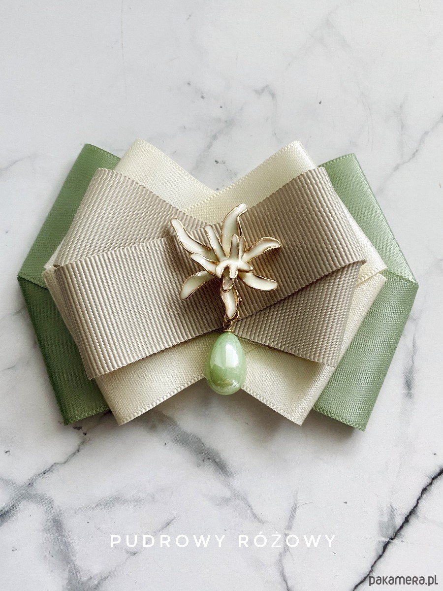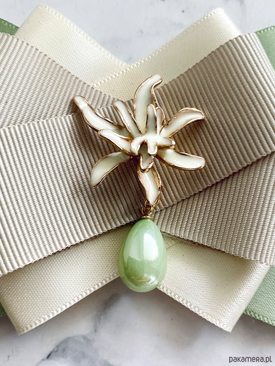 Piękna dekoracyjna ozdoba na środku, nowoczesny kremowy kwiat i wiszącą perłą w kolorze delikatnej zieleni.