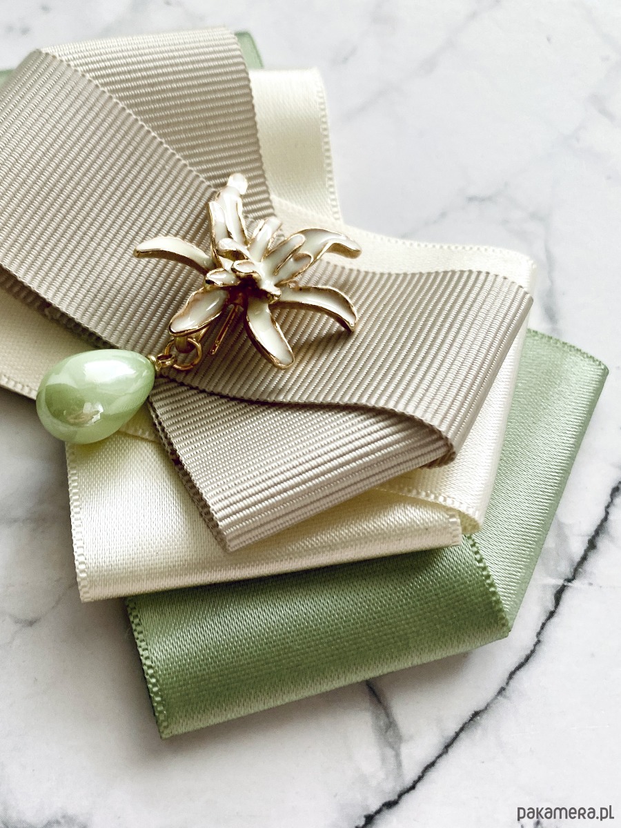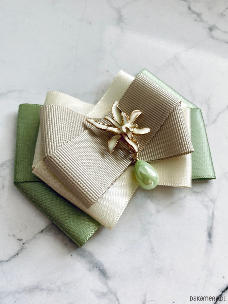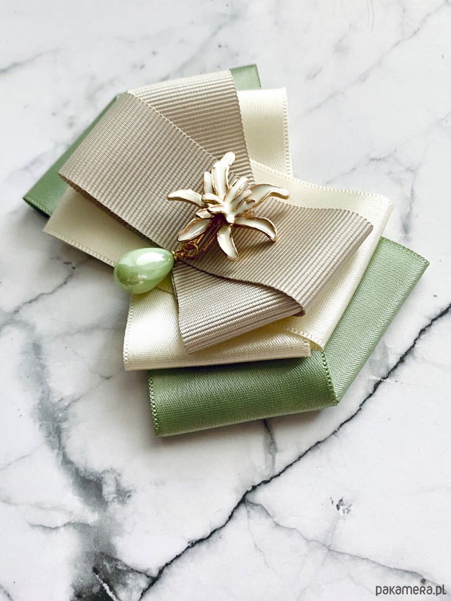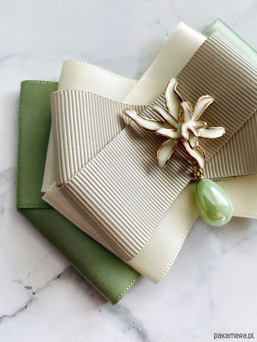 Broszka wykonana z wysokiej jakości taśm i dodatków.
