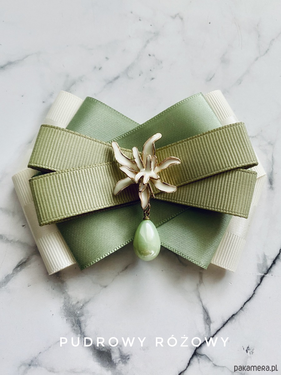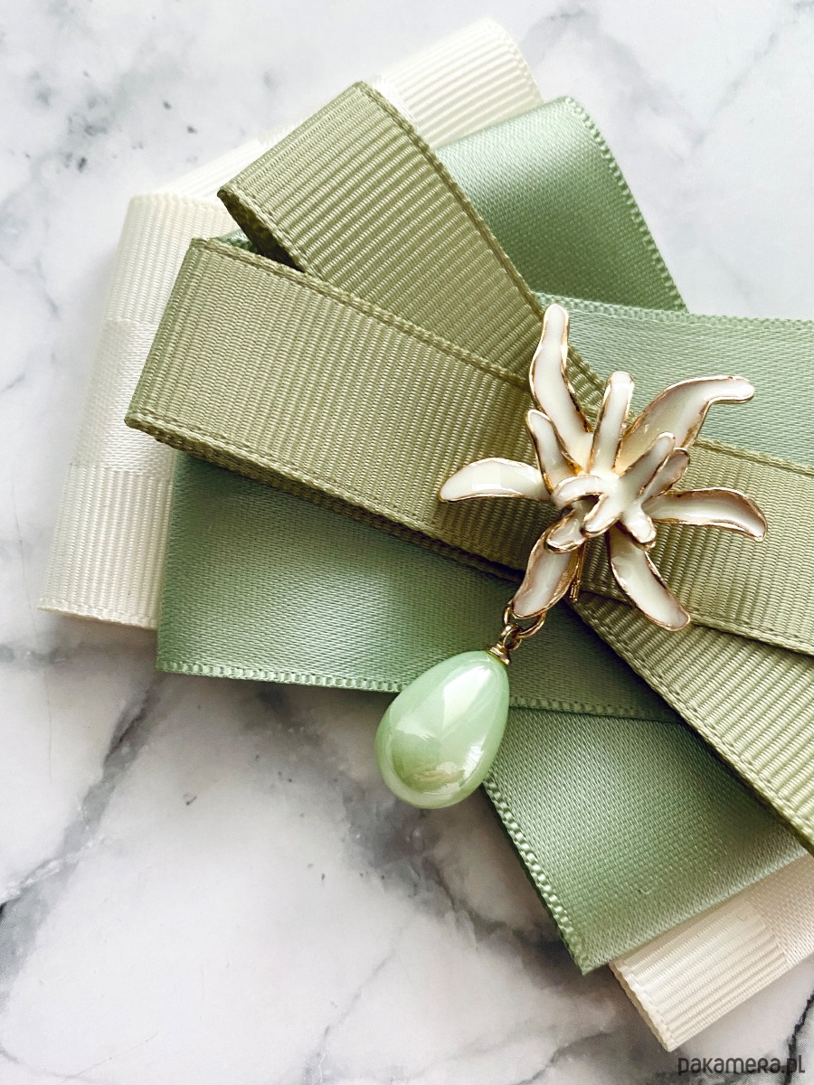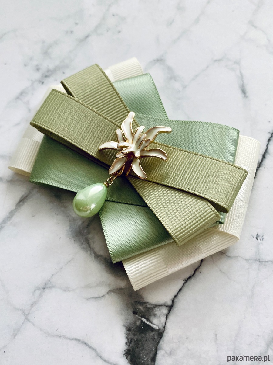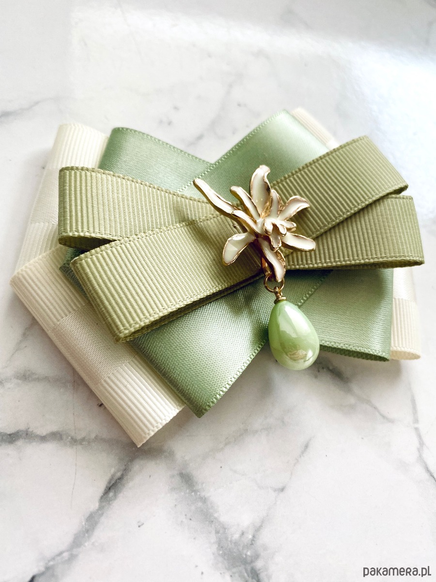 Piękna dekoracyjna ozdoba na środku, nowoczesny kremowy kwiat i wiszącą perłą w kolorze delikatnej zieleni.