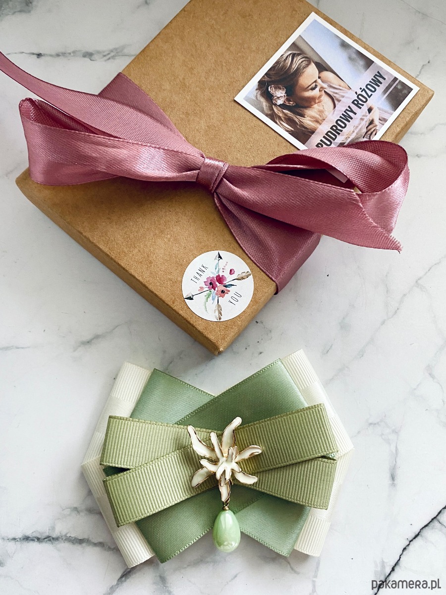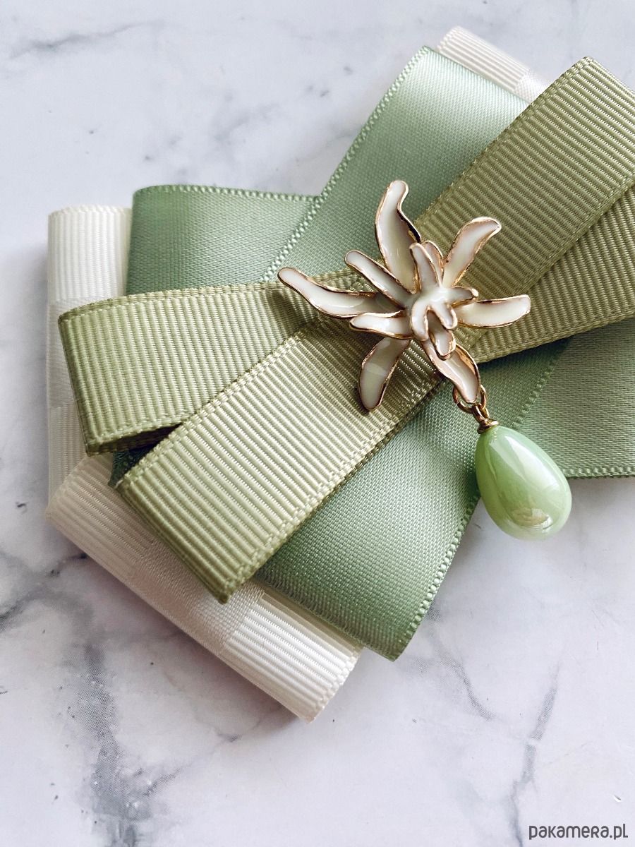 Broszka wykonana z wysokiej jakości taśm i dodatków.