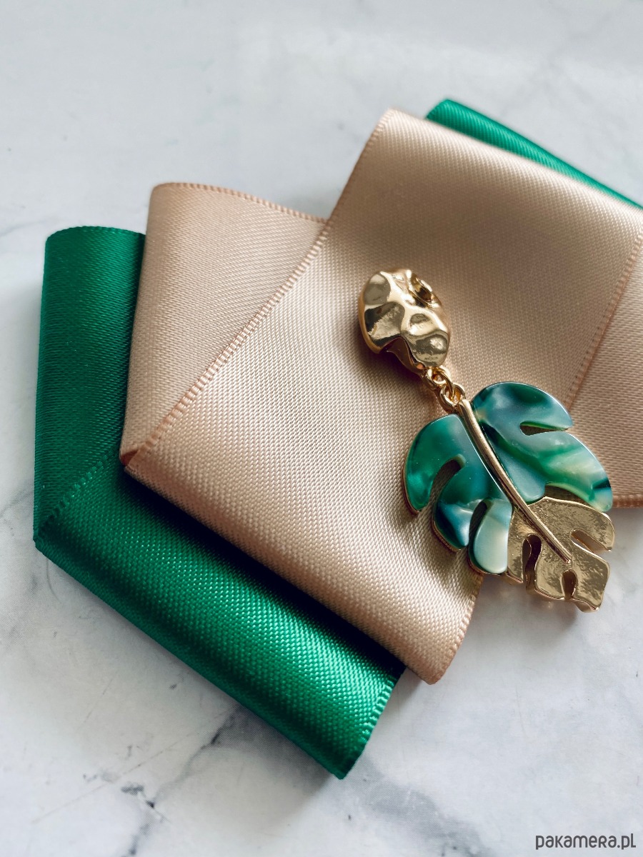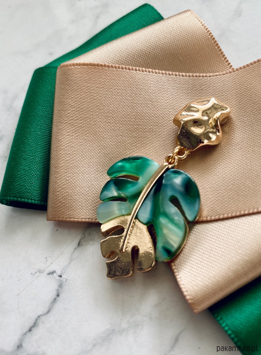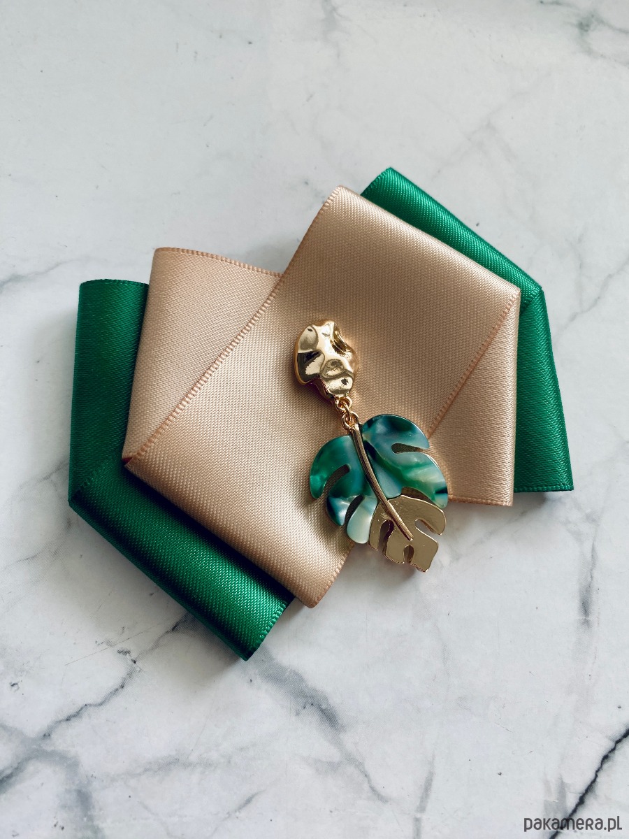 Piękna dekoracyjna ozdoba na środku, liść palmowy wszystko zachowane w tonacji kolorów zieleni i złota.