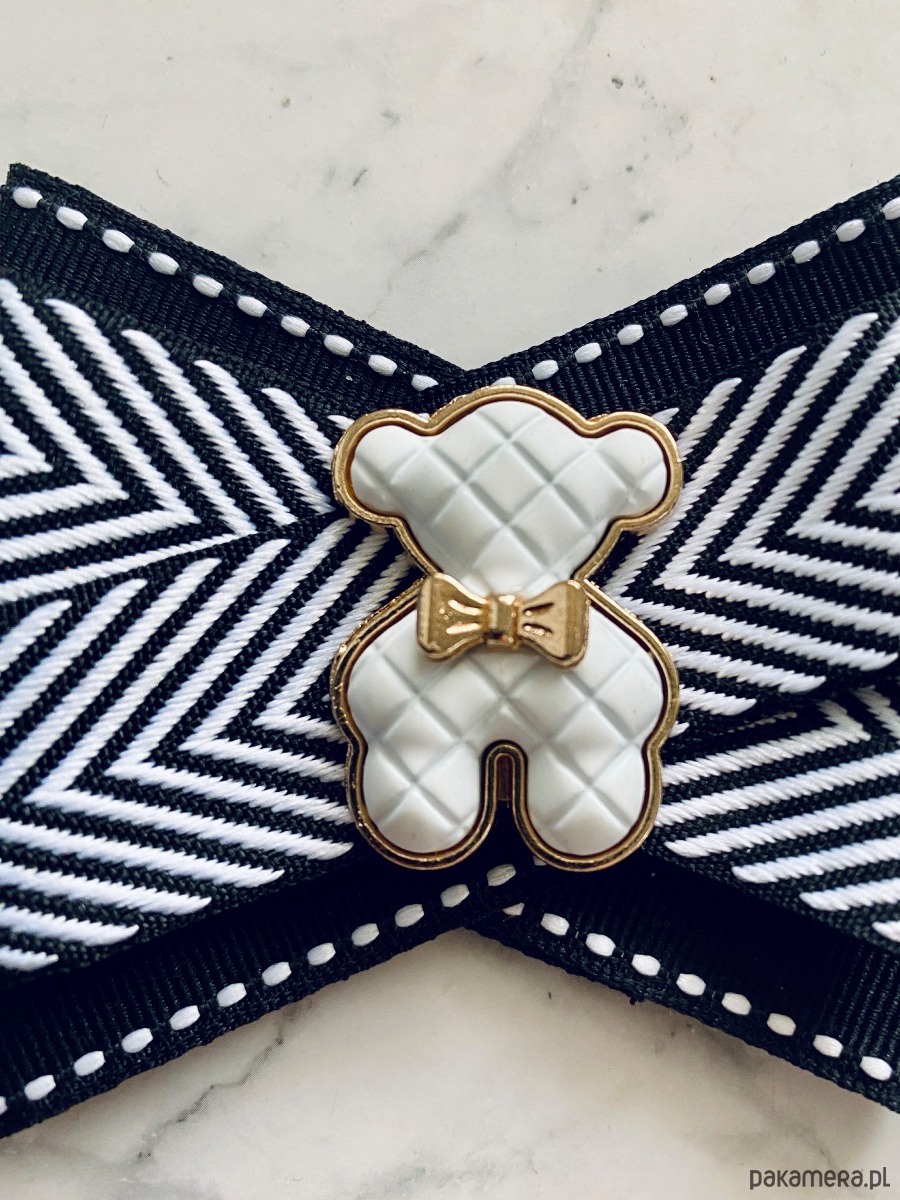 Cudowny Miś wykonany z ciekawej kratkowanej masy w kolorze białym, urocza złota kokardka.