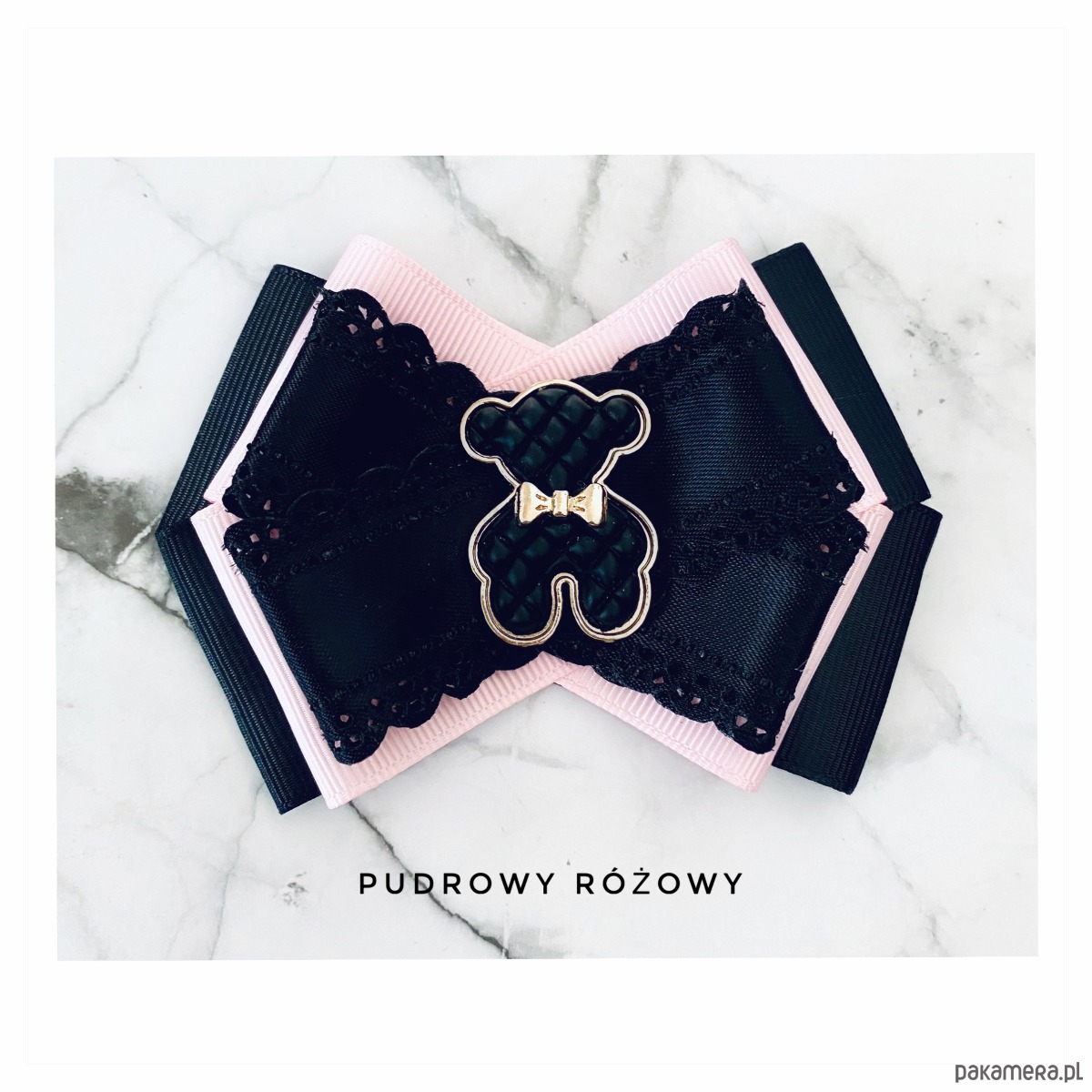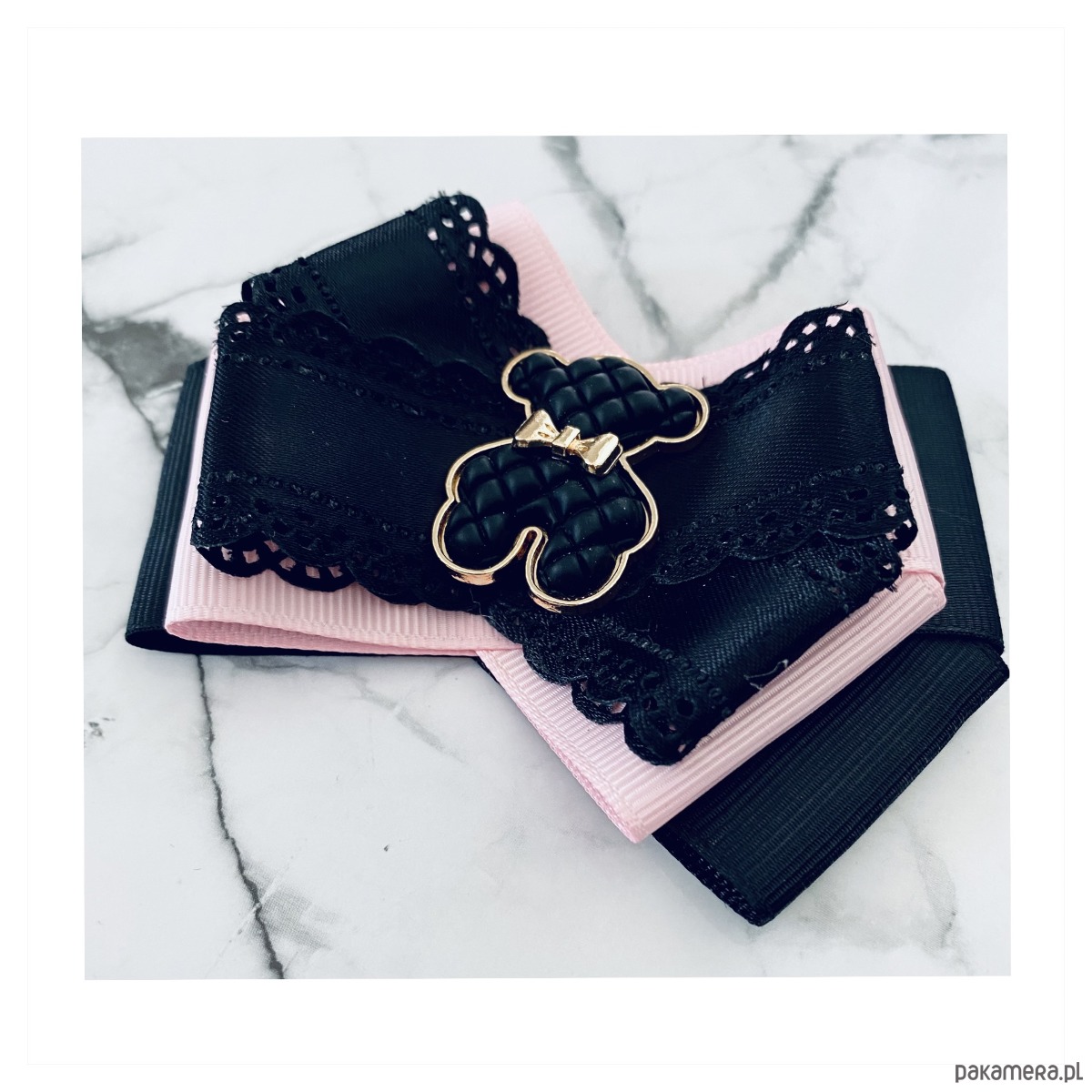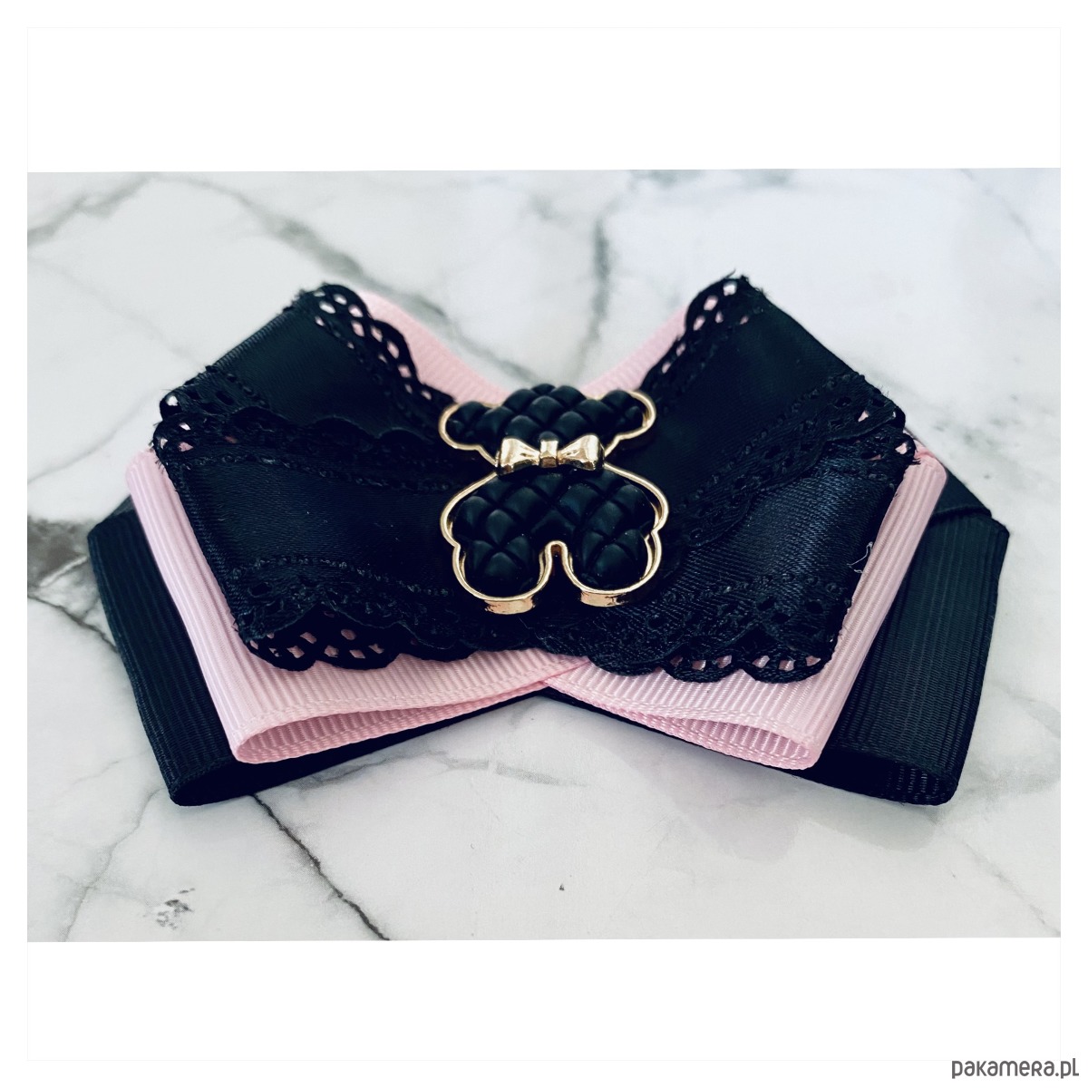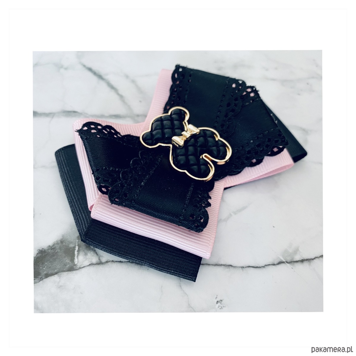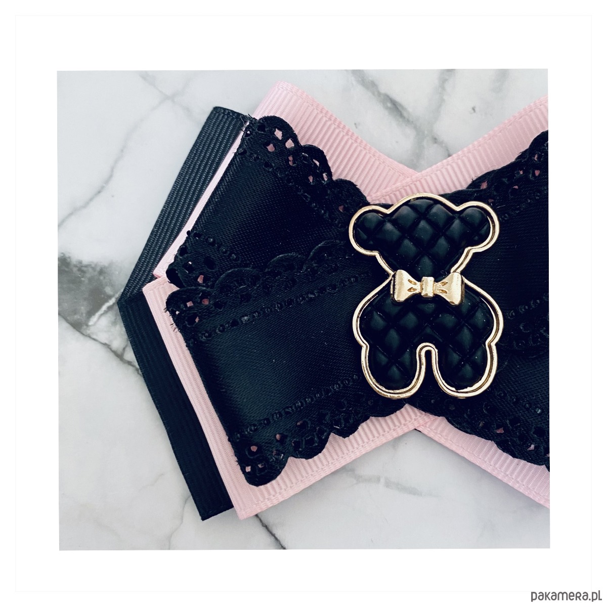 Cudowny Miś wykonany z ciekawej kratkowanej masy w kolorze czarnym urocza złota kokardka.