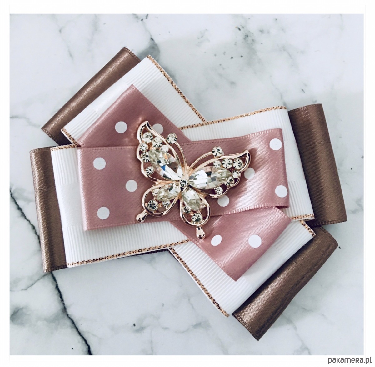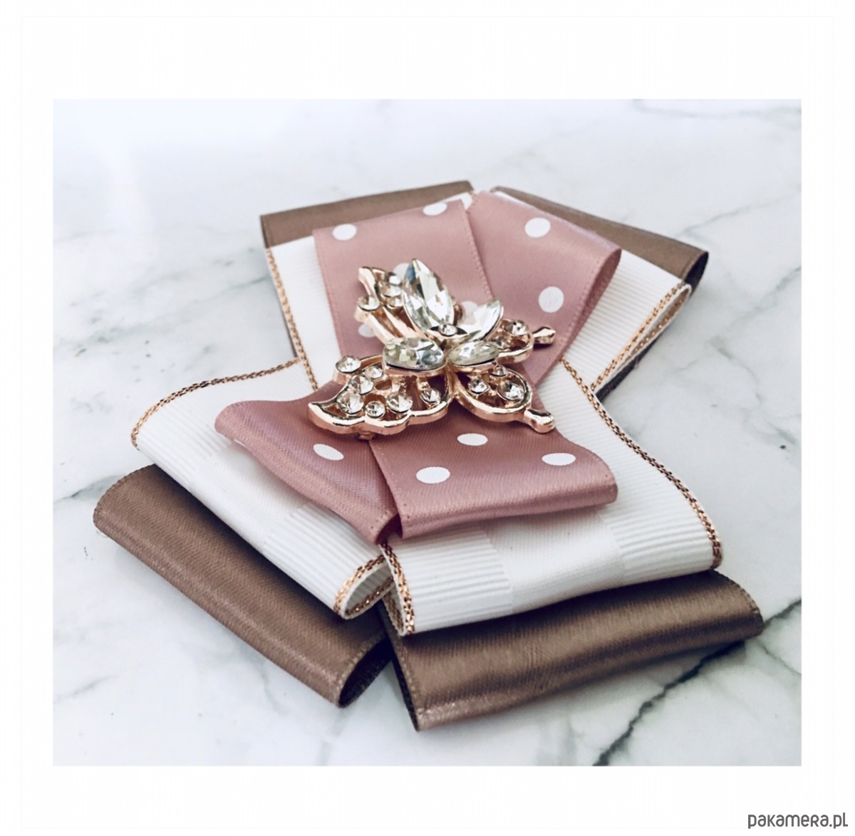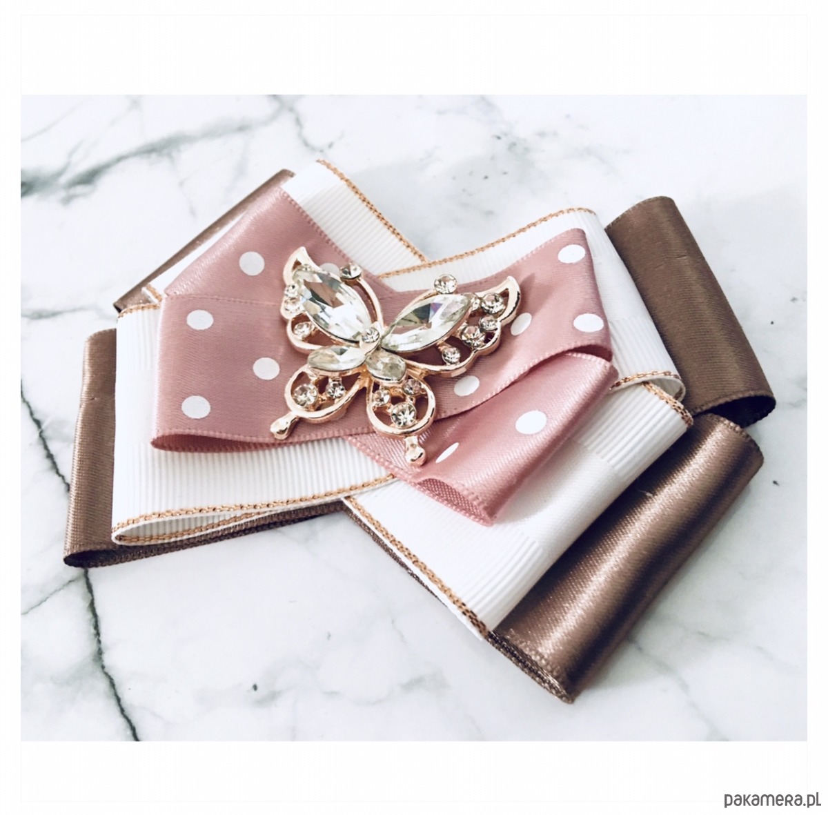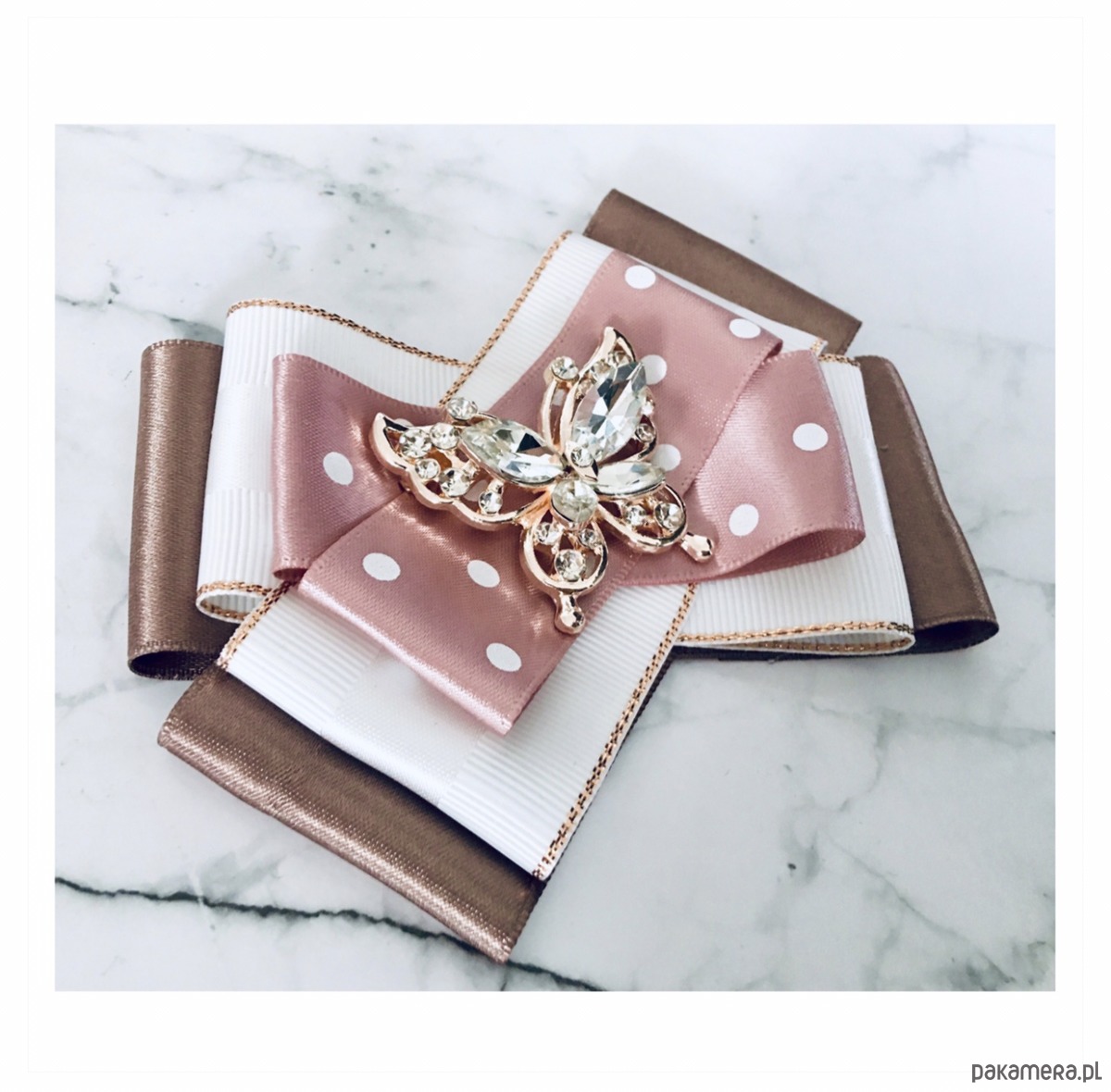 Broszka wykonana z wysokiej jakości taśm i dodatków. Brosza w kolorze cappuccino, bieli i pudrowego różu.