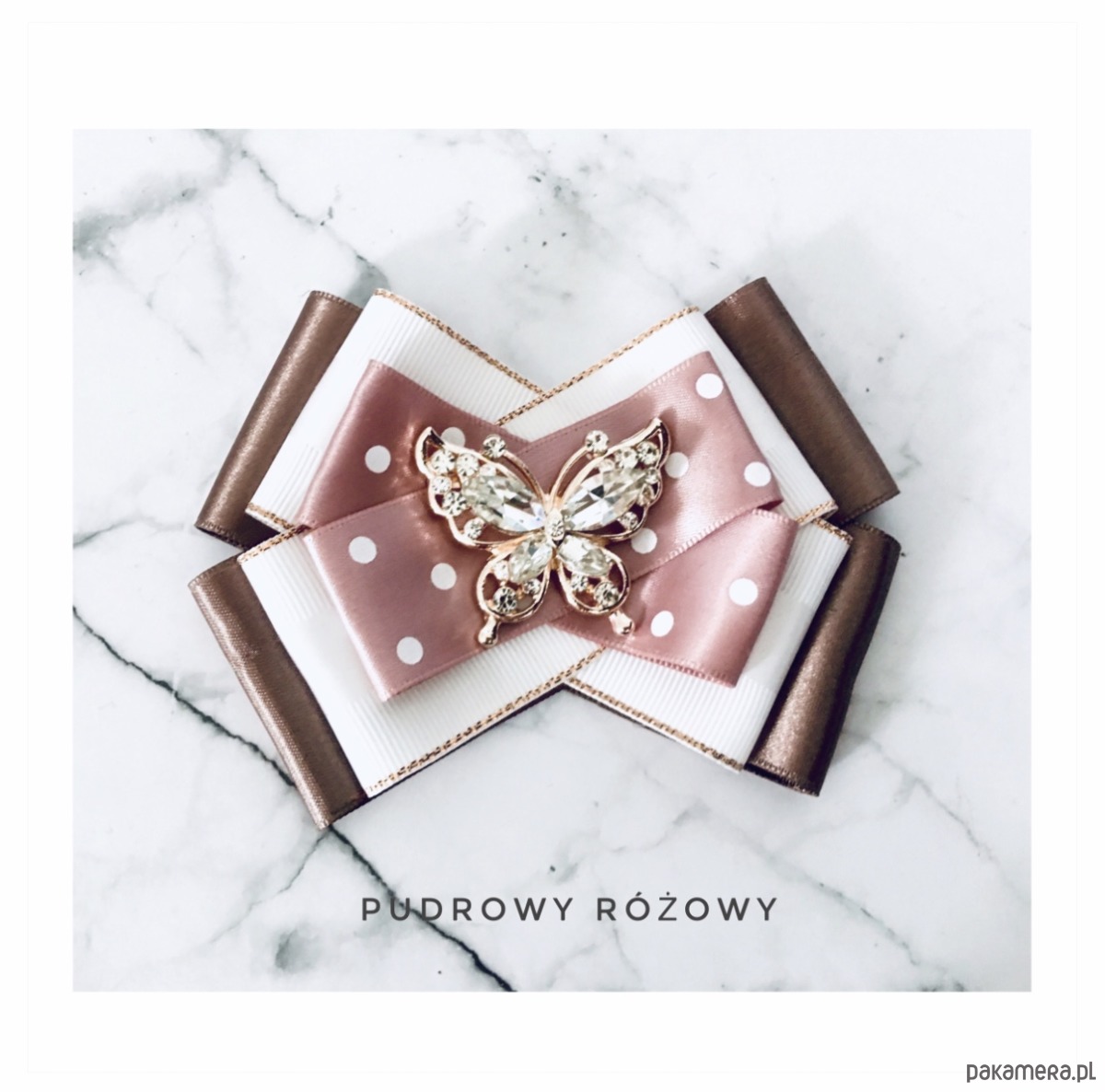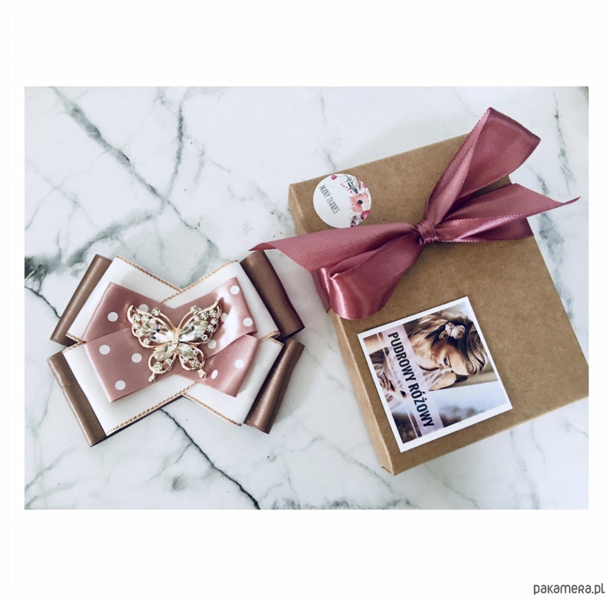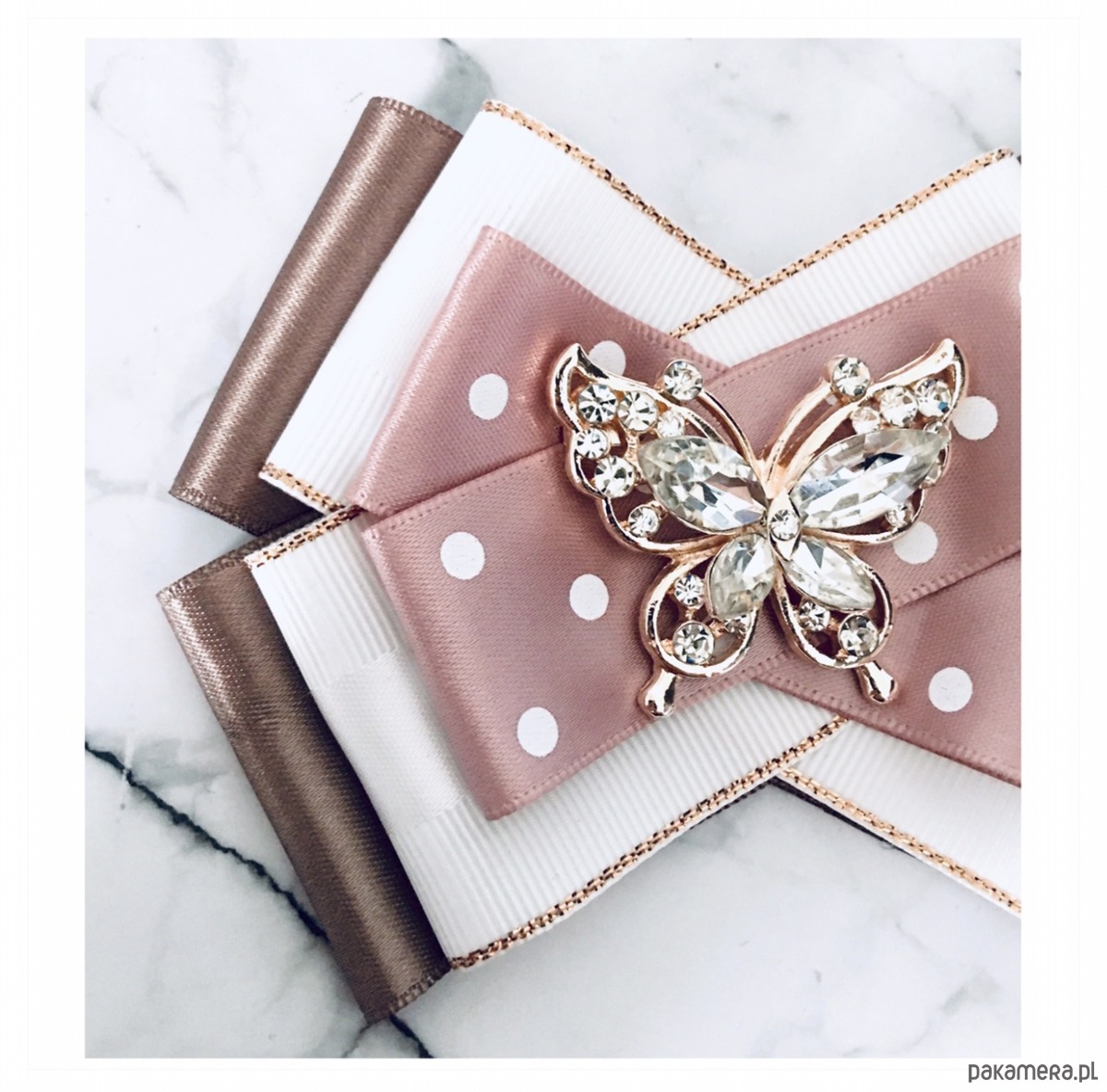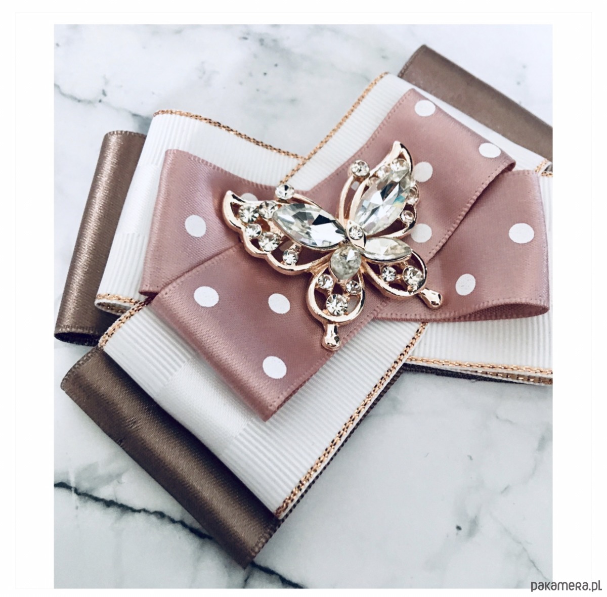 Broszka wykonana z wysokiej jakości taśm i dodatków. Brosza w kolorze cappuccino, bieli i pudrowego różu.