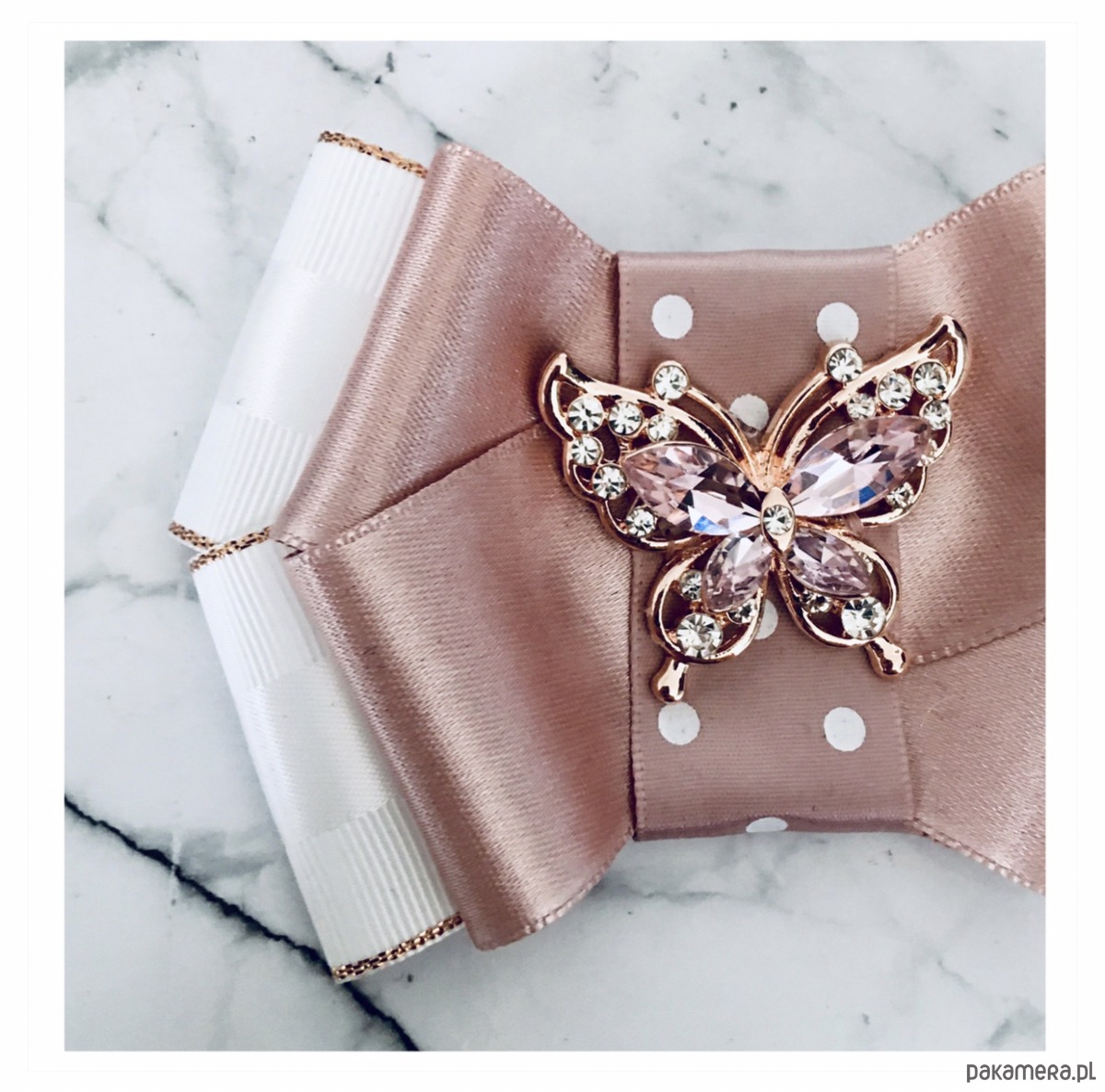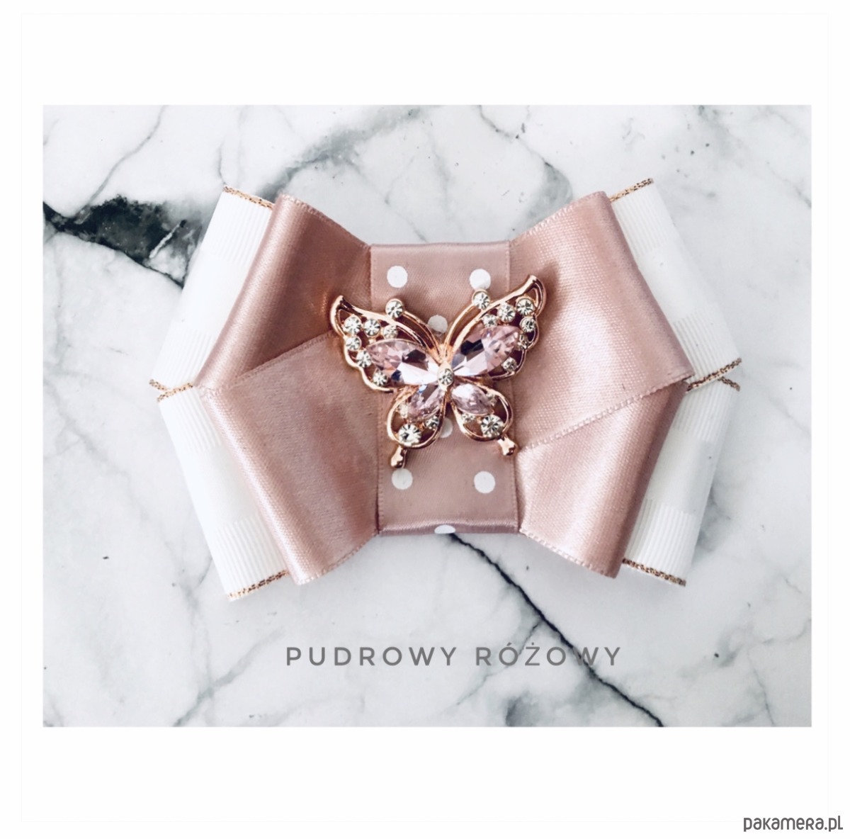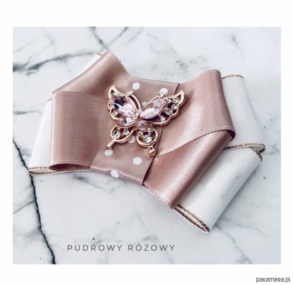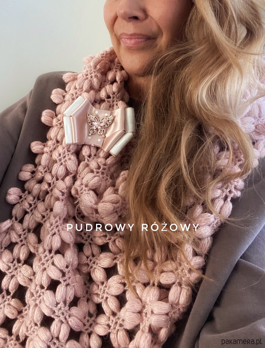Broszka wykonana z wysokiej jakości taśm i dodatków. Brosza w kolorze bieli i pudrowego różu.