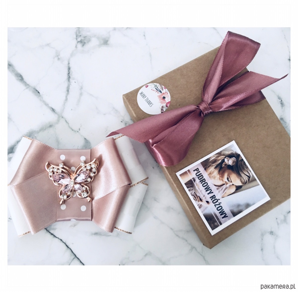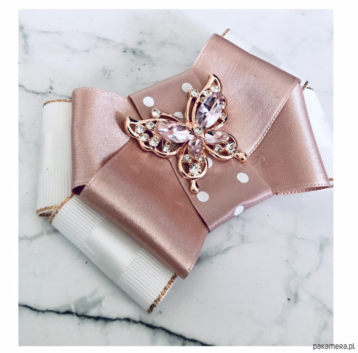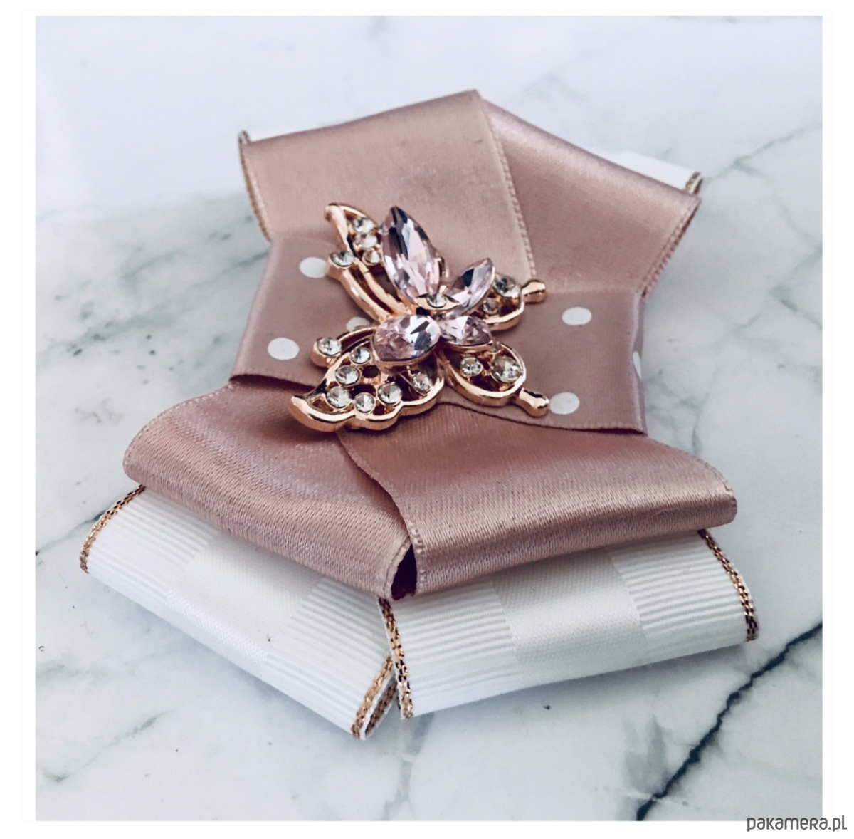 Broszka wykonana z wysokiej jakości taśm i dodatków. Brosza w kolorze bieli i pudrowego różu.