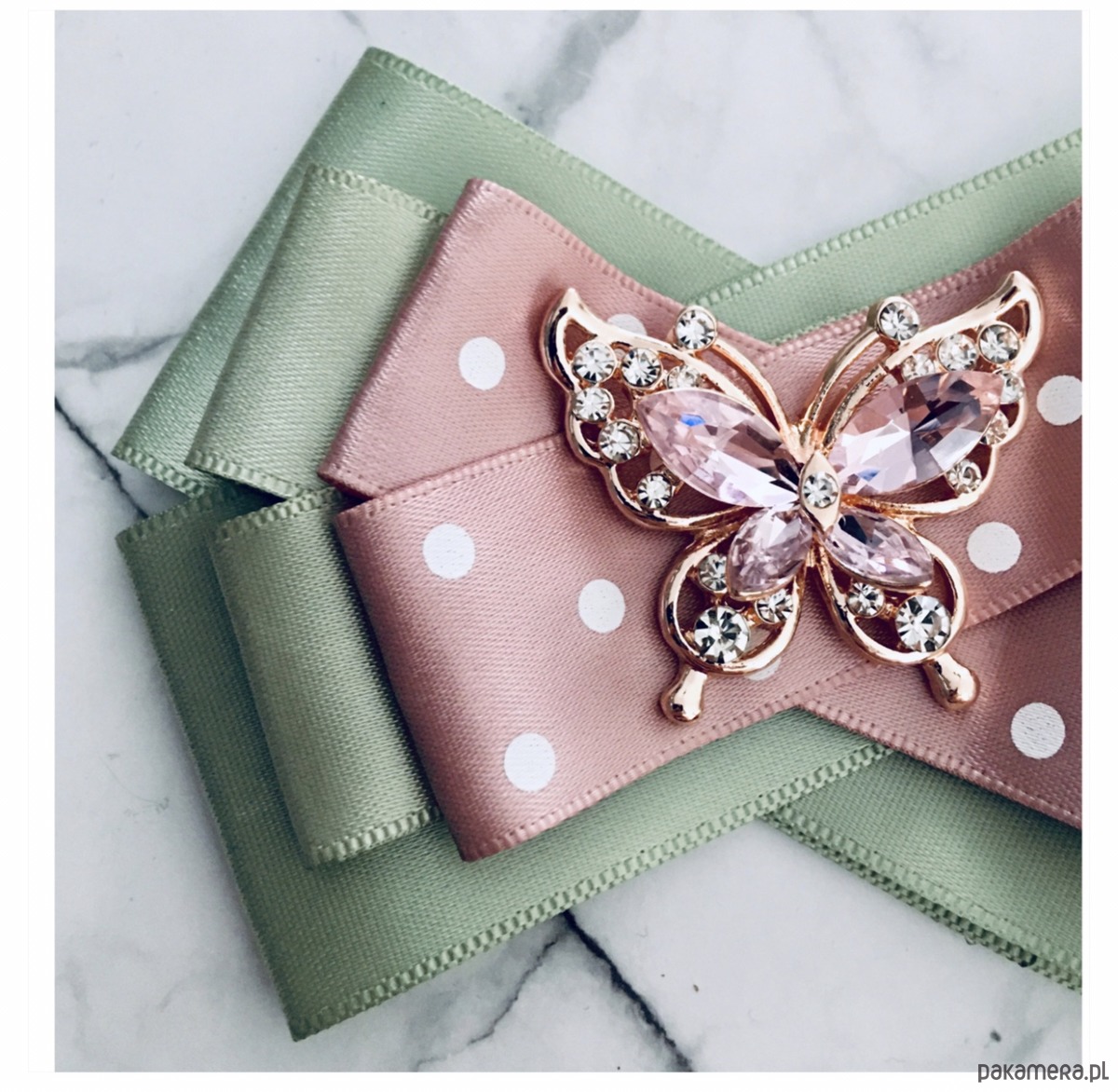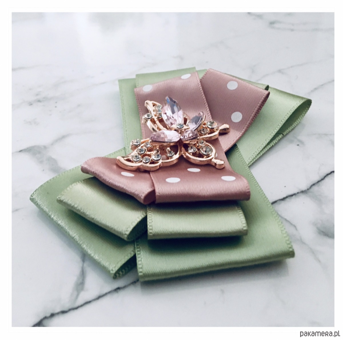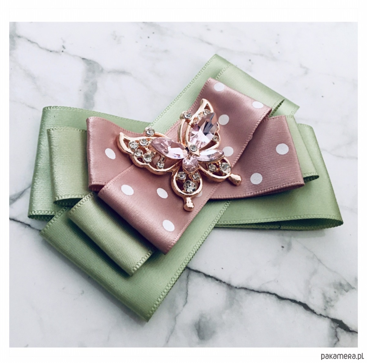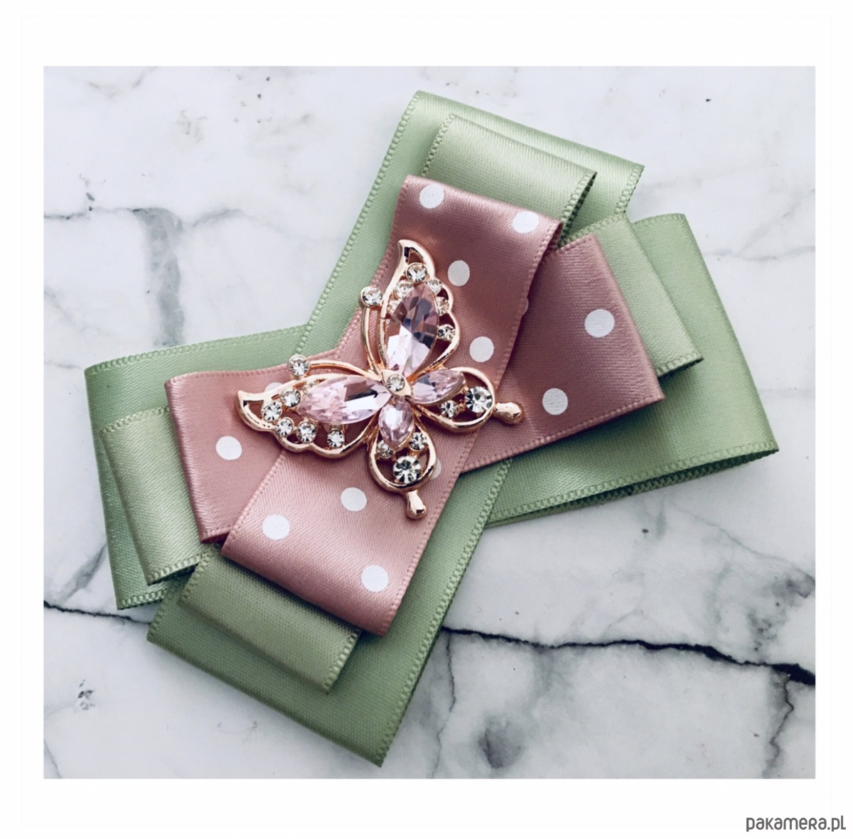 Broszka wykonana z wysokiej jakości taśm i dodatków. Broszka w kolorach delikatnej zieleni i pudrowego różu. . Piękna dekoracyjna ozdoba na środku. Cudny Motylek w delikatnym złocie z kryształkami w kolorze pudrowego różu. . Będzie idealnie pasować zarówno do koszul, bluzek, swetrów, sukienek, żakietów oraz do płaszczy, kurtek, szali i chust. Idealna do każdej stylizacji, zarówno do sportowej jak również do eleganckich stylizacji.