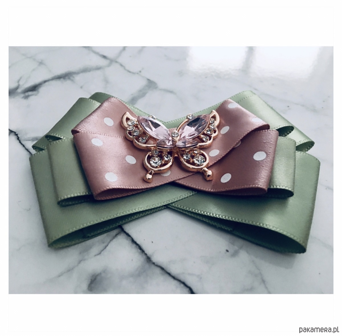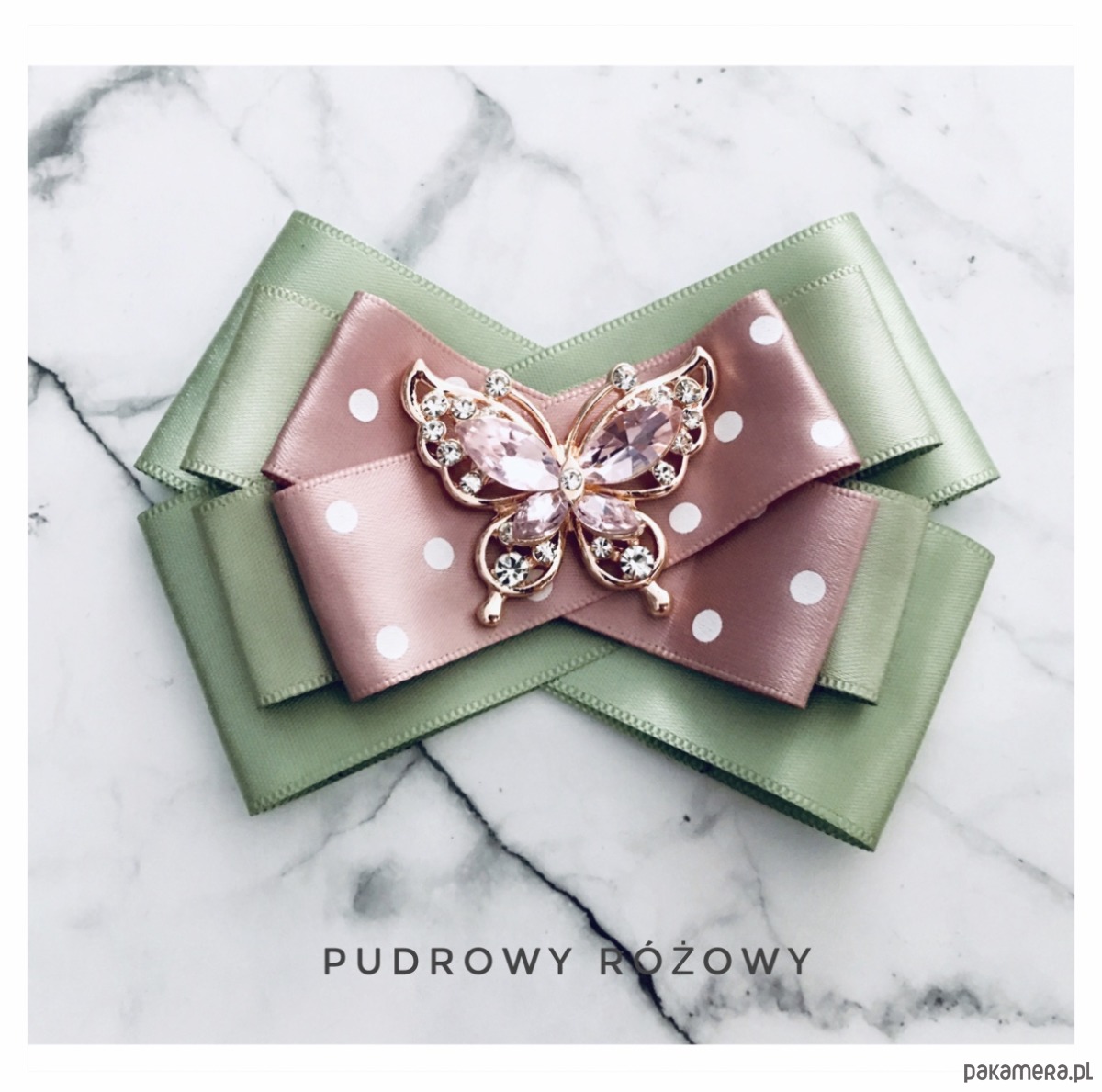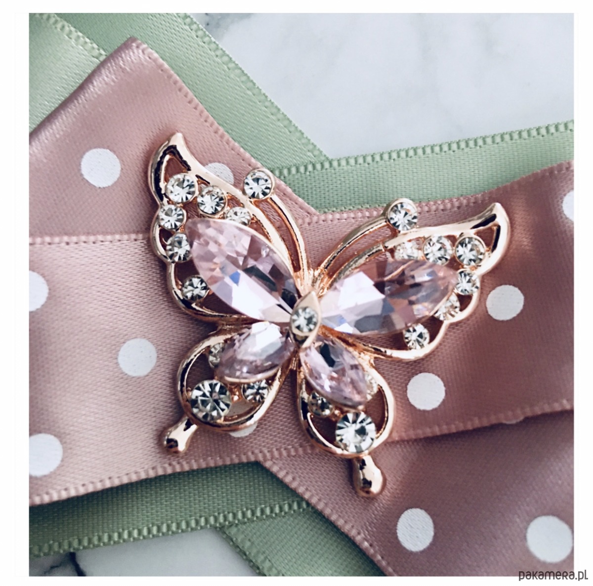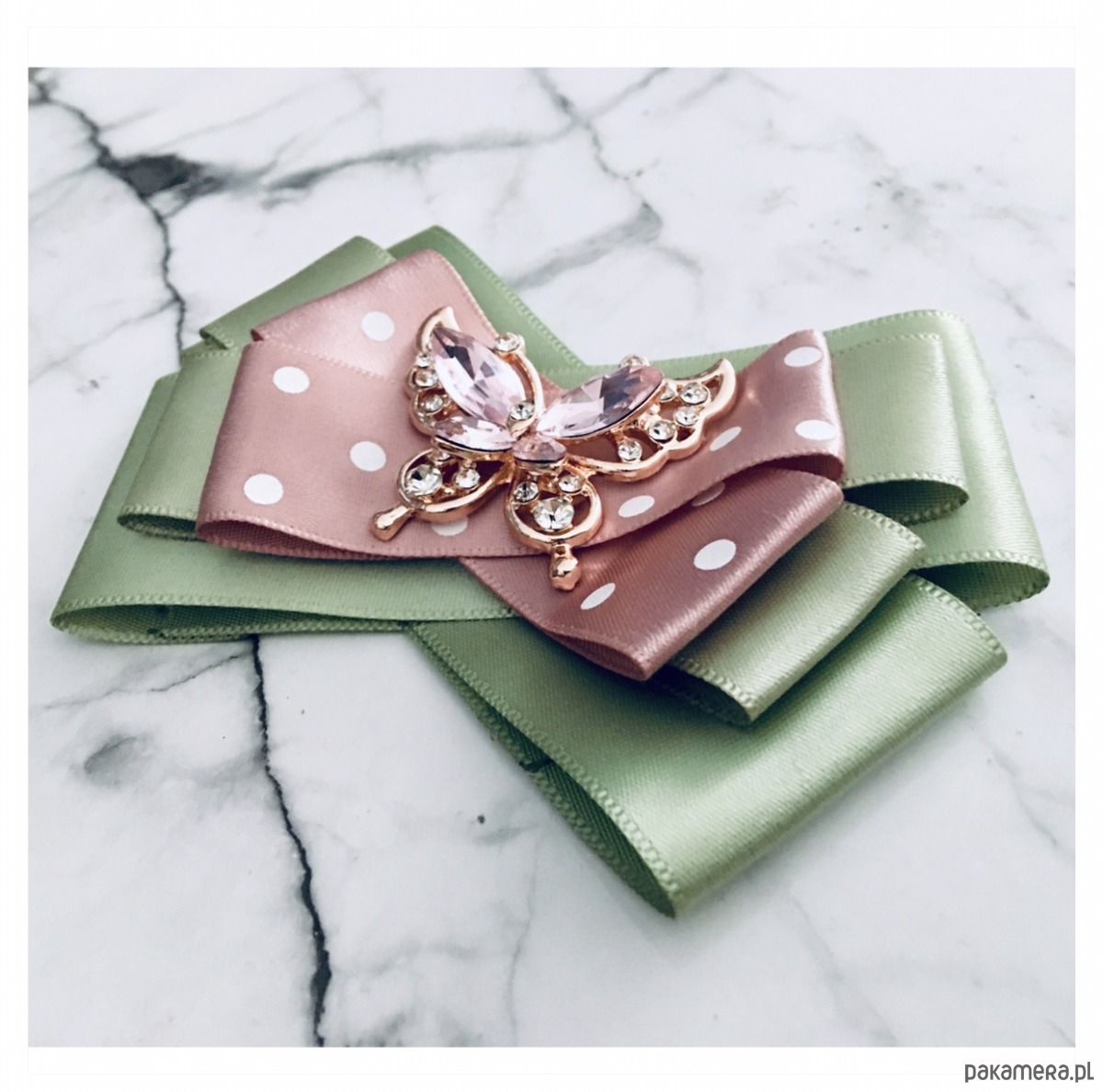Broszka wykonana z wysokiej jakości taśm i dodatków. Broszka w kolorach delikatnej zieleni i pudrowego różu. . Piękna dekoracyjna ozdoba na środku. Cudny Motylek w delikatnym złocie z kryształkami w kolorze pudrowego różu. . Będzie idealnie pasować zarówno do koszul, bluzek, swetrów, sukienek, żakietów oraz do płaszczy, kurtek, szali i chust. Idealna do każdej stylizacji, zarówno do sportowej jak również do eleganckich stylizacji.