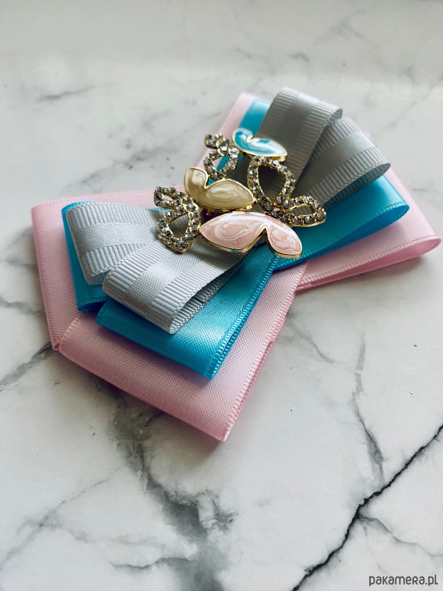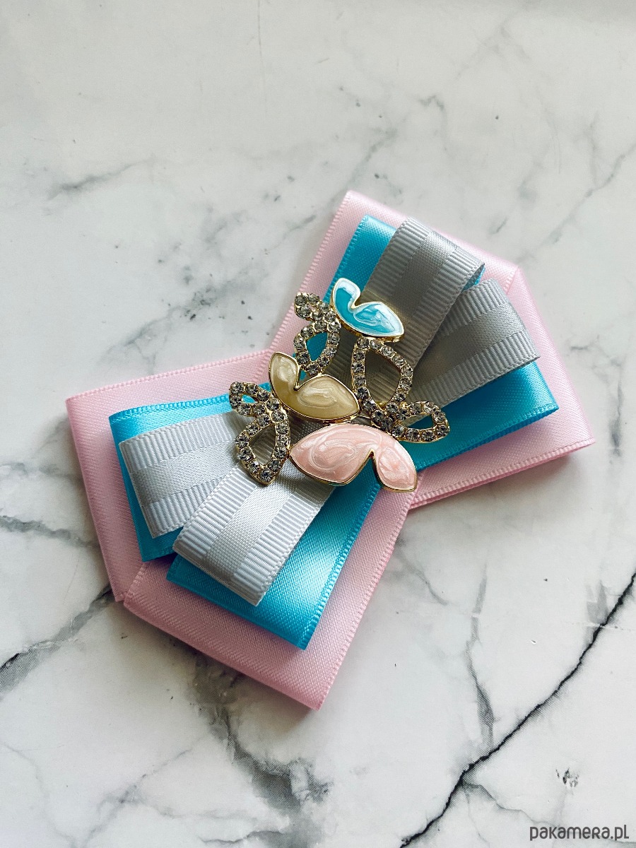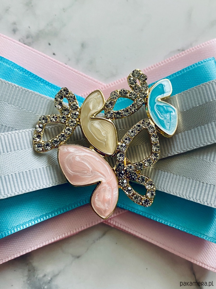 Na środku piękna i delikatna ozdoba biżuteryjna. Bardzo kobieca w delikatnych kolorach. Motylki w pastelowych odcieniach z delikatnymi kryształkami.