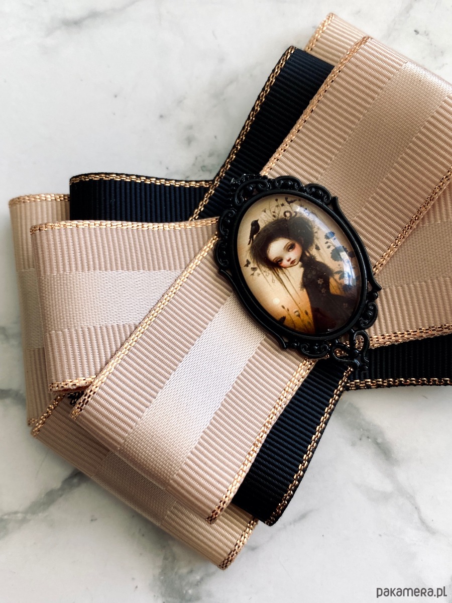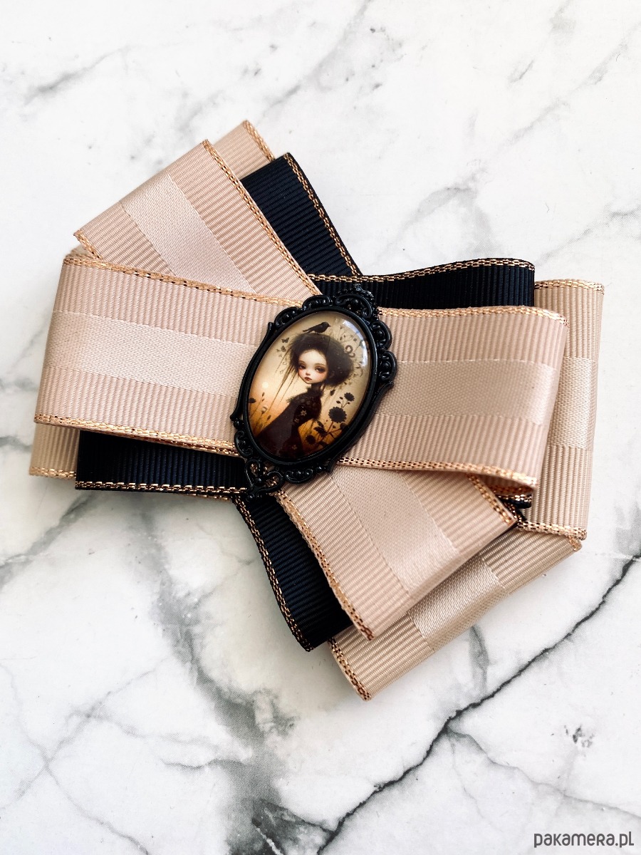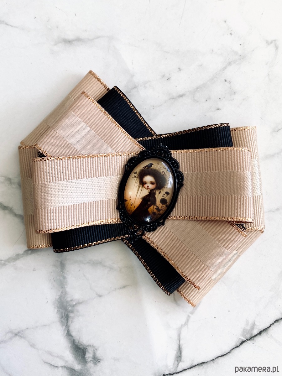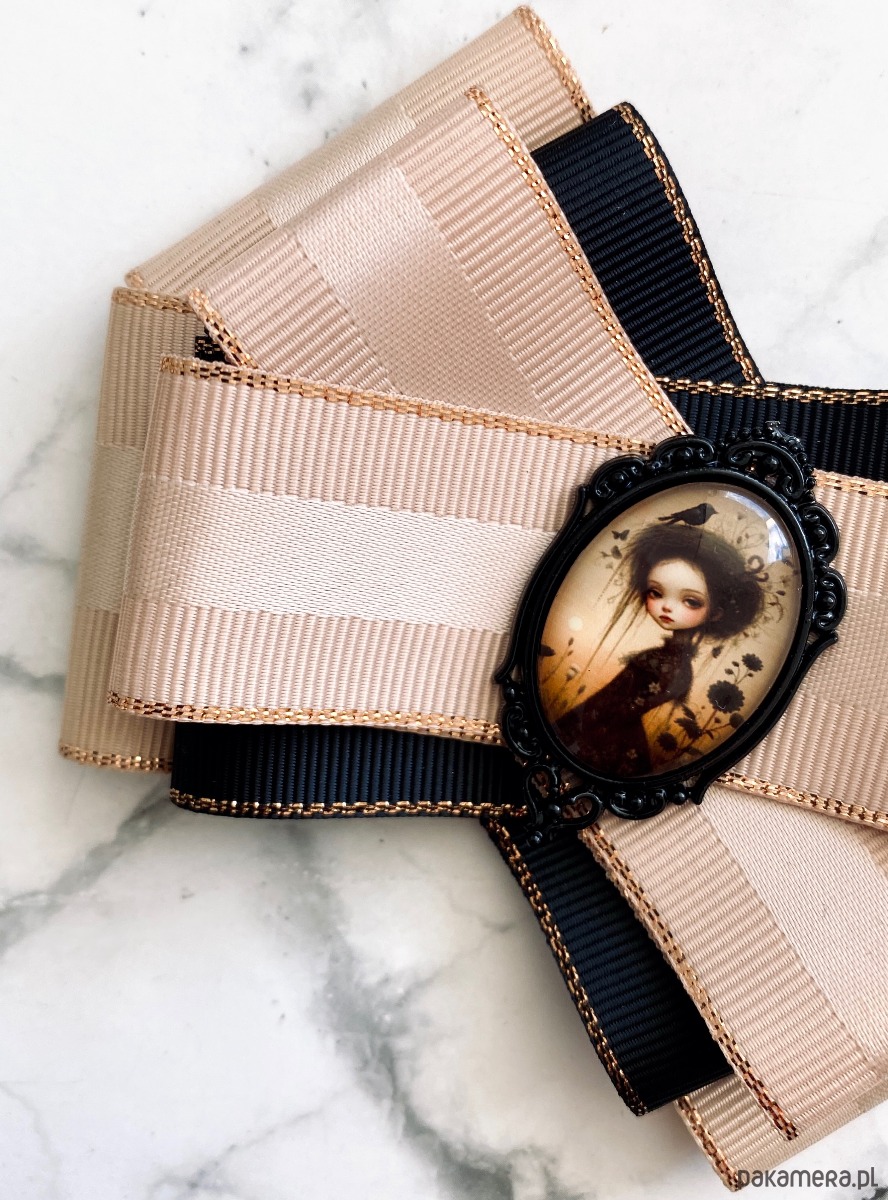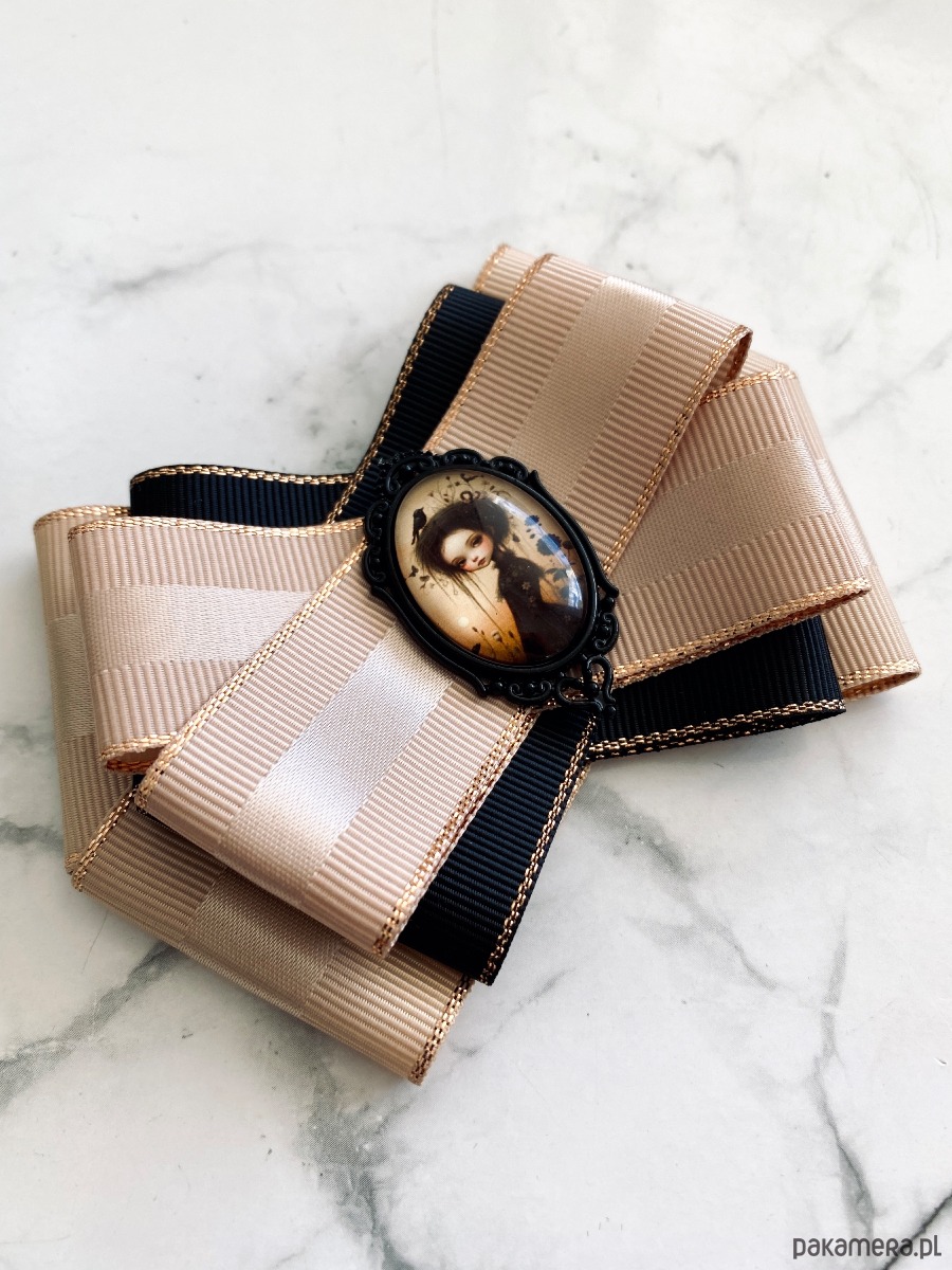 Broszka wykonana z wysokiej jakości taśm i dodatków.