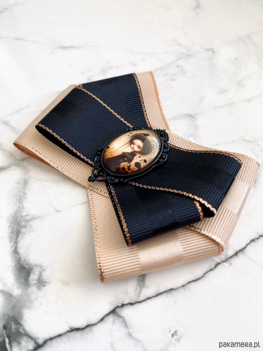 Broszka wykonana z wysokiej jakości taśm i dodatków.