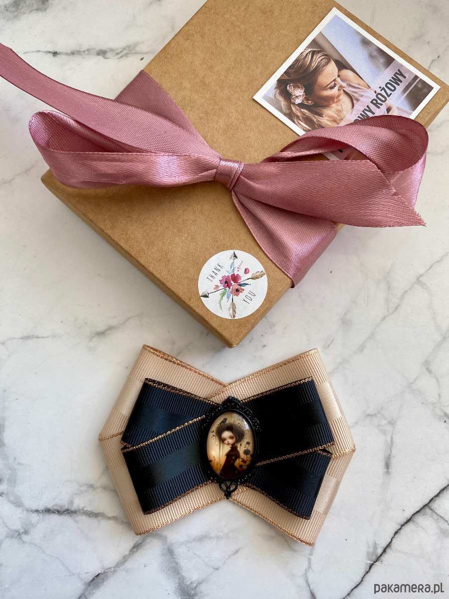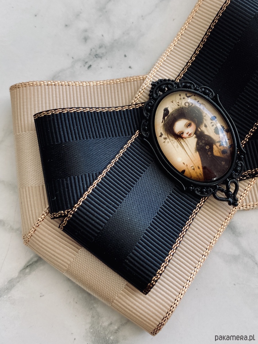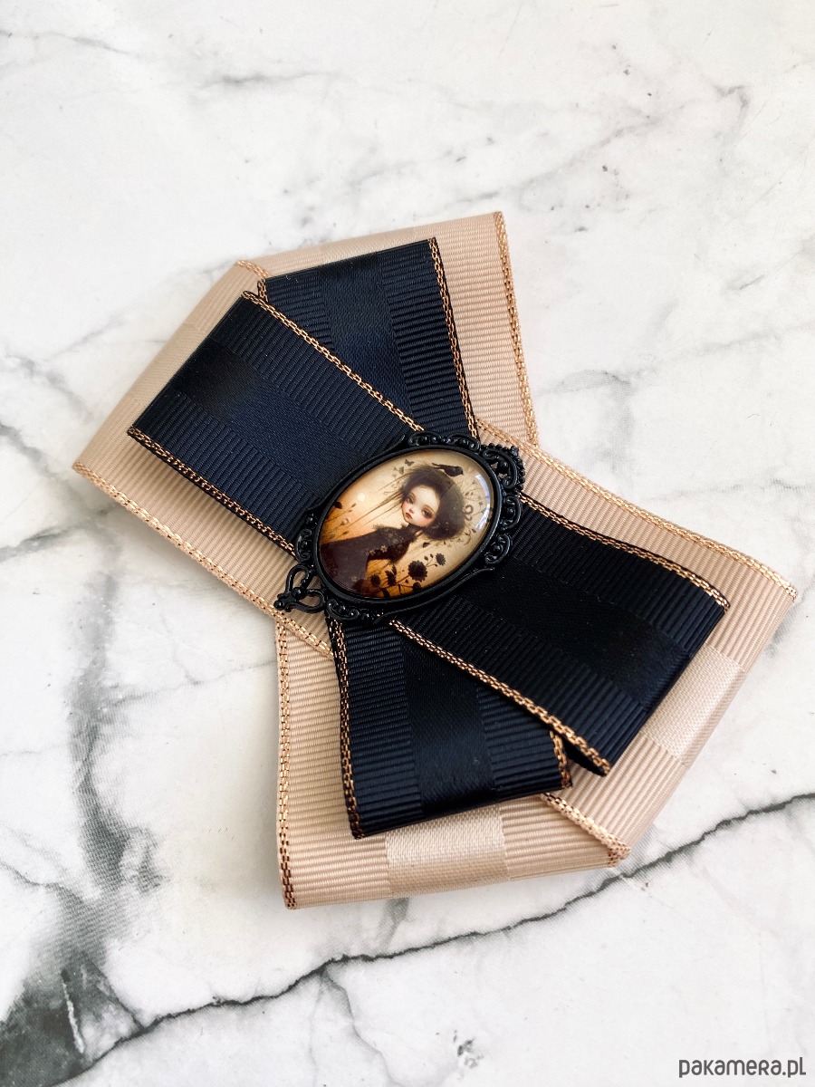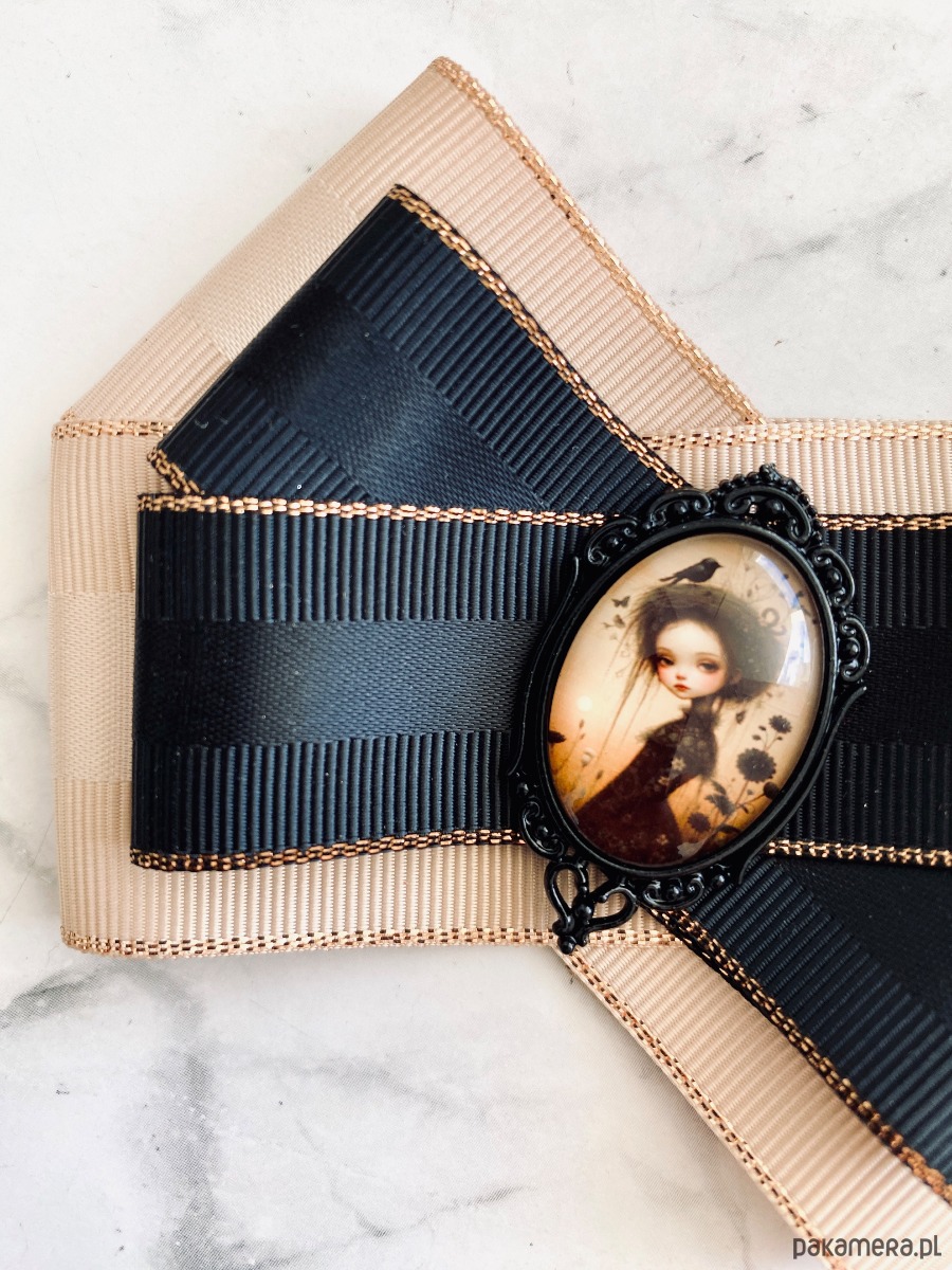 Broszka wykonana z wysokiej jakości taśm i dodatków.