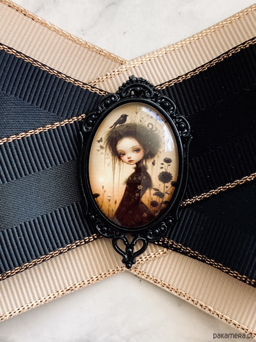 Piękna grafika zamknięta pod szklanym kaboszonem oprawionym w ażurowej oprawie Mroczna dziewczynka w artystycznej odsłonie. Nowoczesność w połączeniu z klasyką w najlepszym wydaniu.