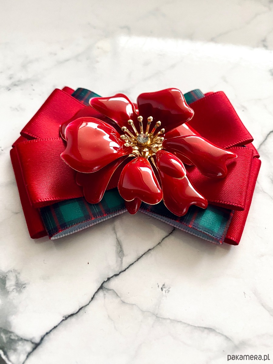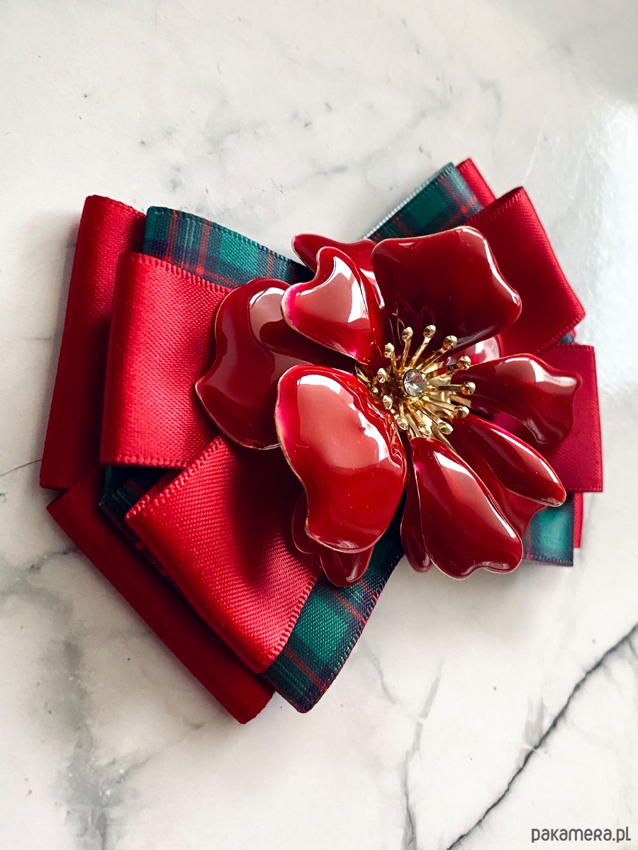 Na środku niesamowita ozdoba biżuteryjna. Kwiat wykonany z masy w przepięknym kolorze głębokiej czerwieni z dodatkiem kryształków.