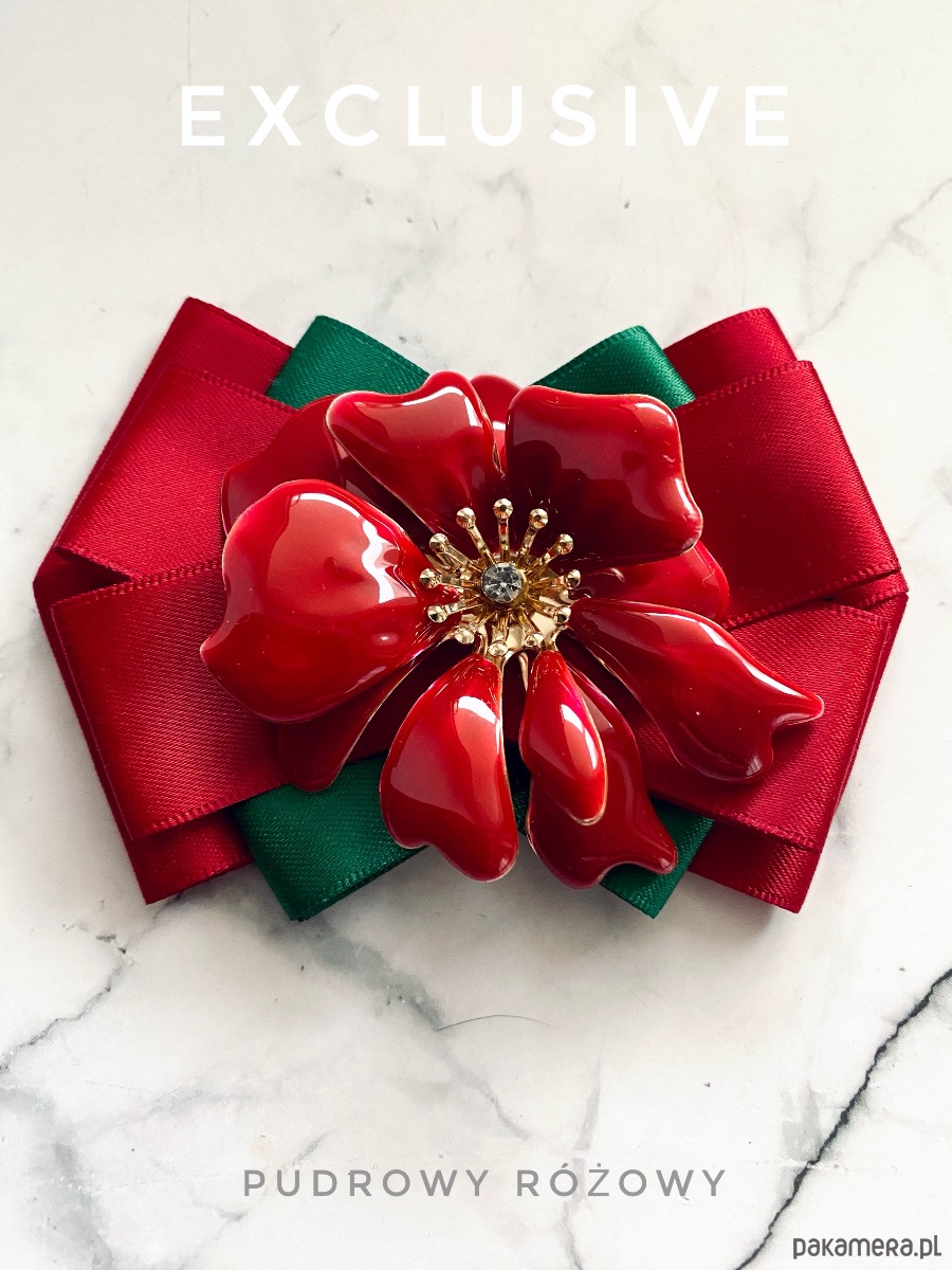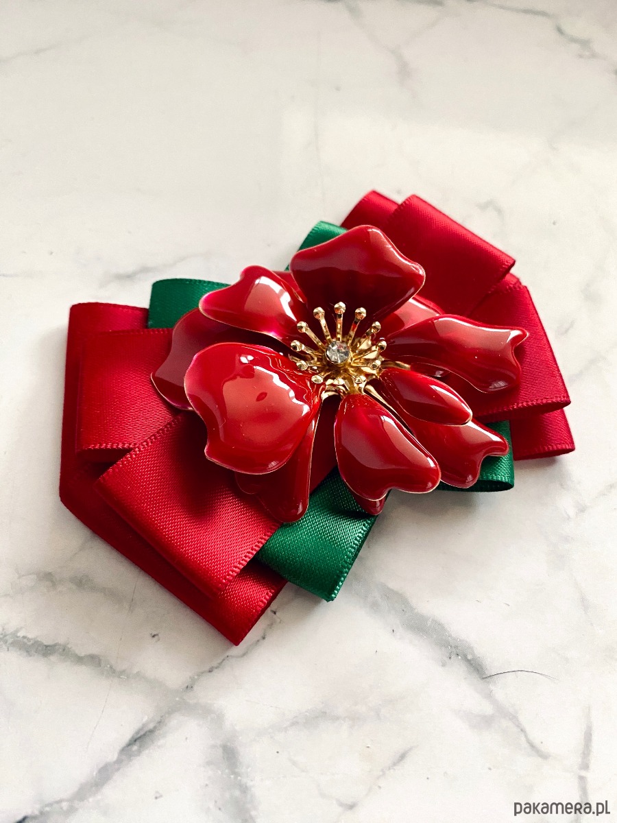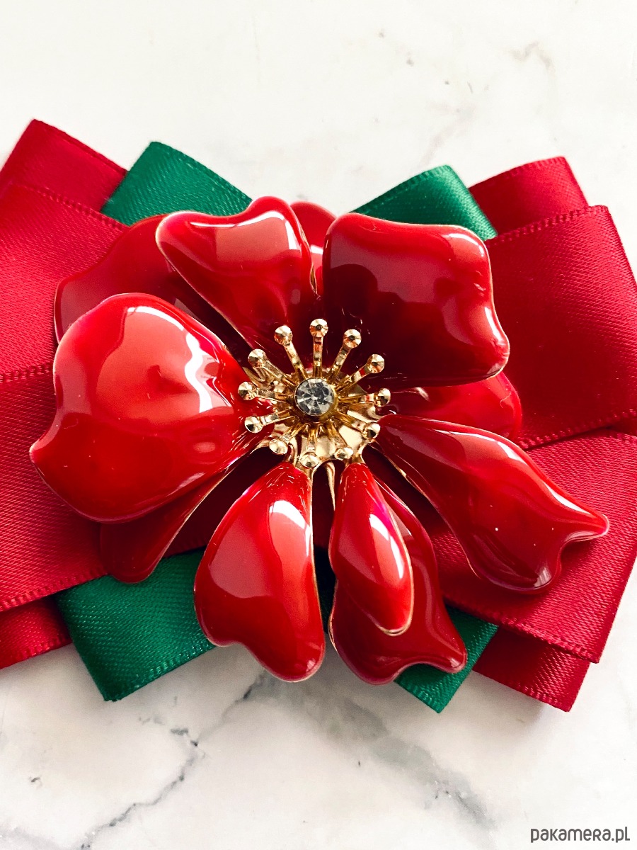 Na środku niesamowita ozdoba biżuteryjna. Kwiat wykonany z masy w przepięknym kolorze głębokiej czerwieni z dodatkiem kryształków.
