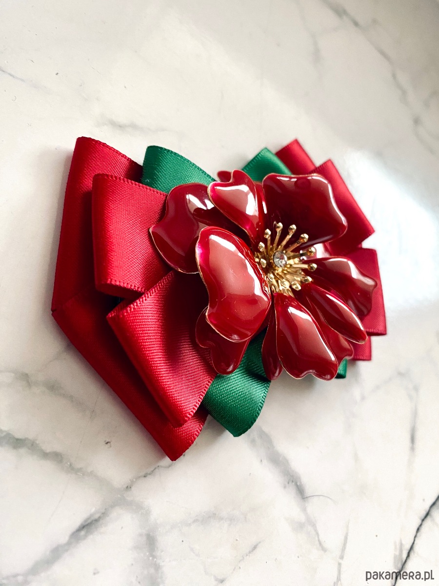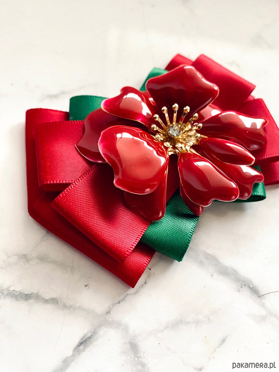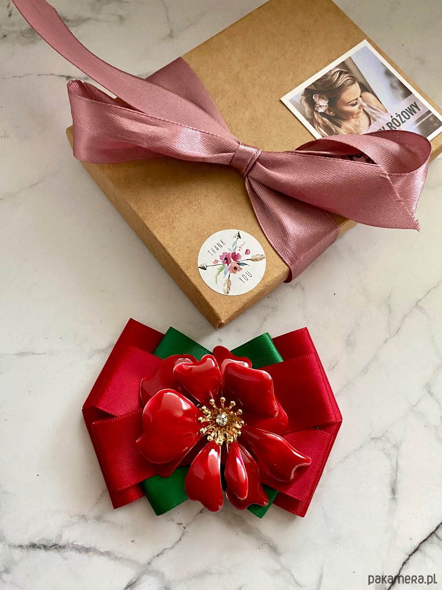 Na środku niesamowita ozdoba biżuteryjna. Kwiat wykonany z masy w przepięknym kolorze głębokiej czerwieni z dodatkiem kryształków.