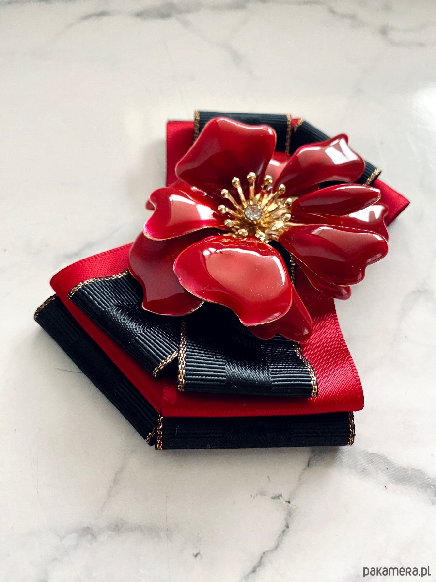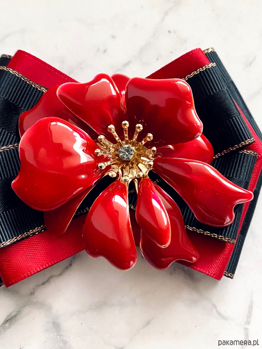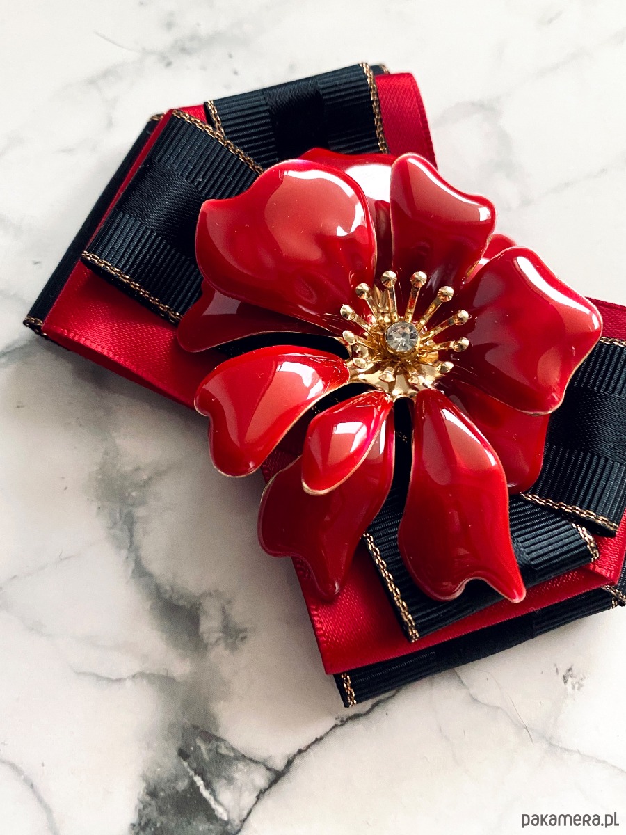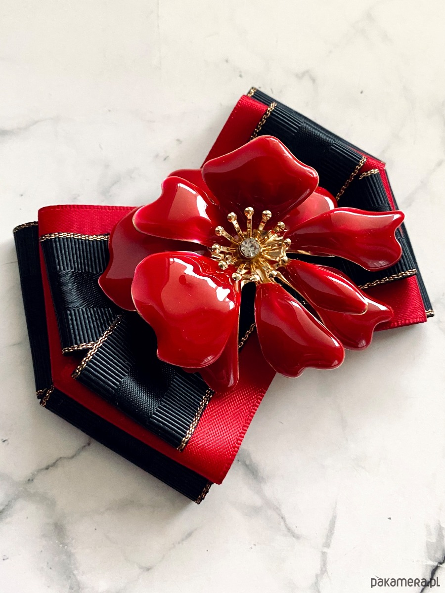 Na środku niesamowita ozdoba biżuteryjna. Kwiat wykonany z masy w przepięknym kolorze głębokiej czerwieni z dodatkiem kryształków.