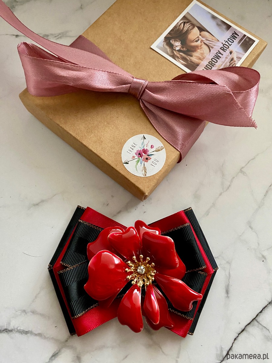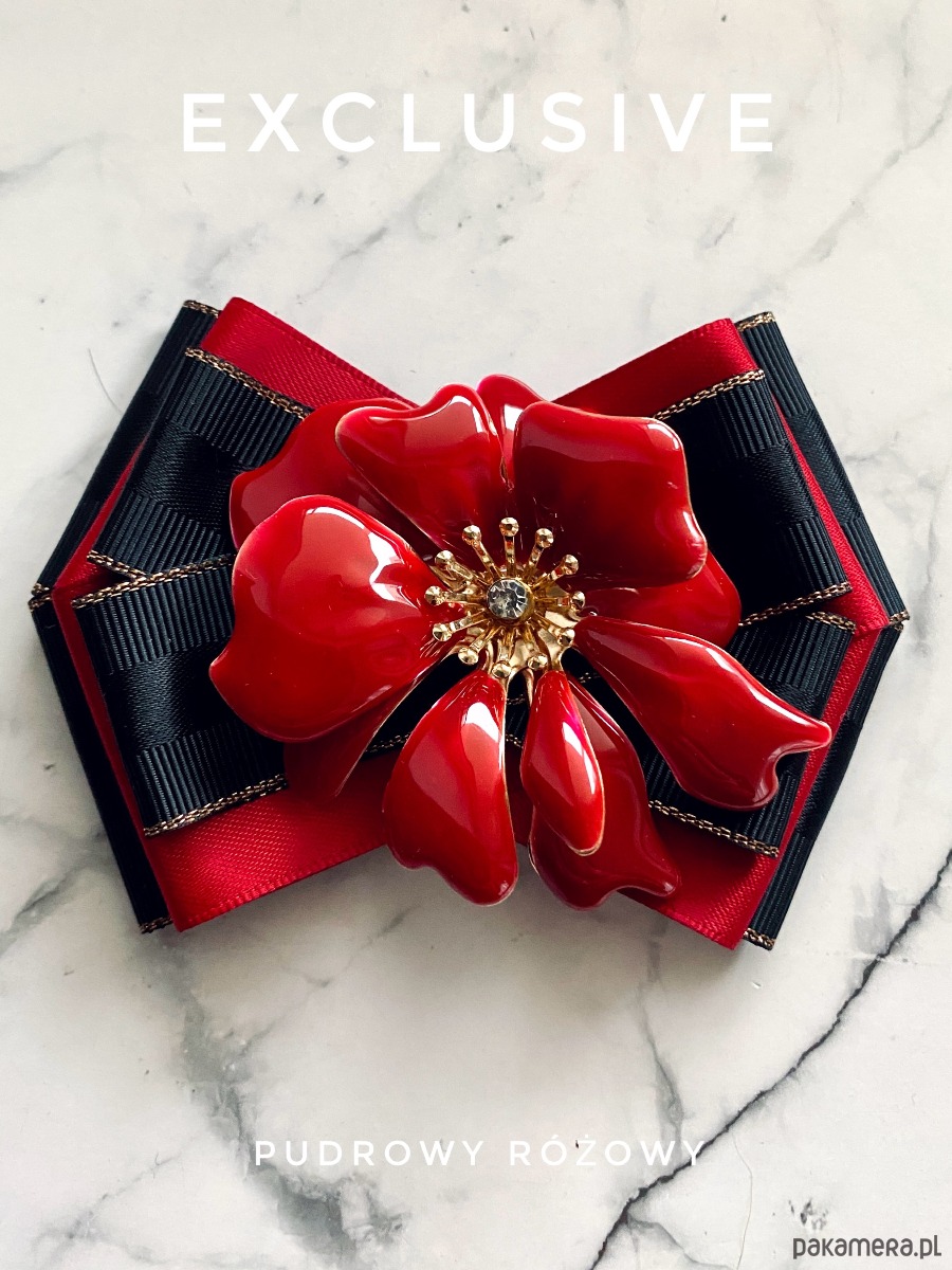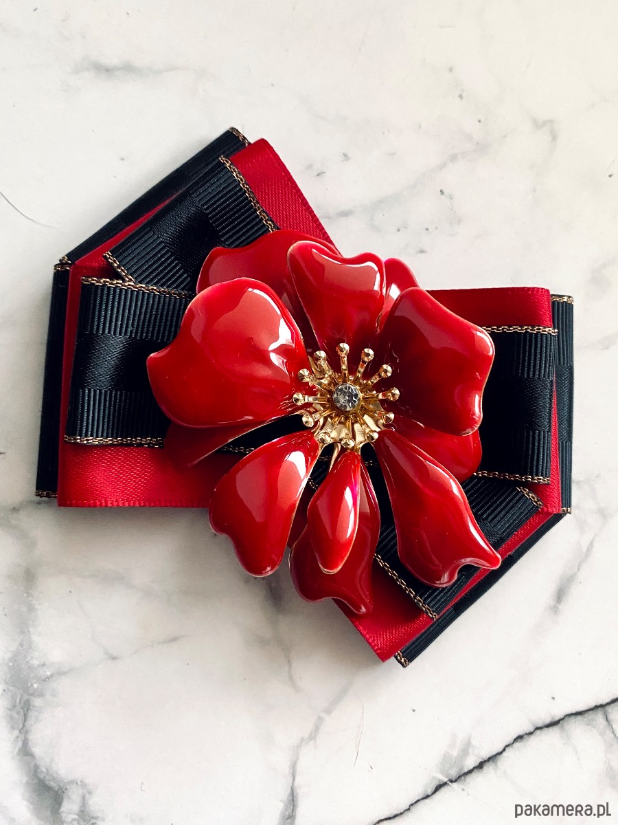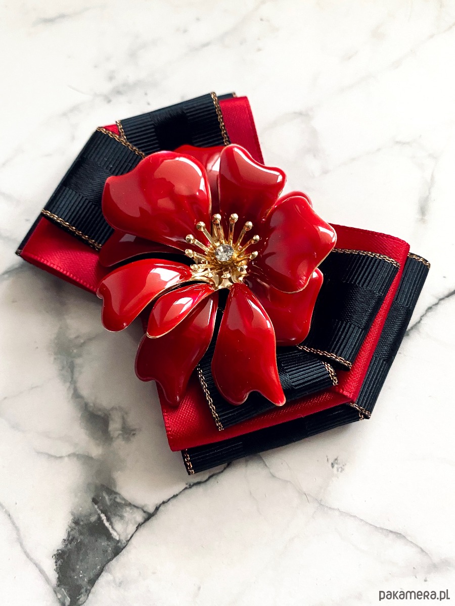 Na środku niesamowita ozdoba biżuteryjna. Kwiat wykonany z masy w przepięknym kolorze głębokiej czerwieni z dodatkiem kryształków.