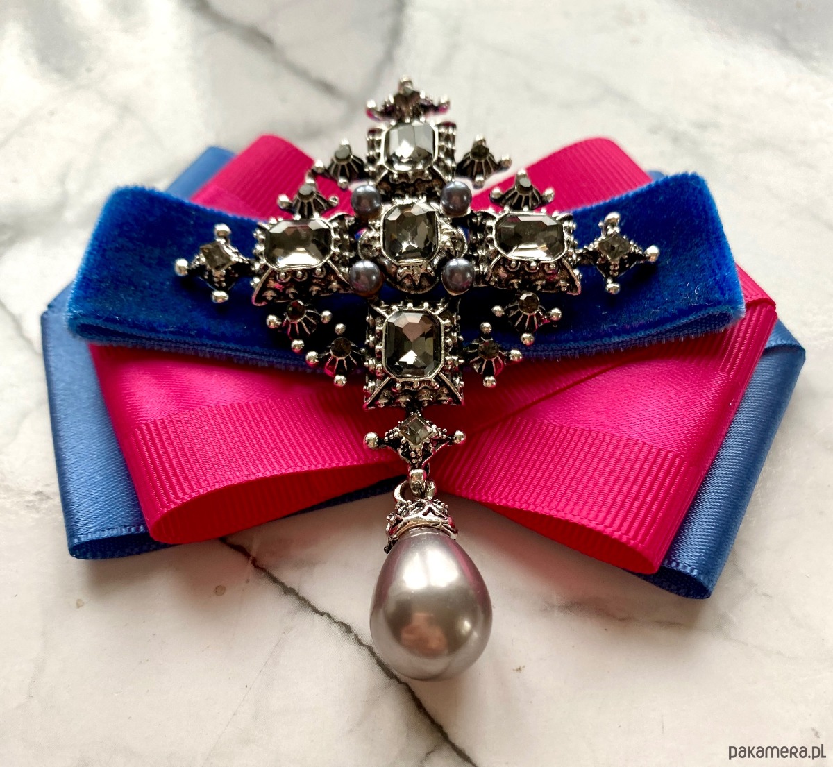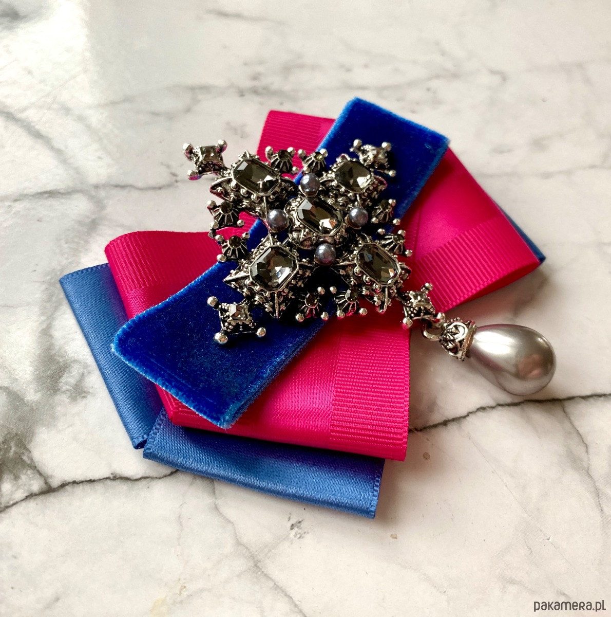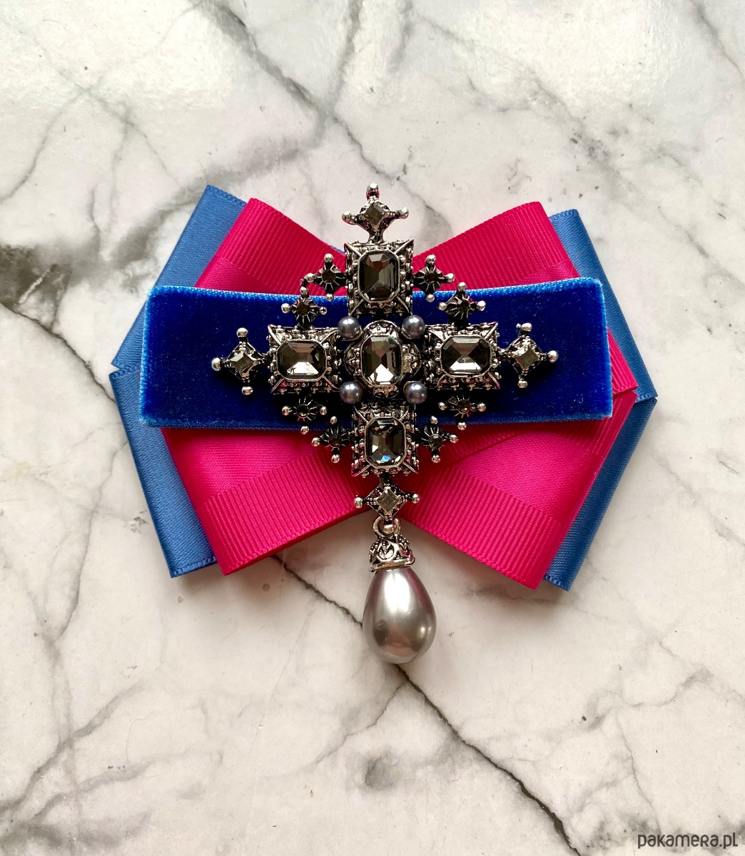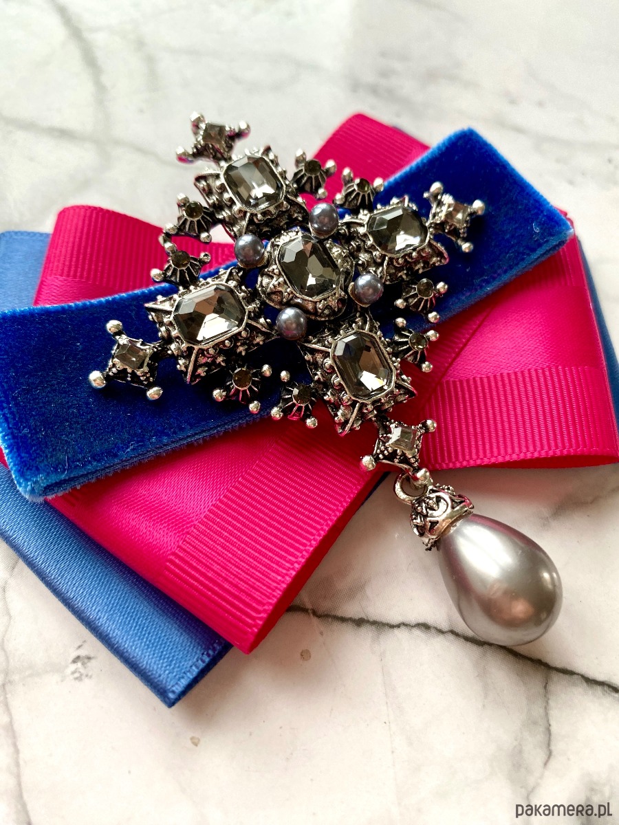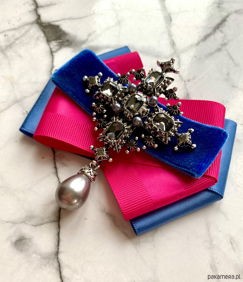 Broszka wykonana z wysokiej jakości taśm i dodatków. Na środku naszyta ogromna ozdoba wykonana z szlifowanych kryształków w kolorze ciemno szarym. Wisząca szara perła dodaje elegancji i stylu. Ozdoba jest mega imponująca, kryształy pięknie odbijają światło.