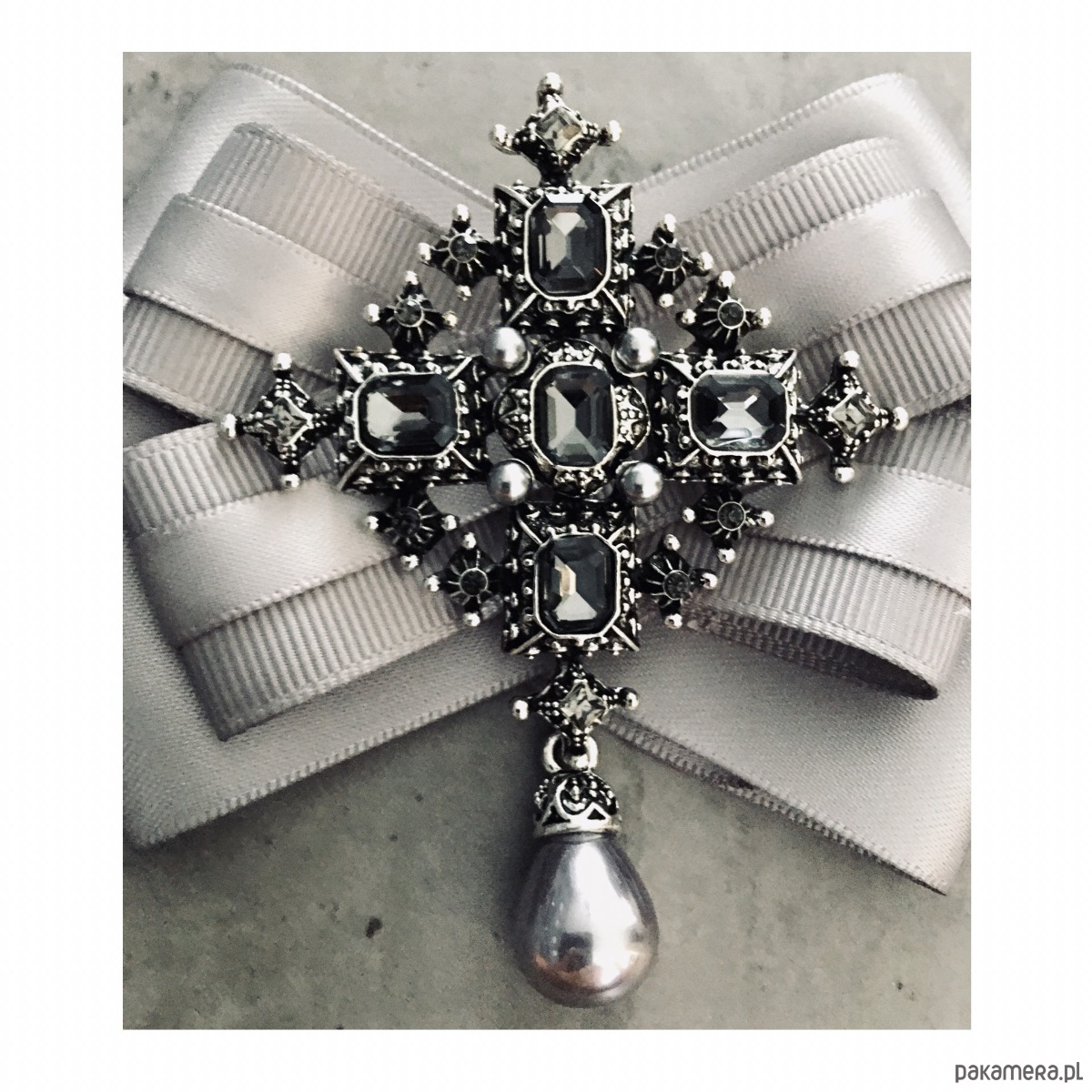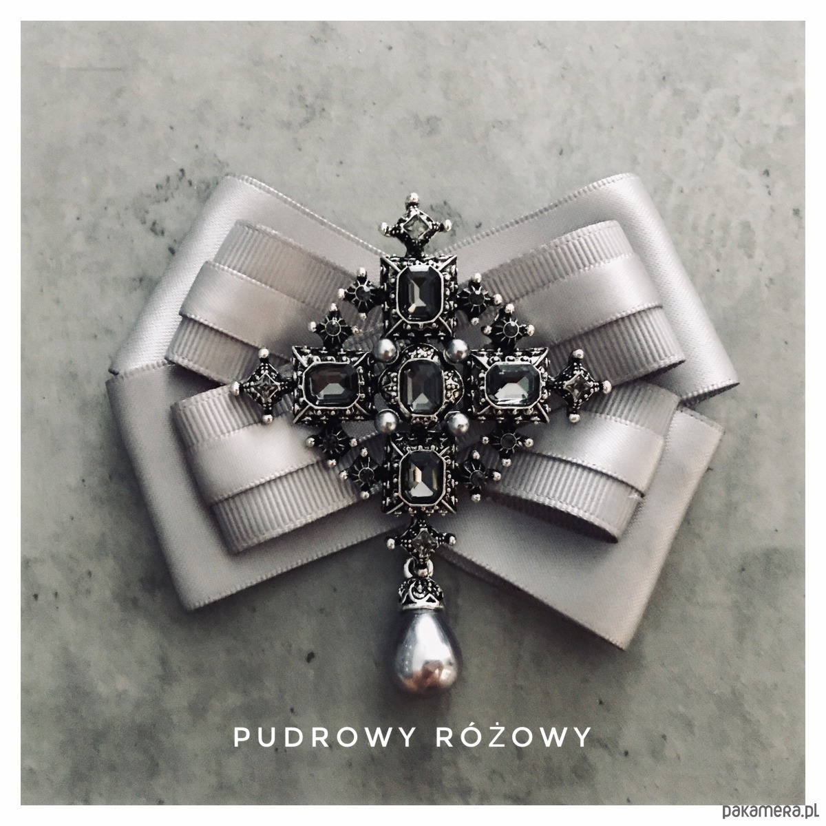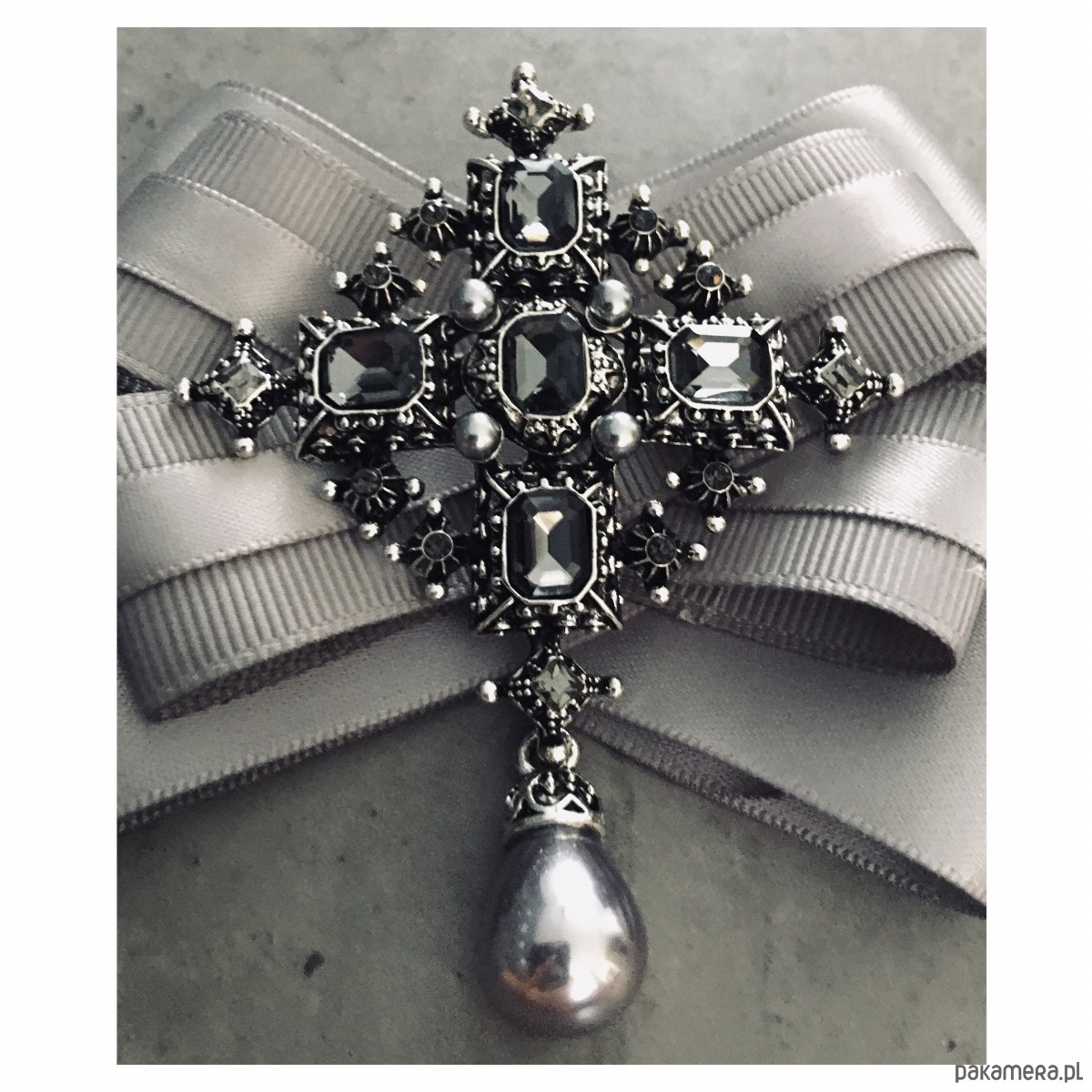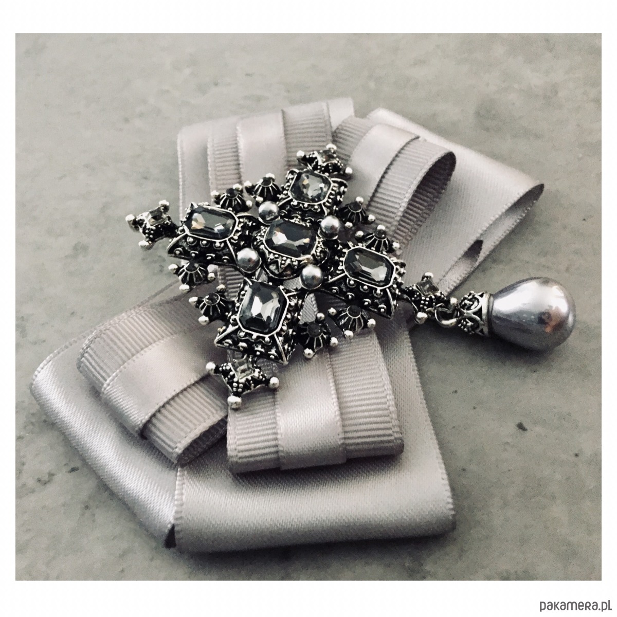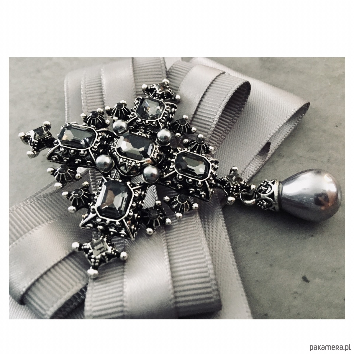 Broszka wykonana z wysokiej jakości taśm i dodatków. Broszka w kolorze stalowym/ kolor szarości. Na środku naszyta ogromna ozdoba wykonana z szlifowanych kryształków w kolorze ciemno szarym. Wisząca szara perła dodaje elegancji i stylu. Ozdoba jest mega imponująca, kryształy pięknie odbijają światło.