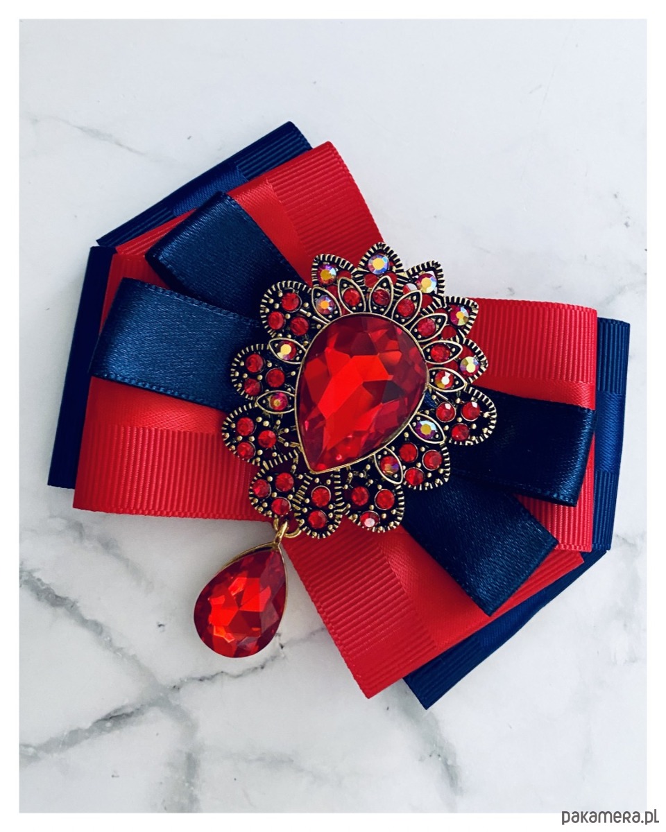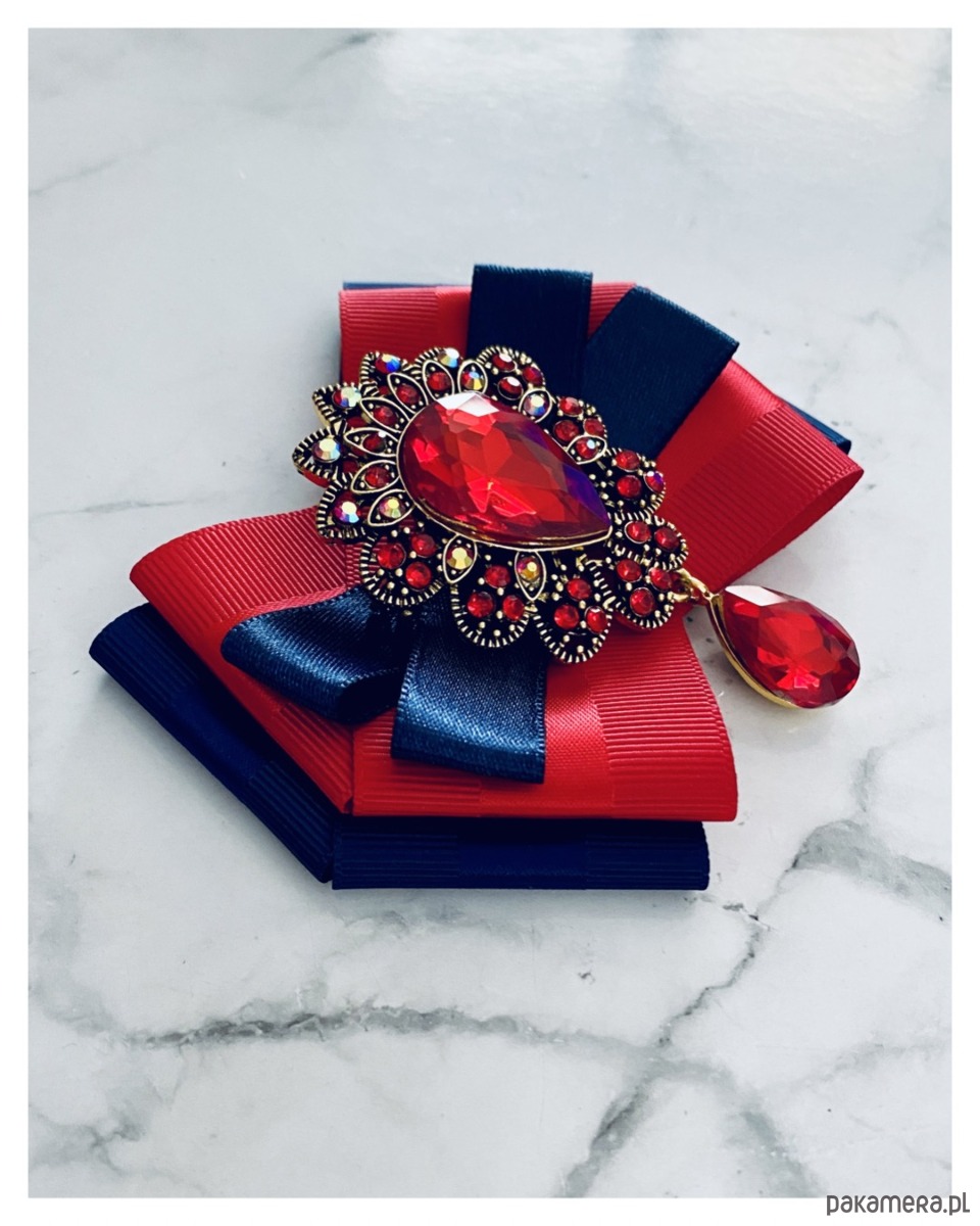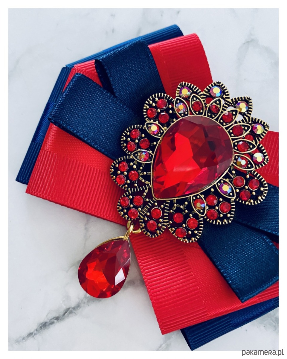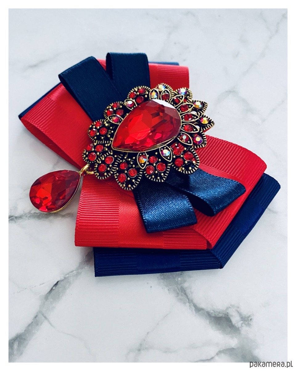 Broszka wykonana z wysokiej jakości taśm i dodatków. Brosza w kolorze szlachetnego granatu i czerwieni. Na środku naszyta prześliczna ozdoba biżuteryjna ogromny kryształ w kolorze czerwonym w ażurowej oprawie z dodatkiem drobnych kryształków. Będzie idealnie pasować zarówno do koszul, bluzek, swetrów, sukienek, żakietów oraz do płaszczy, kurtek, szali i chust. Idealna do każdej stylizacji, zarówno do sportowej jak również do eleganckich stylizacji.