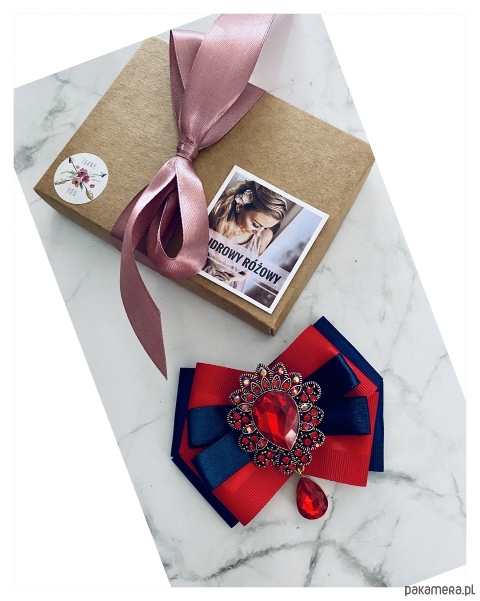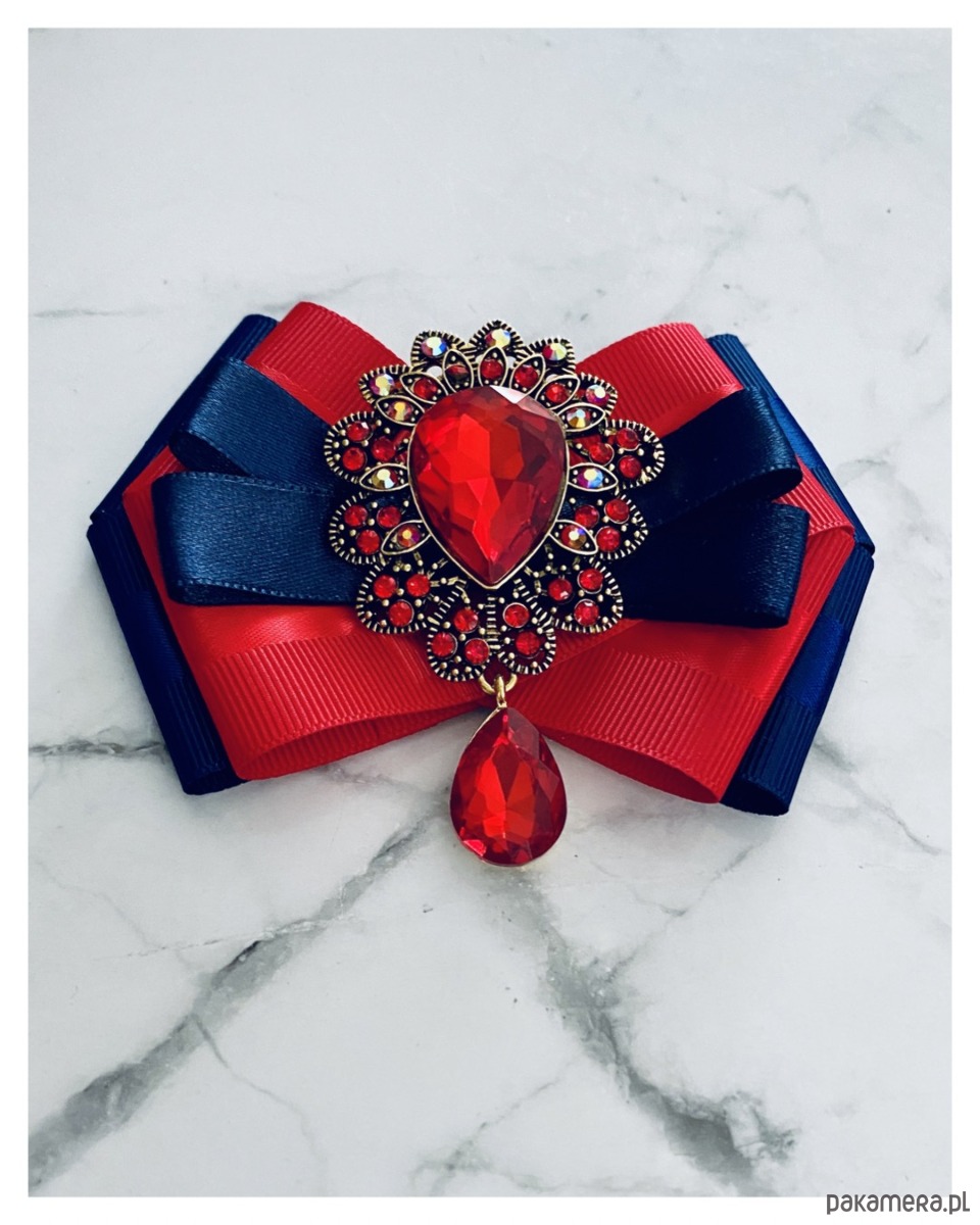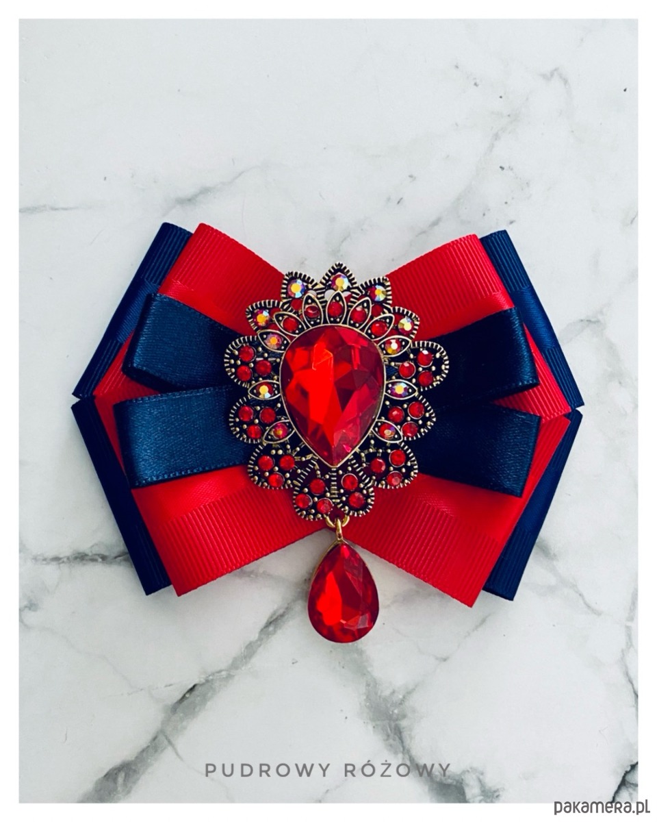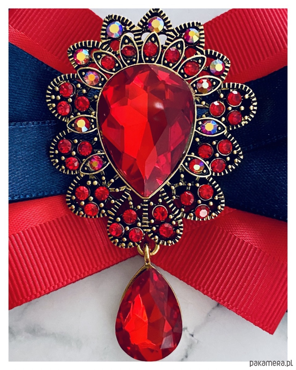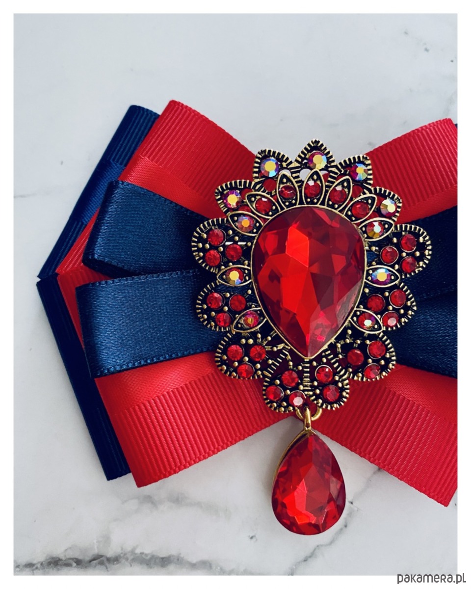 Broszka wykonana z wysokiej jakości taśm i dodatków. Brosza w kolorze szlachetnego granatu i czerwieni. Na środku naszyta prześliczna ozdoba biżuteryjna ogromny kryształ w kolorze czerwonym w ażurowej oprawie z dodatkiem drobnych kryształków. Będzie idealnie pasować zarówno do koszul, bluzek, swetrów, sukienek, żakietów oraz do płaszczy, kurtek, szali i chust. Idealna do każdej stylizacji, zarówno do sportowej jak również do eleganckich stylizacji.