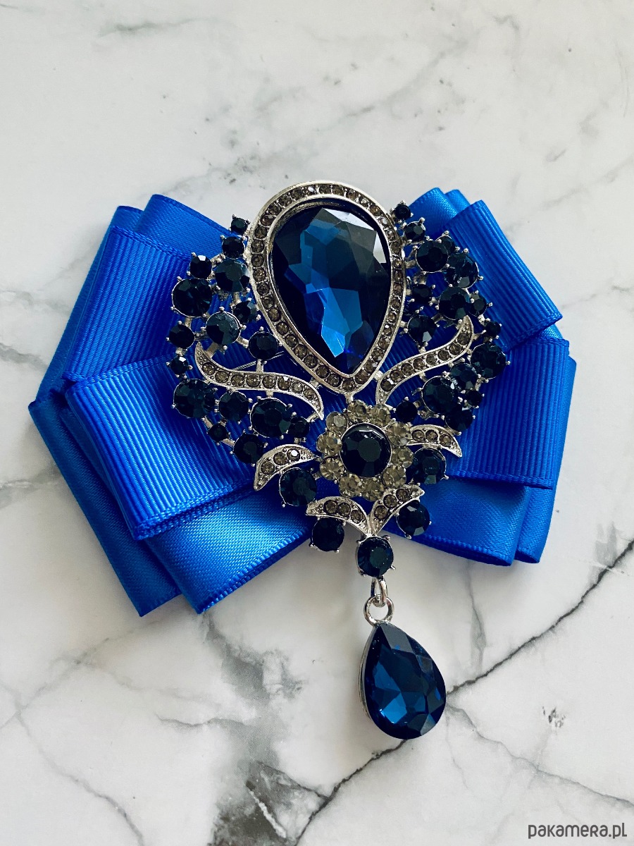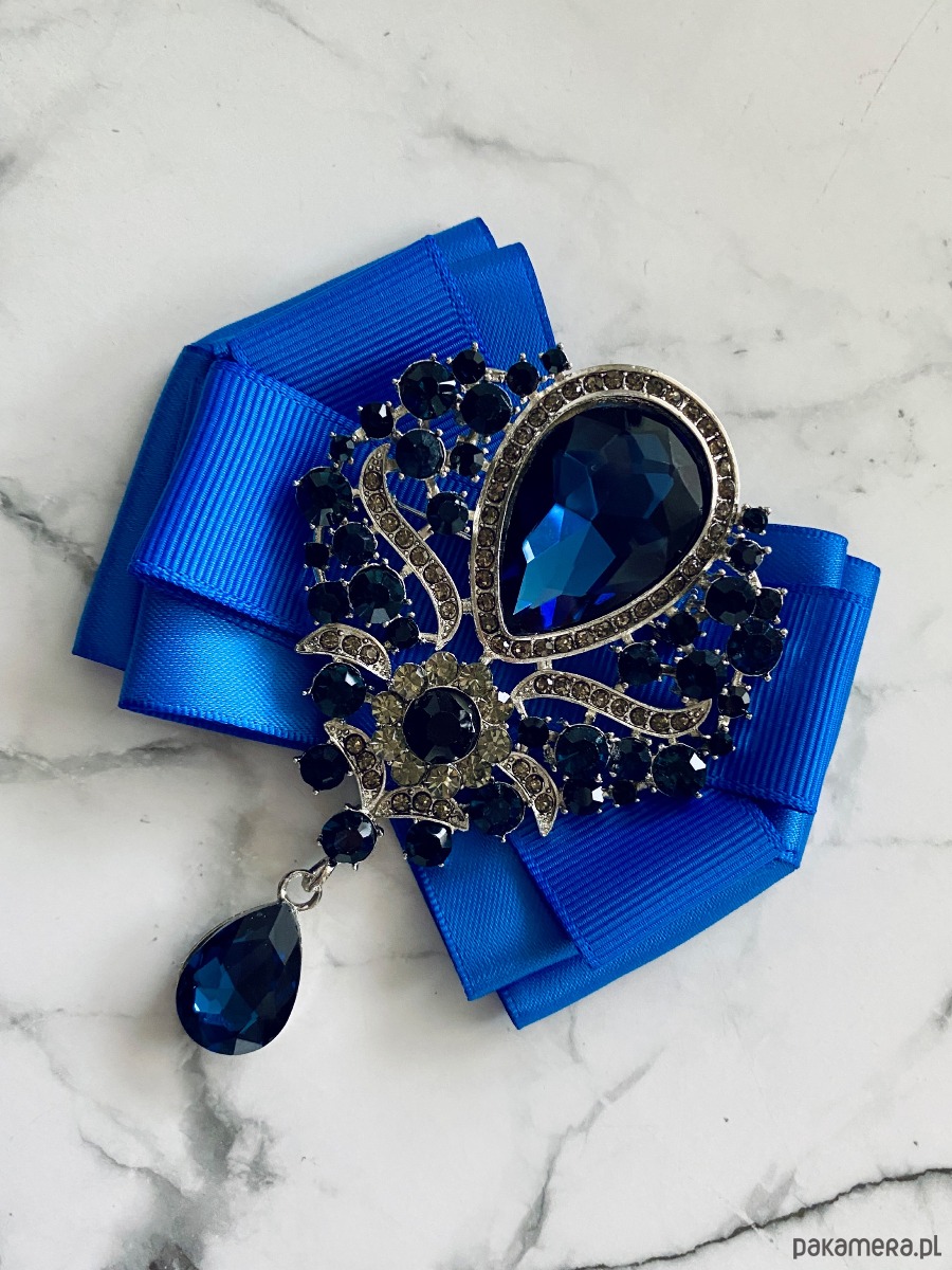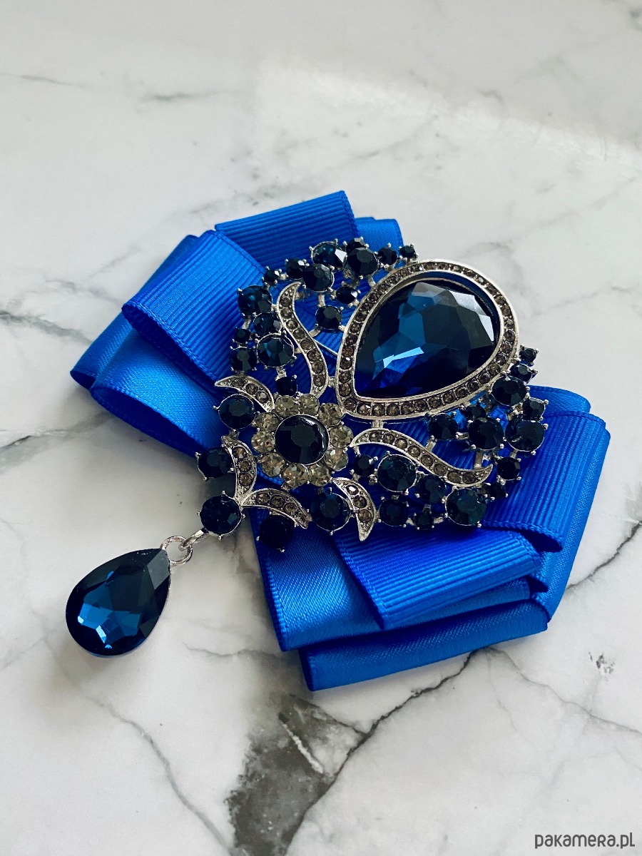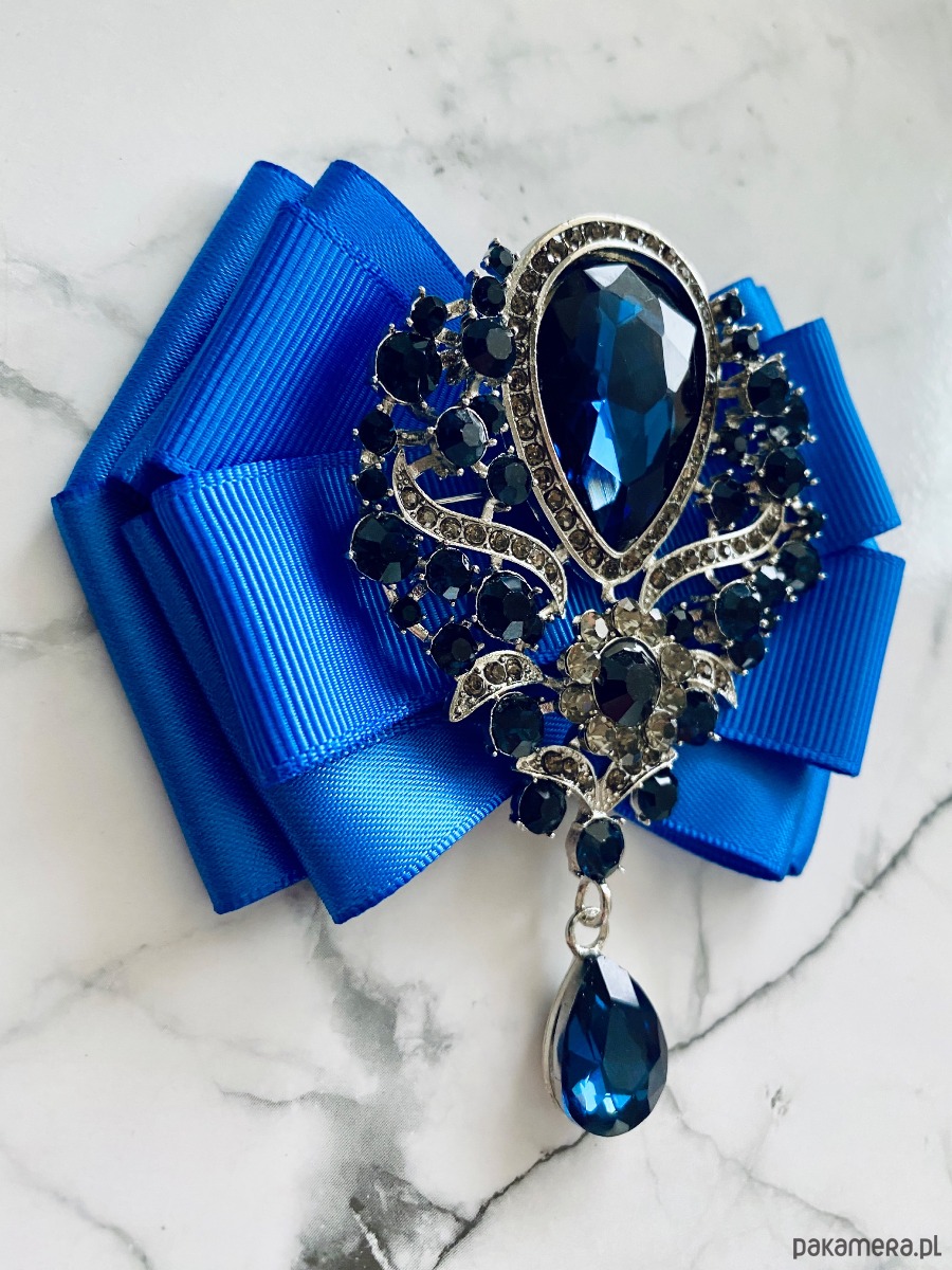 Broszka wykonana z wysokiej jakości taśm i dodatków. Brosza w kolorze niebieskim chabrowym. Ten pięknie szlifowany kryształ cudnie odbija światło i sprawia, że brosza jest jedyną w swoim rodzaju.