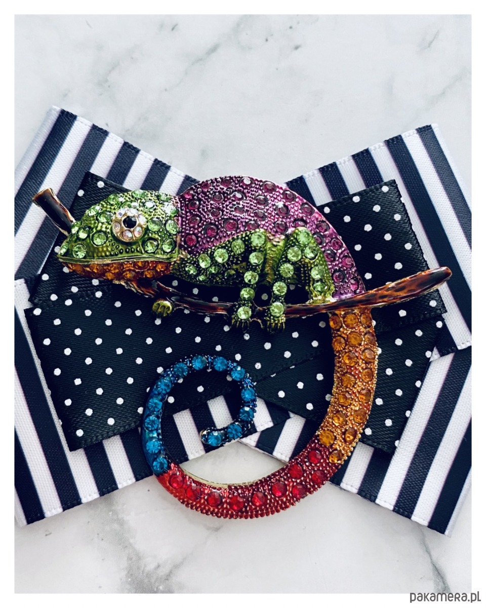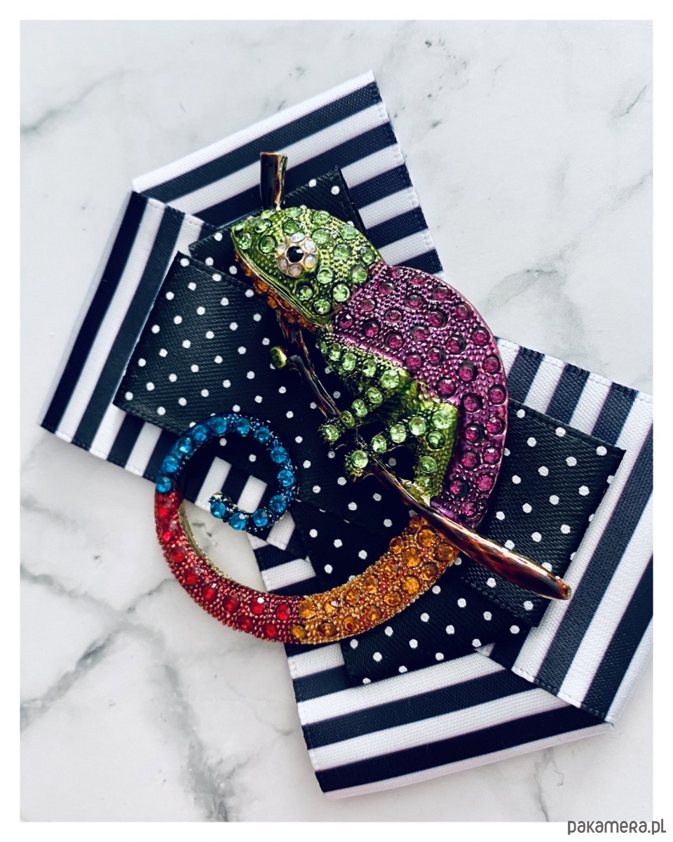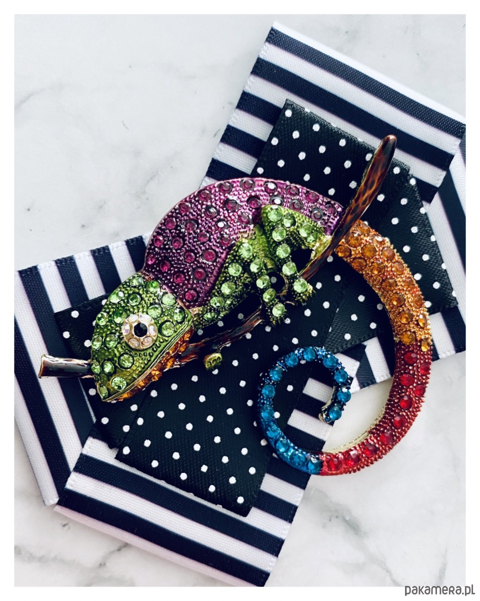 Na środku olbrzymia ozdoba biżuteryjna, .niesamowity Kameleon wykonany z drobnych kolorowych kryształków.
