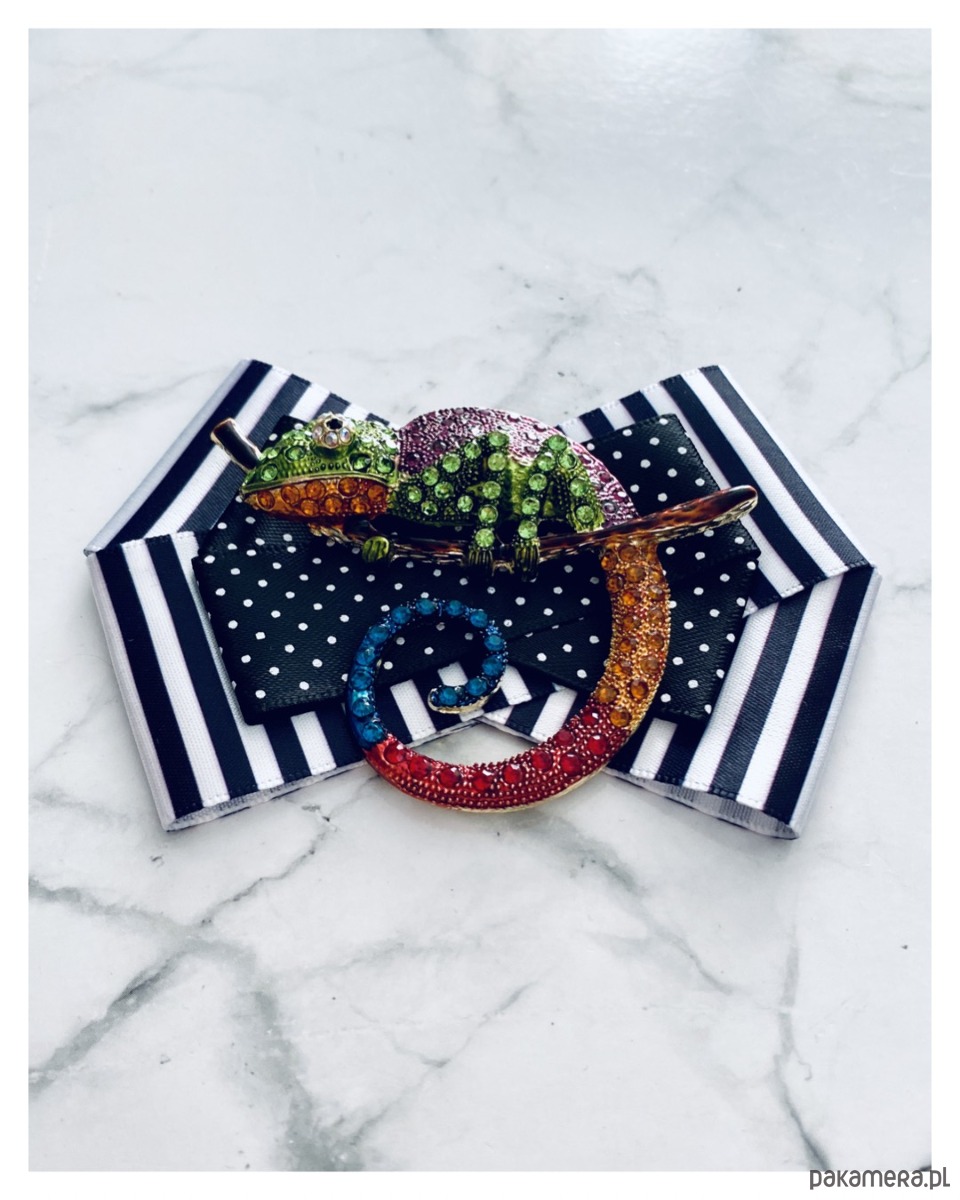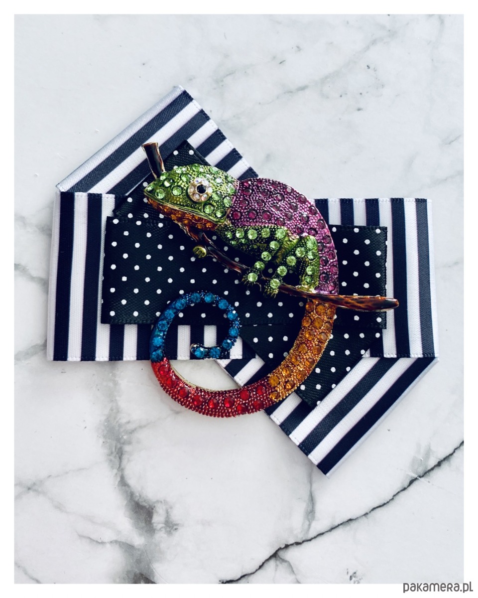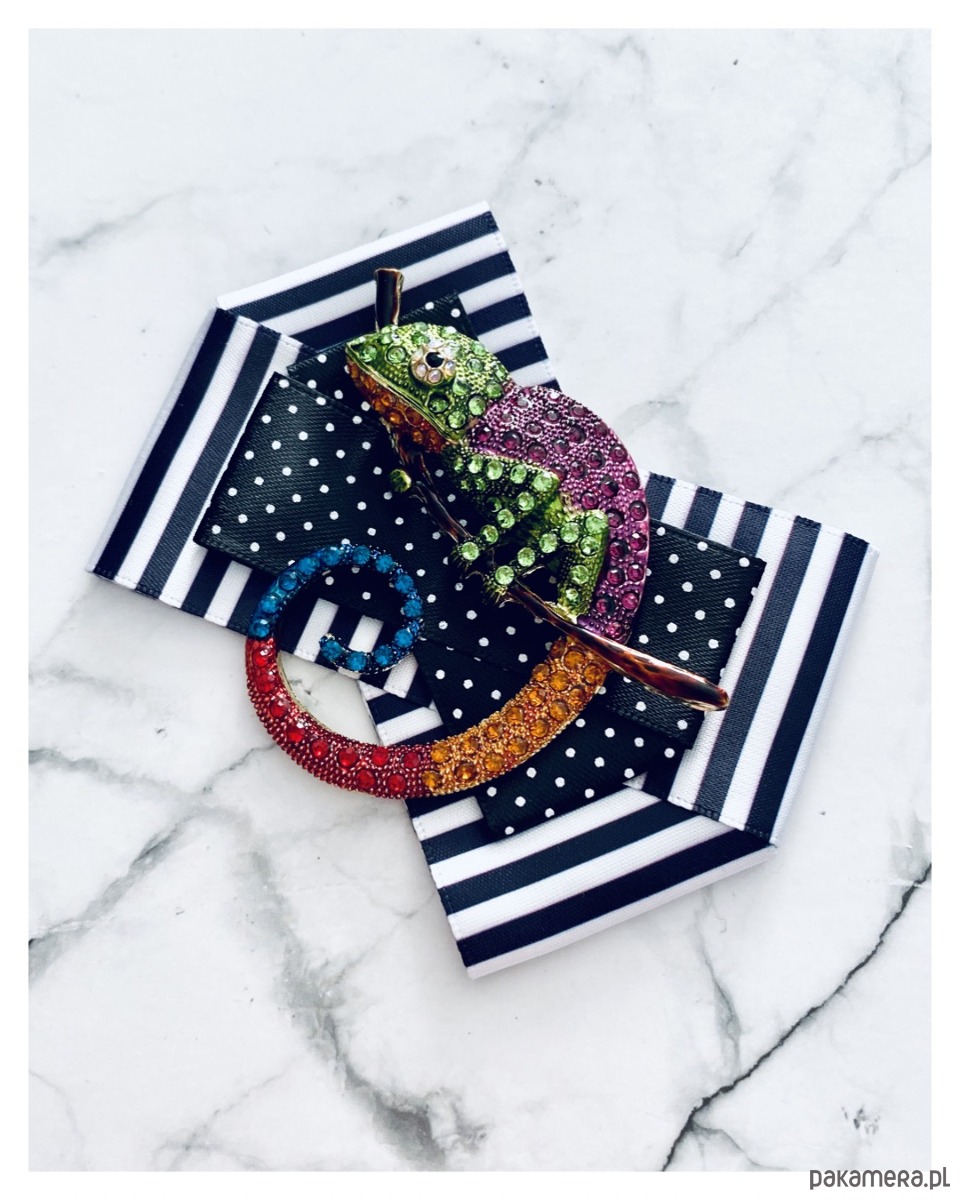 Na środku olbrzymia ozdoba biżuteryjna, .niesamowity Kameleon wykonany z drobnych kolorowych kryształków.