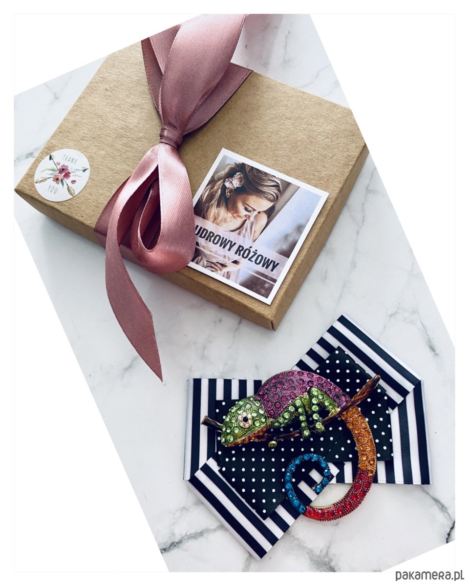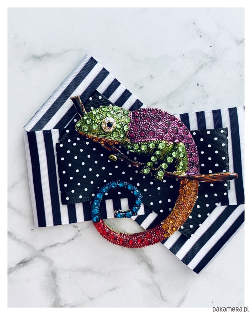 Na środku olbrzymia ozdoba biżuteryjna, .niesamowity Kameleon wykonany z drobnych kolorowych kryształków.