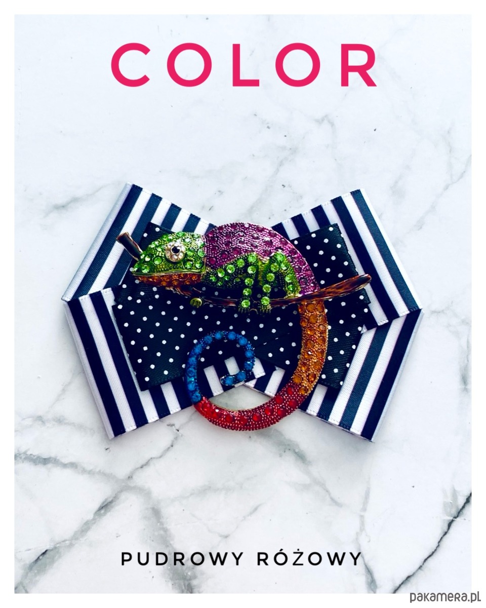 Na środku olbrzymia ozdoba biżuteryjna, .niesamowity Kameleon wykonany z drobnych kolorowych kryształków.