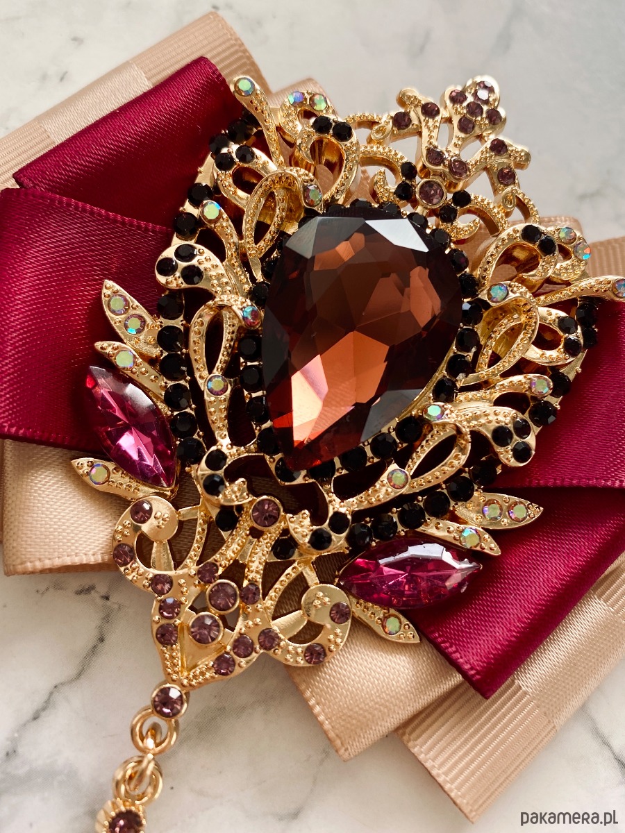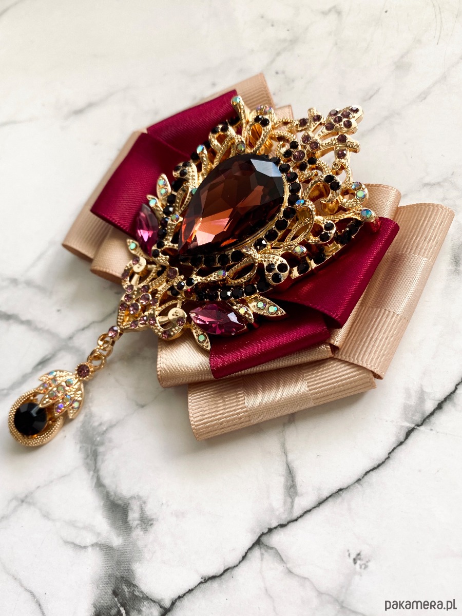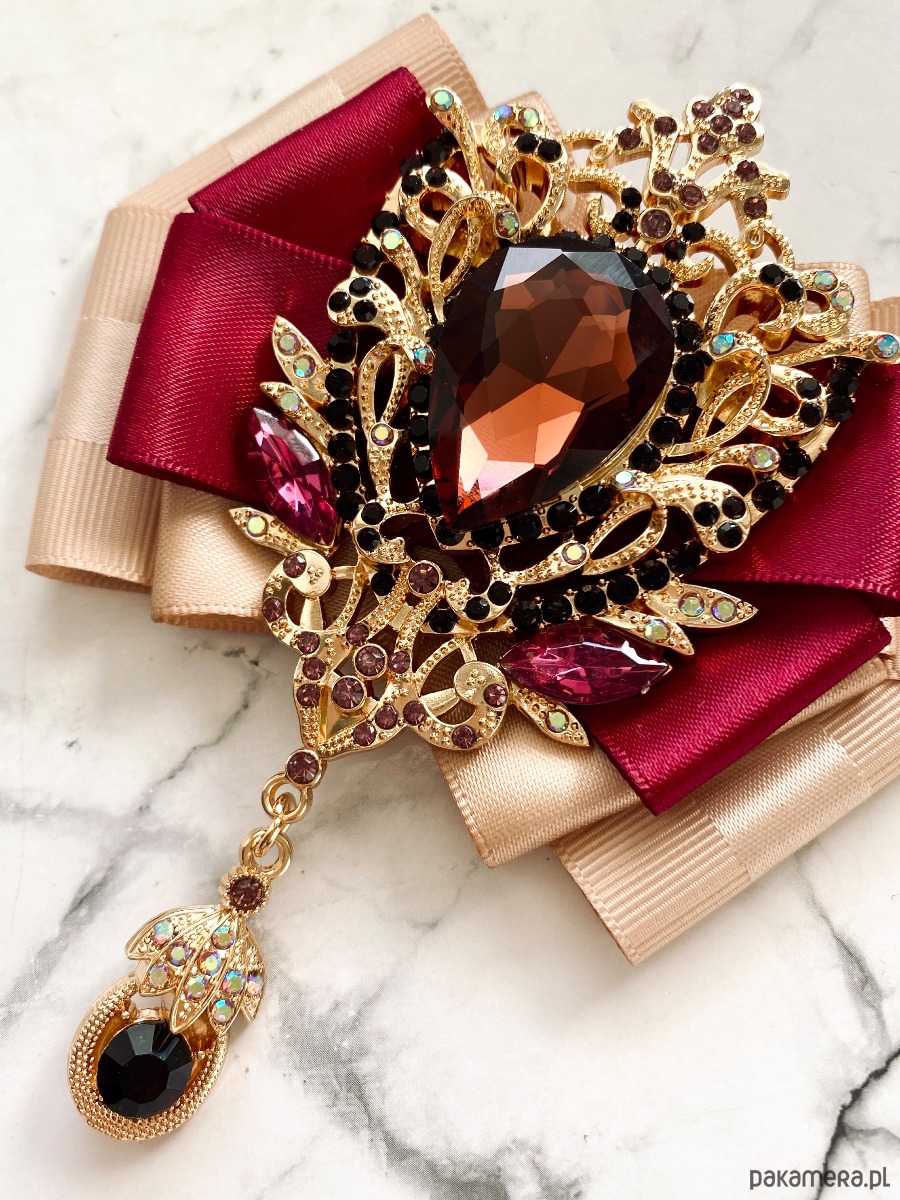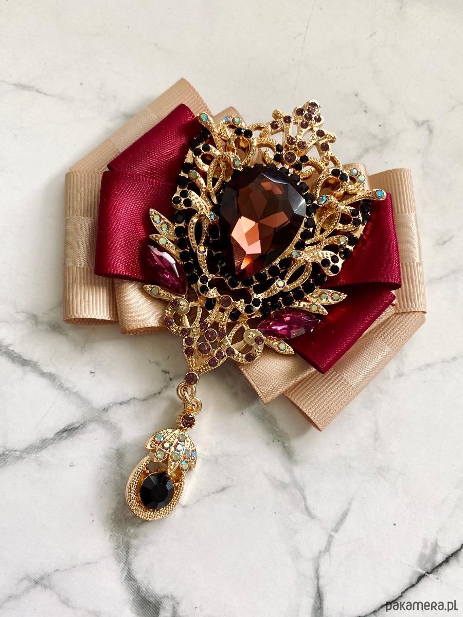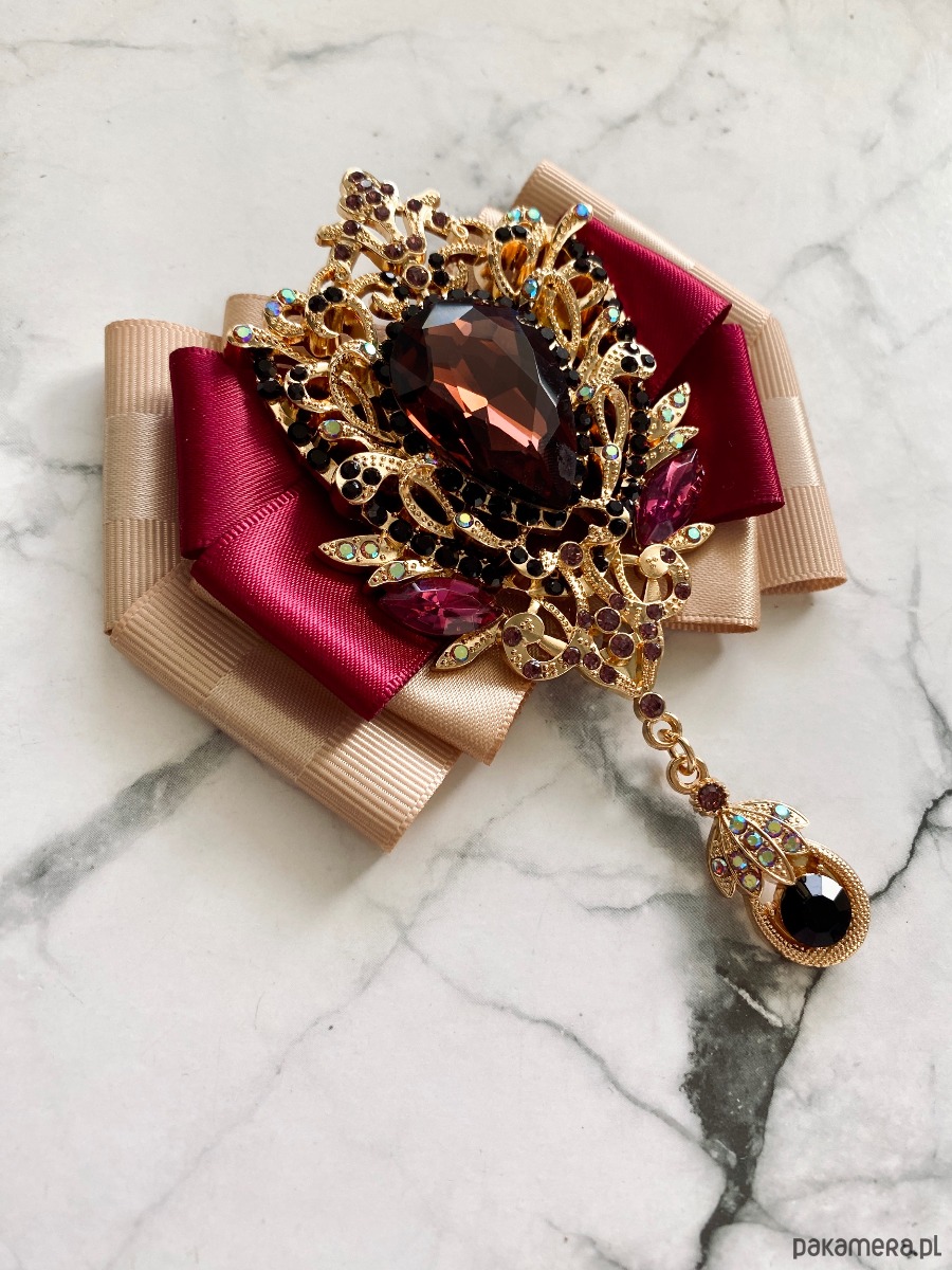 Broszka wykonana z wysokiej jakości taśm i dodatków. Brosza w kolorach szlachetnego beżu i burgundu. Na środku olbrzymia ozdoba biżuteryjna w kolorze wina pięknie szlifowany kryształ w otoczeniu mniejszych kamieni, kryształków i paciorków. Oprawa w kolorze złota.