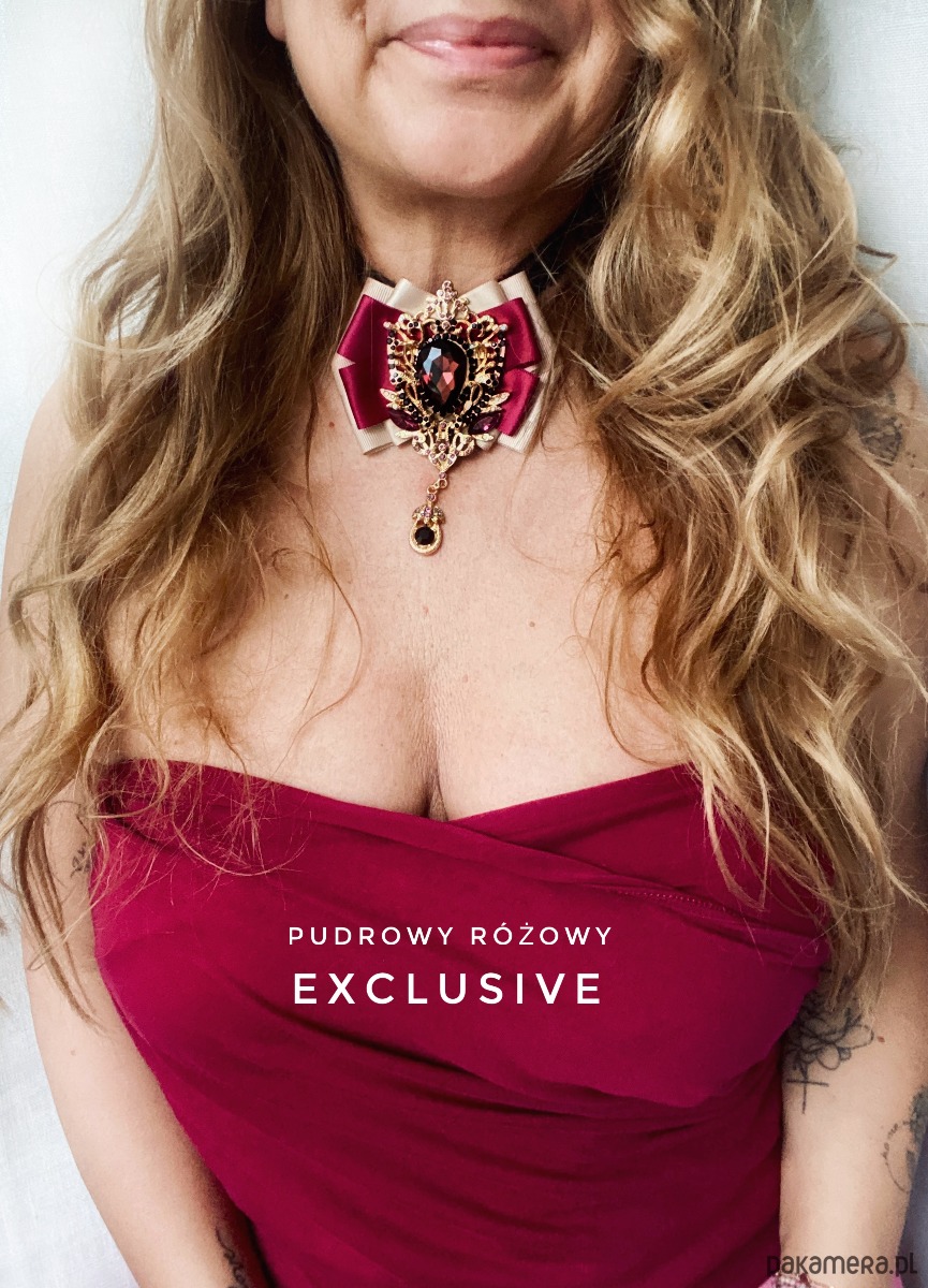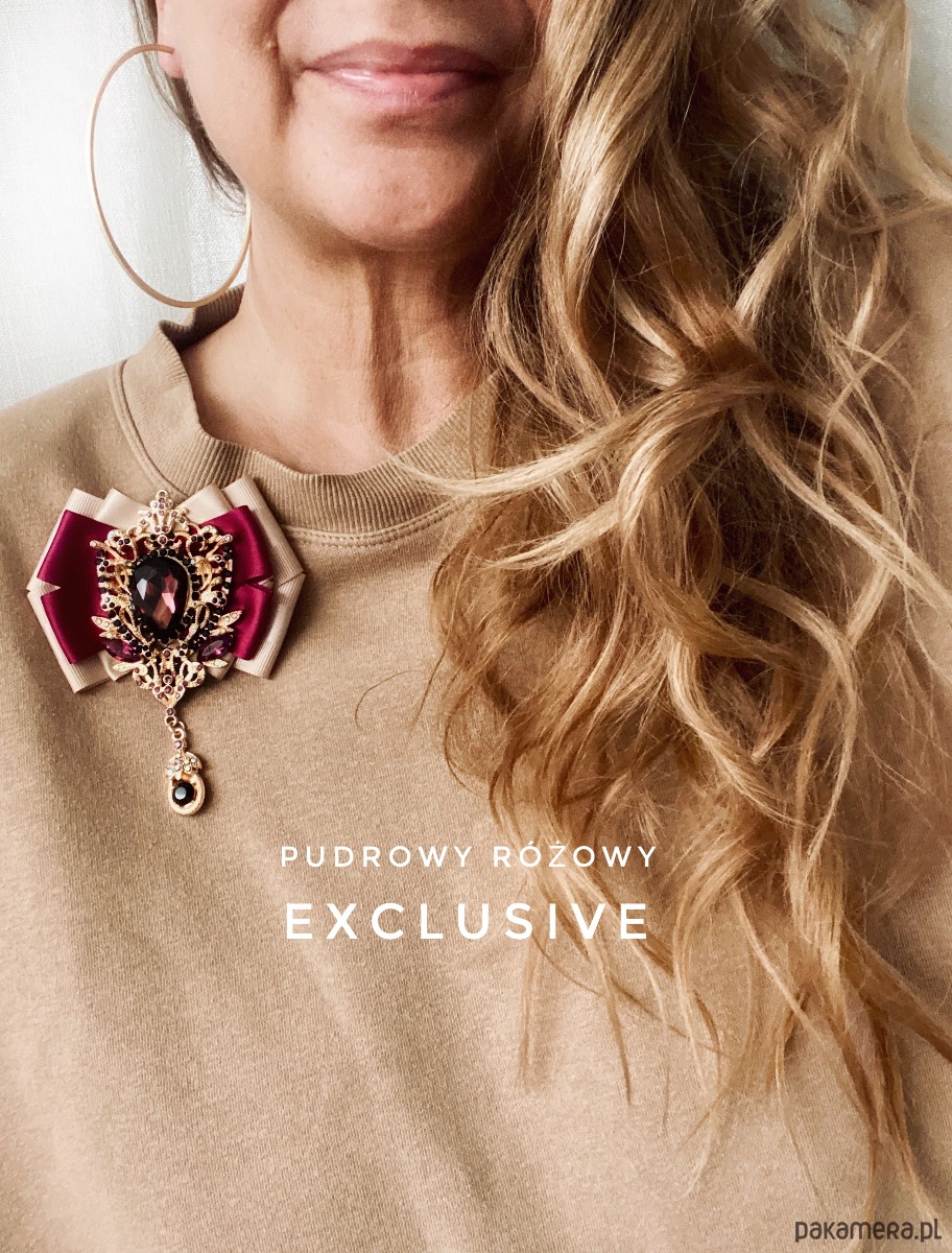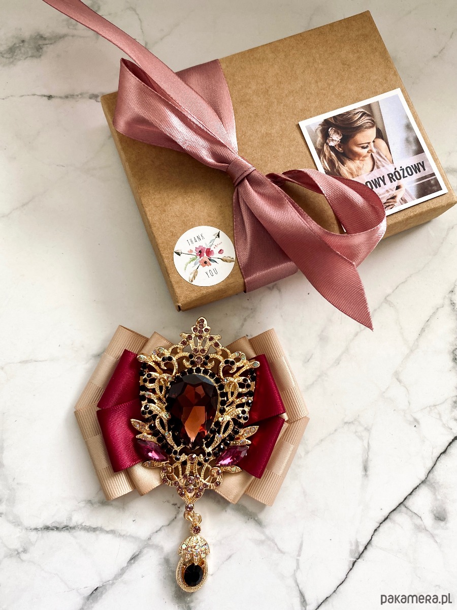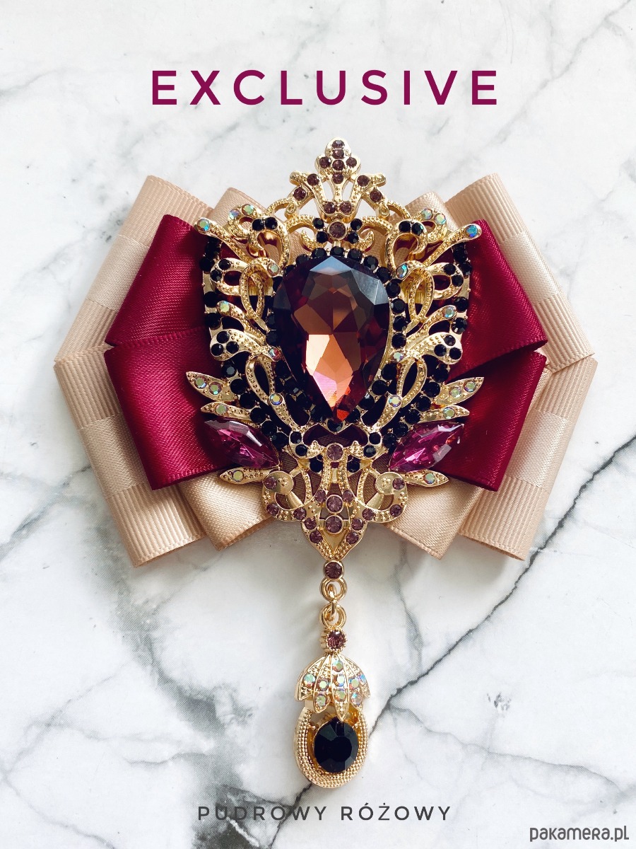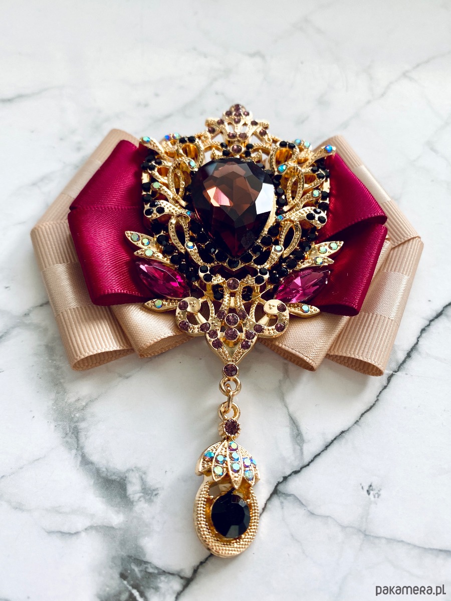 Broszka wykonana z wysokiej jakości taśm i dodatków. Brosza w kolorach szlachetnego beżu i burgundu. Na środku olbrzymia ozdoba biżuteryjna w kolorze wina pięknie szlifowany kryształ w otoczeniu mniejszych kamieni, kryształków i paciorków. Oprawa w kolorze złota.