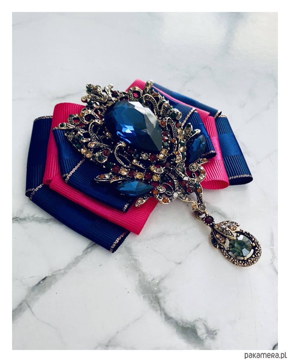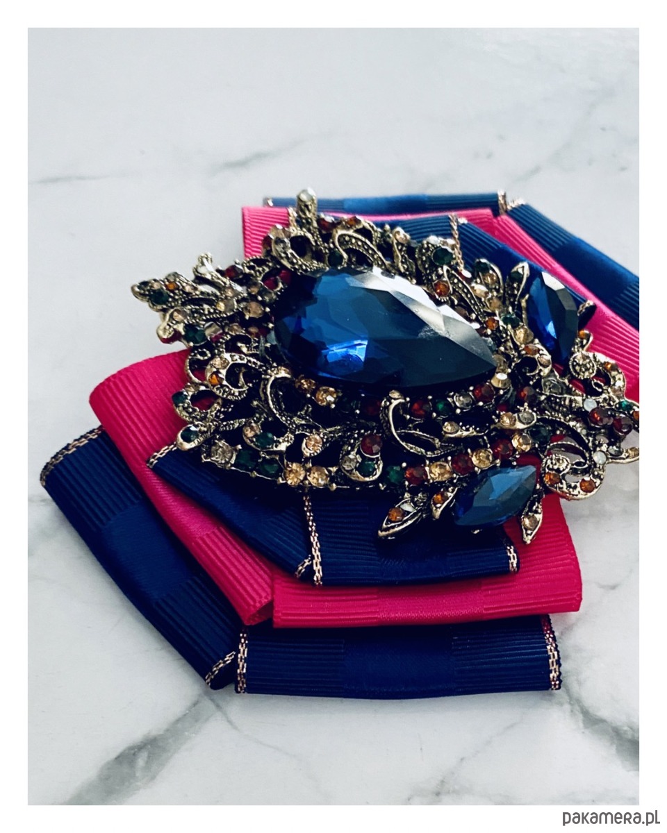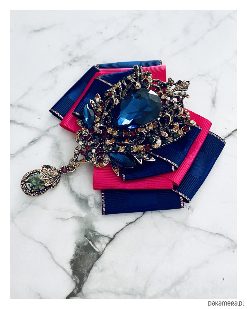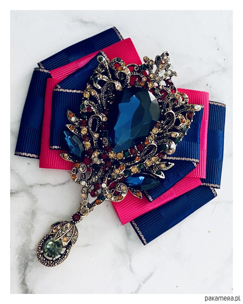 Broszka wykonana z wysokiej jakości taśm i dodatków. Brosza w kolorach szlachetnego granatu i fuksji. Na środku olbrzymia ozdoba biżuteryjna granatowy pięknie szlifowany kryształ w otoczeniu mniejszych kamieni, kryształków i paciorków. Wszystko w kolorze granatu, beżu i szarości. Oprawa w kolorze starego antycznego złota.