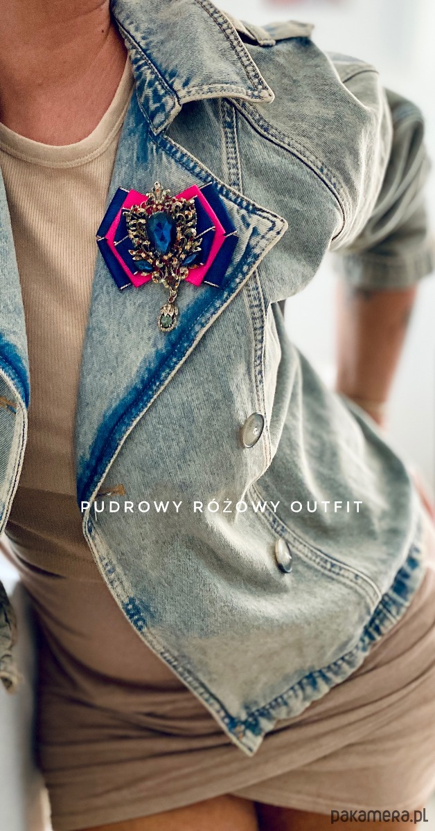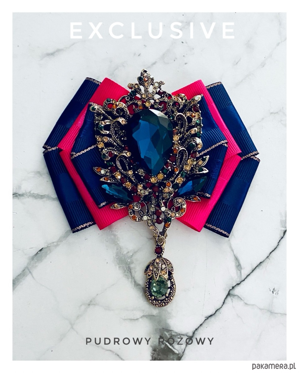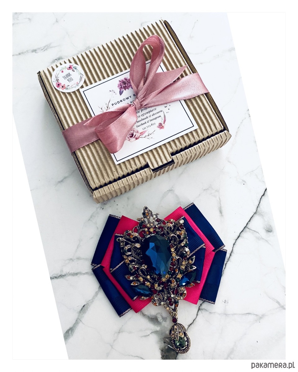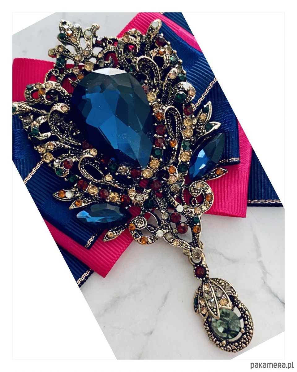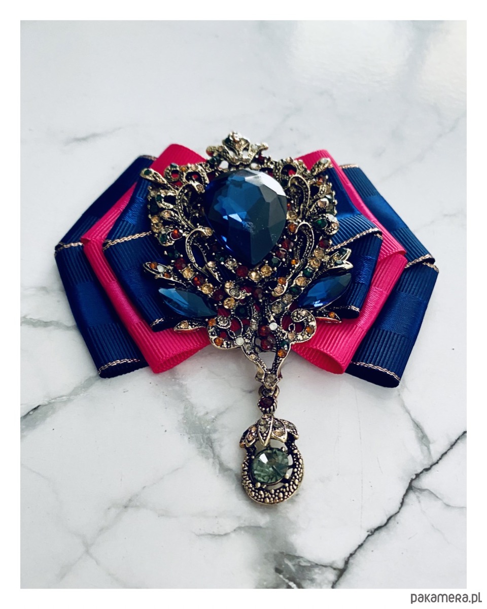 Broszka wykonana z wysokiej jakości taśm i dodatków. Brosza w kolorach szlachetnego granatu i fuksji. Na środku olbrzymia ozdoba biżuteryjna granatowy pięknie szlifowany kryształ w otoczeniu mniejszych kamieni, kryształków i paciorków. Wszystko w kolorze granatu, beżu i szarości. Oprawa w kolorze starego antycznego złota.