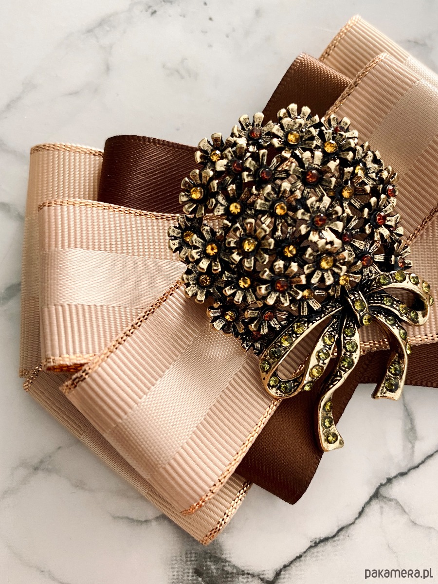 Broszka wykonana z wysokiej jakości taśm i dodatków.