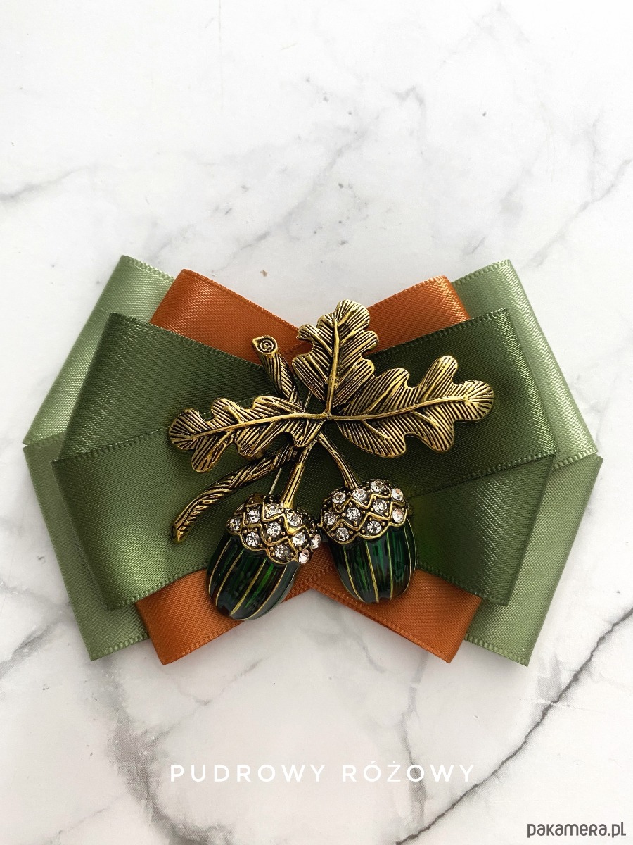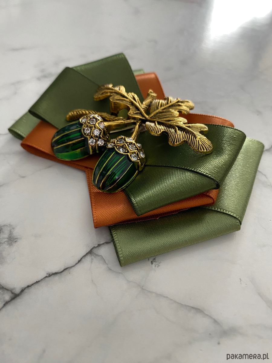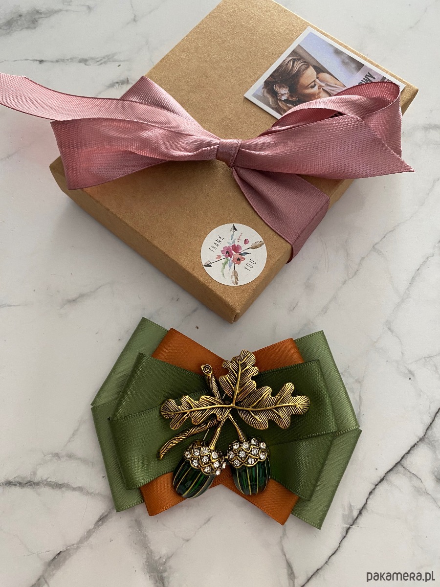 Broszka wykonana z wysokiej jakości taśm i dodatków.