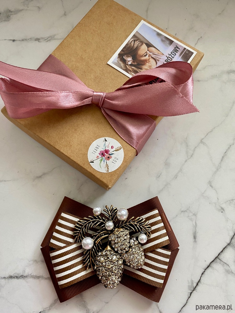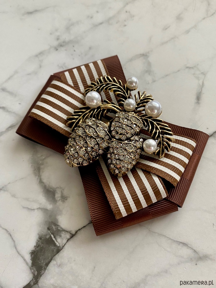 Broszka wykonana z wysokiej jakości taśm i dodatków.