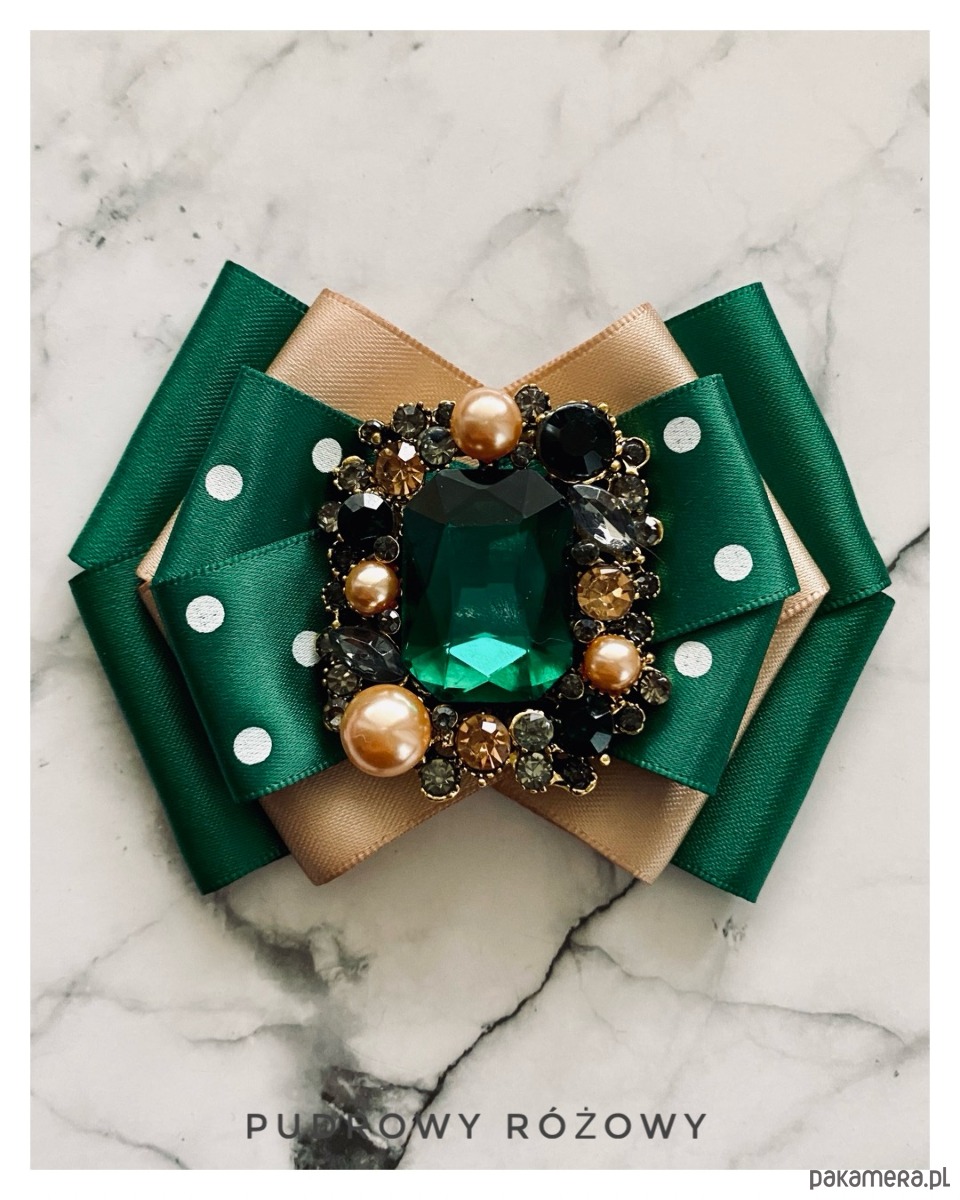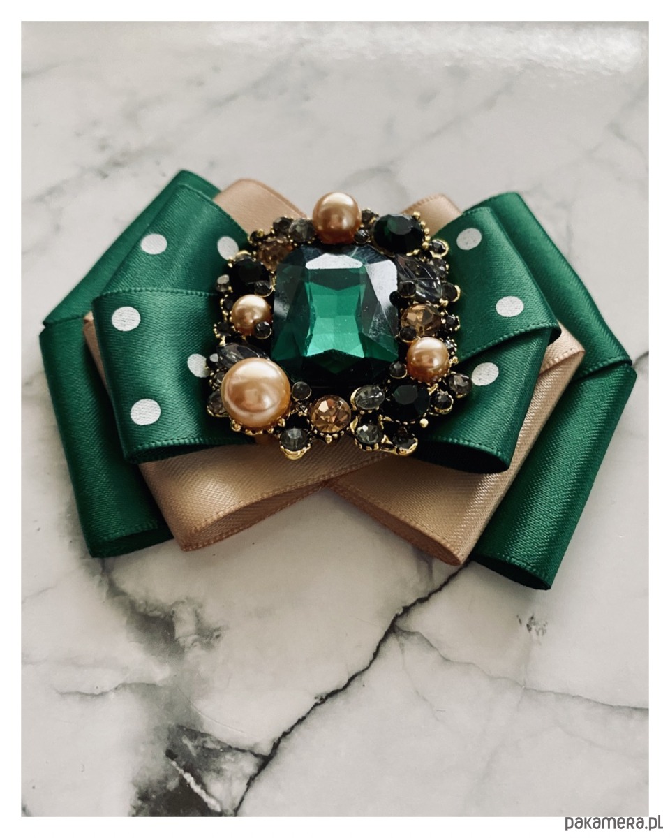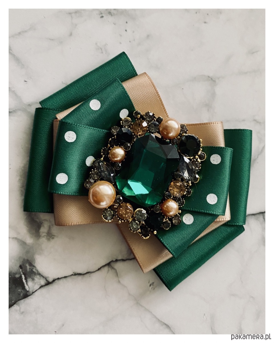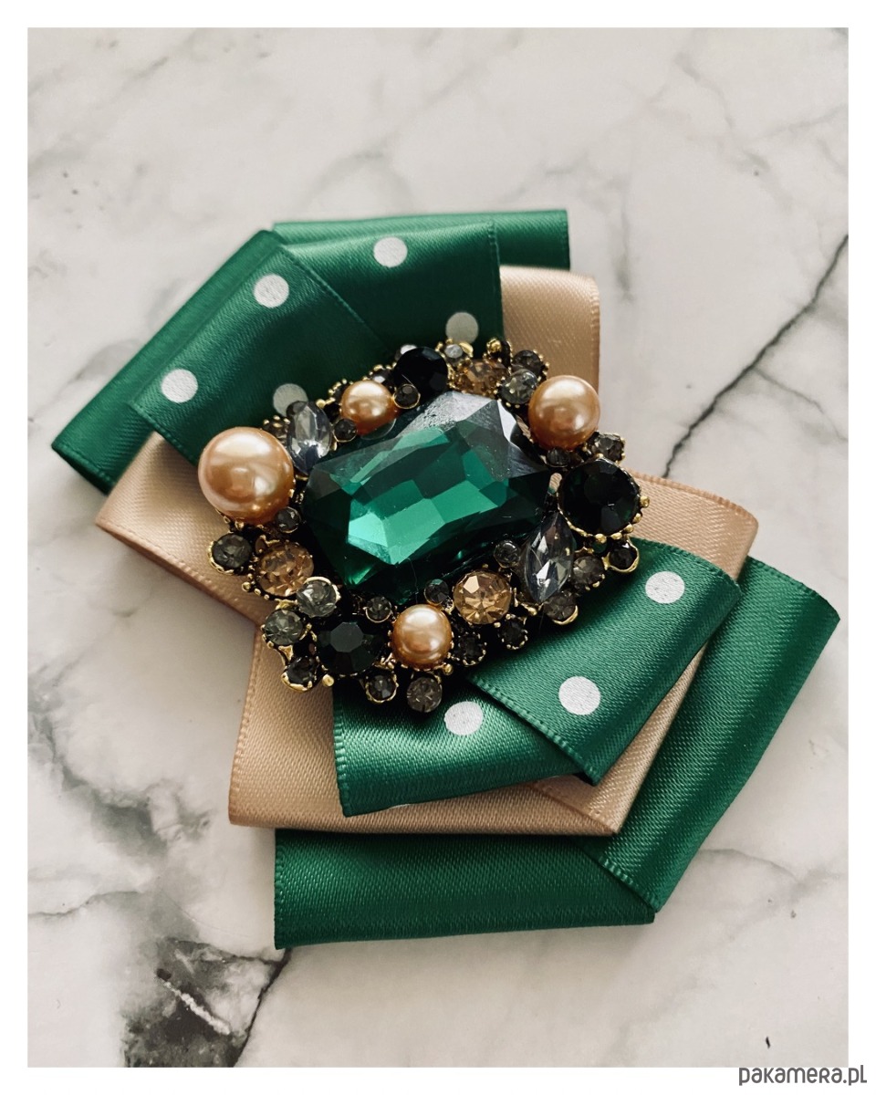 Na środku naszyta piękna ozdoba biżuteryjna. Duży kryształ w soczystym kolorze zielonym w ażurowej oprawie wysadzanej drobnymi kryształkami i perłami różnej wielkości.