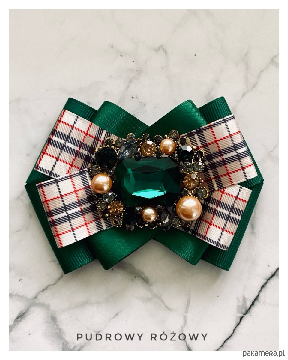 Na środku naszyta piękna ozdoba biżuteryjna. Duży kryształ w soczystym kolorze zielonym w ażurowej oprawie wysadzanej drobnymi kryształkami i perłami różnej wielkości.